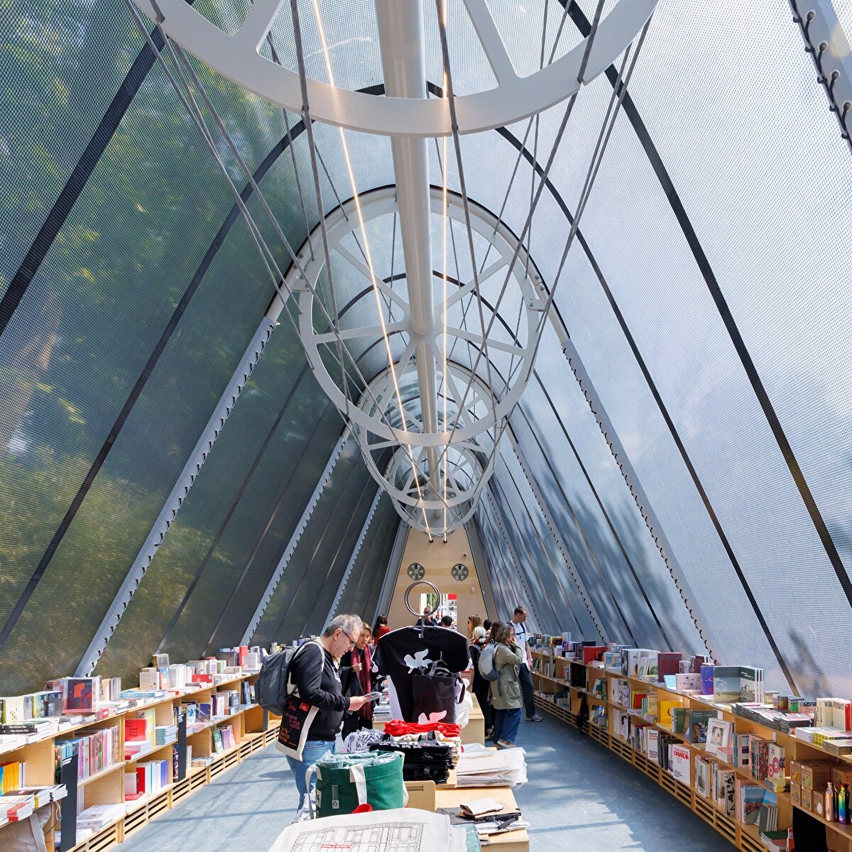 Diller Scofidio + Renfro is participating in the 2025 Venice Architecture Biennale with La Libreria, a temporary library designed as a portable and demountable public structure. This 24-metre-long lightweight structure is being developed to support the culture of reading and raise awareness of literacy. The structure achieves balance without being anchored to the ground, using books placed on a shelving system and weight elements. The high-performance architectural membrane called STFE (Structural Transparent Fluorinated Envelope) used on the facade and roof enables both the structure's transparency and portability. We see that the same material has also been used in the office's project called The Shed.