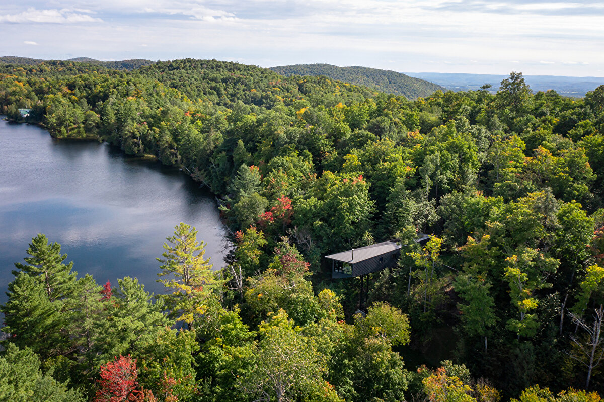 Kulübenin ayak izini en aza indirgemek isteyen Kariouk yapmış olduğu tasarımı, eğimli bir göl kenarı arsasına doğru incelen bir konsol formu ve taşıyıcı çelik bir strüktürle hayata geçiriyor. İnşaat atığının önüne geçmek isteyen ofis malzeme olarak da çapraz lamine ahşap paneller tercih ediyor.