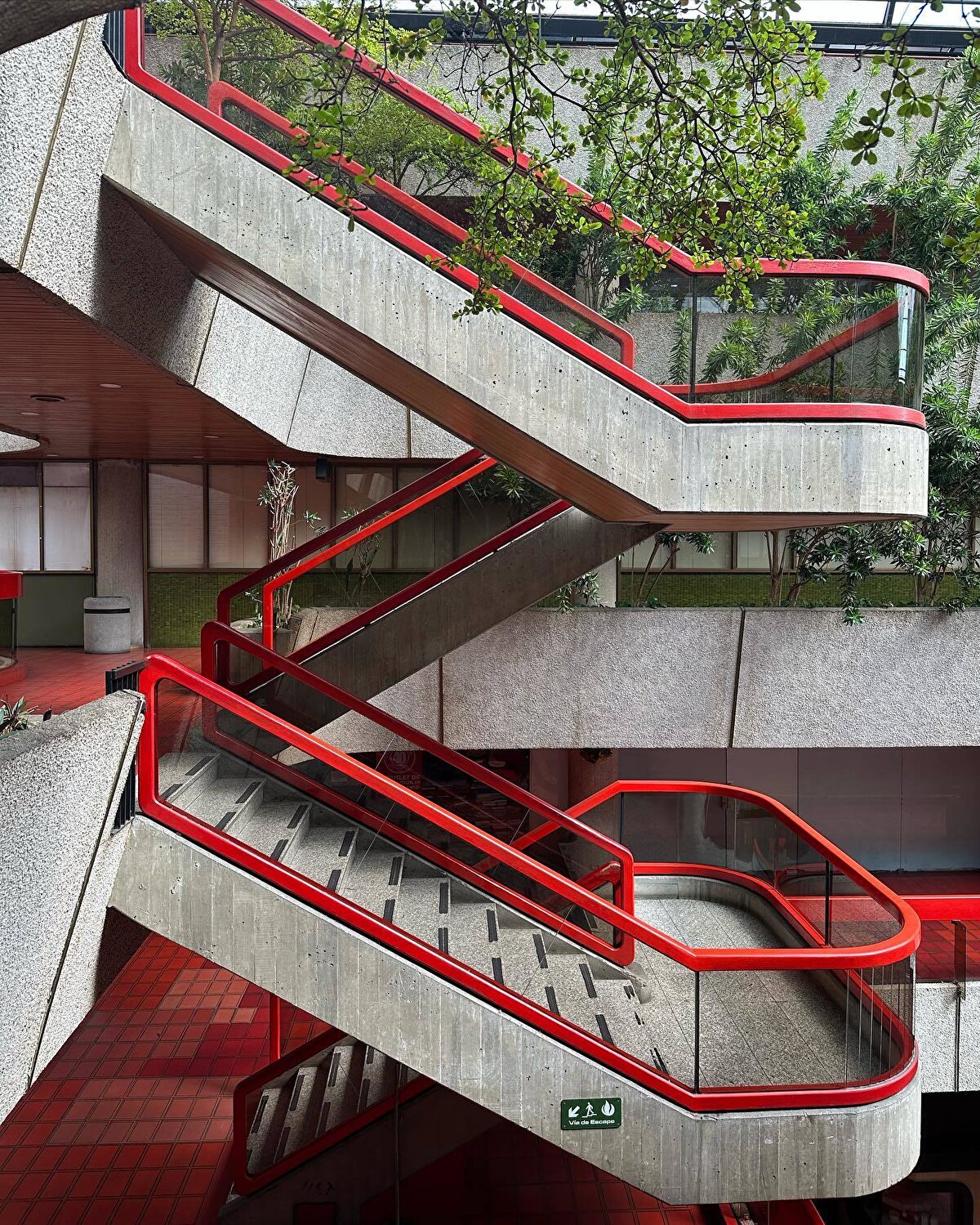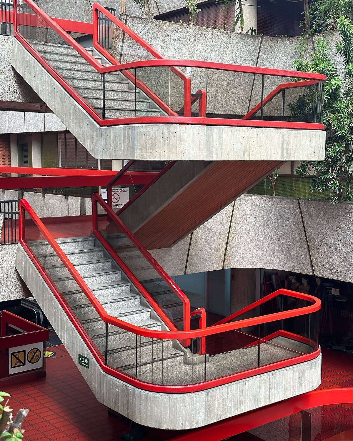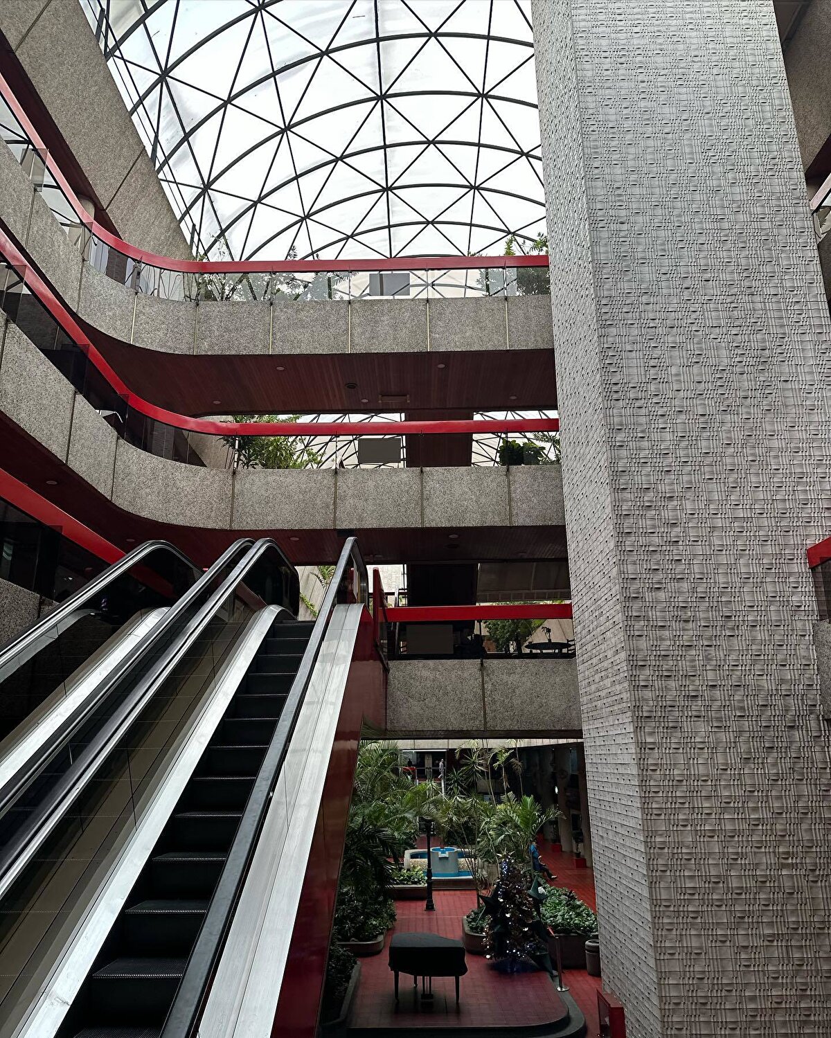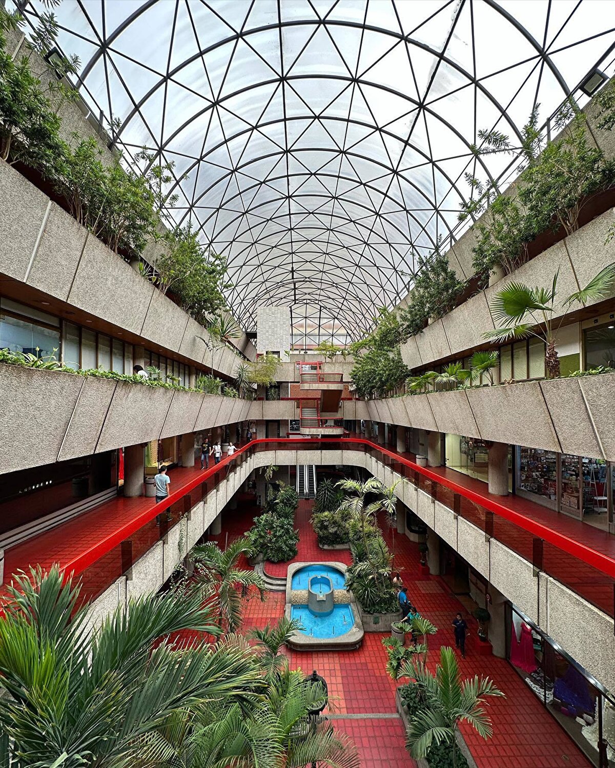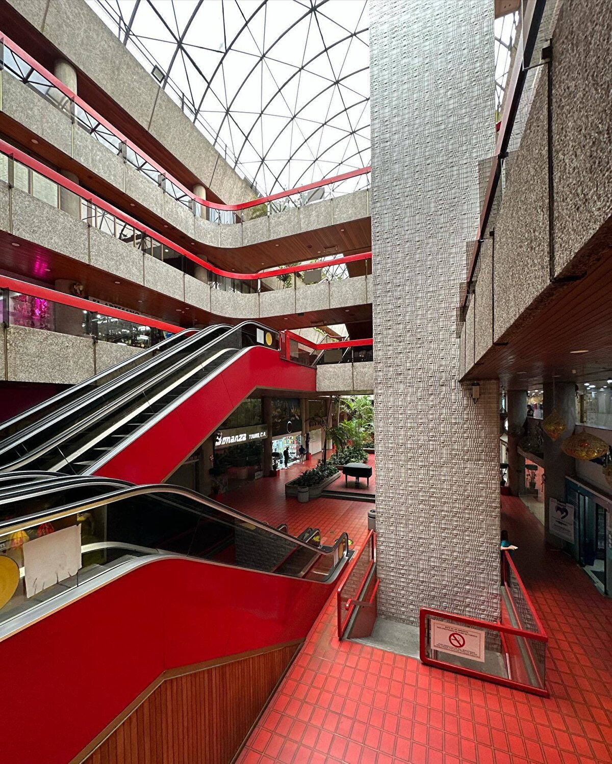 Located at the end of Las Mercedes' main avenue, this 80,000-square-meter complex includes a four-story shopping center and a hotel tower (originally designed as residential) below. Taking the idea of experiencing urban commercial life in an enclosed space, the building includes a central avenue covered by a cathedral-like wide and transparent half-cylindrical vault roof, which takes advantage of the city's sunny climate to let the sunlight in. The main part of the building consists of a patio with plants that create a sense of nature in the interior. The design is enhanced by metallic mezzanines and open porticoes. Red ceramic floor tiles, detailed railings and prominent use of brick characterize the building. In the interior of the northern commercial sector, two revolving elements, covered with mirrors and positioned at three different heights, are the work of Domingo Álvarez, born in 1935.