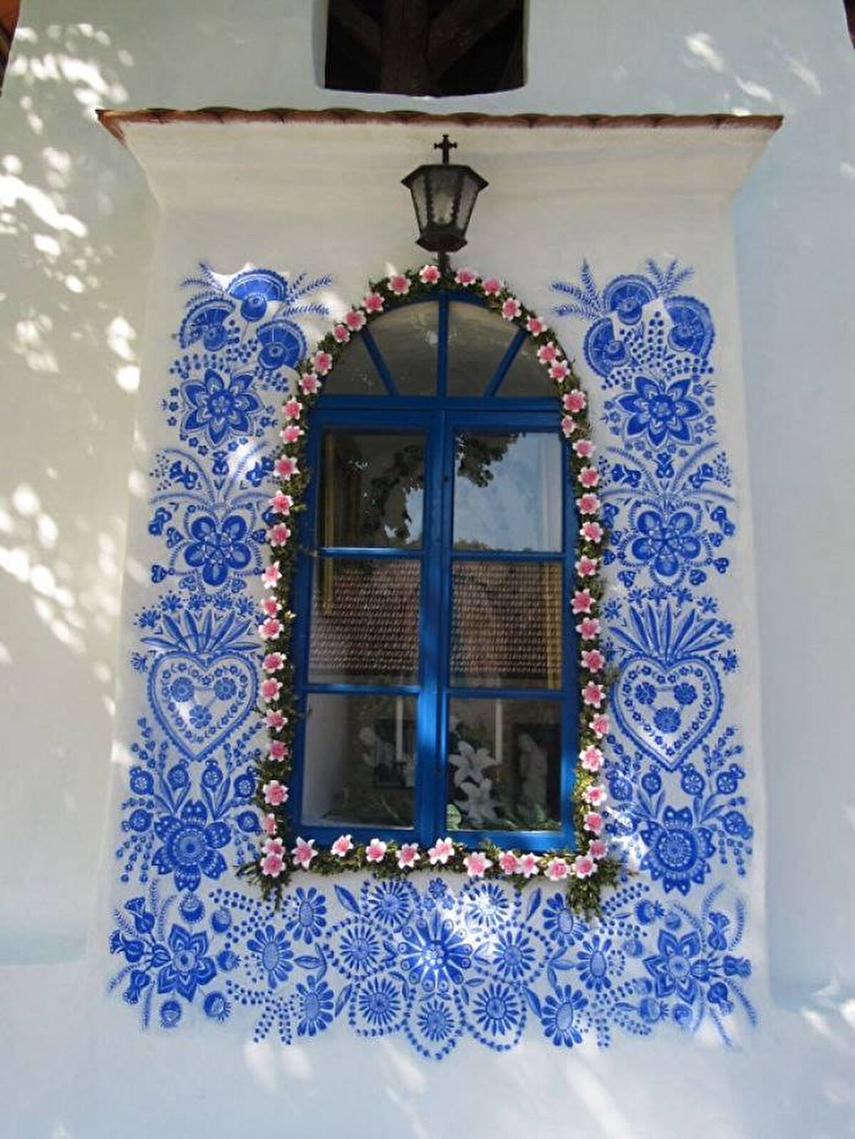 Her Mayıs ayında küçük köyün şapelini süsleyen sanatçı aynı zamanda komşularının beyaz badanalı duvarları da geleneksel Moravya motifleriyle renklendiriyor.