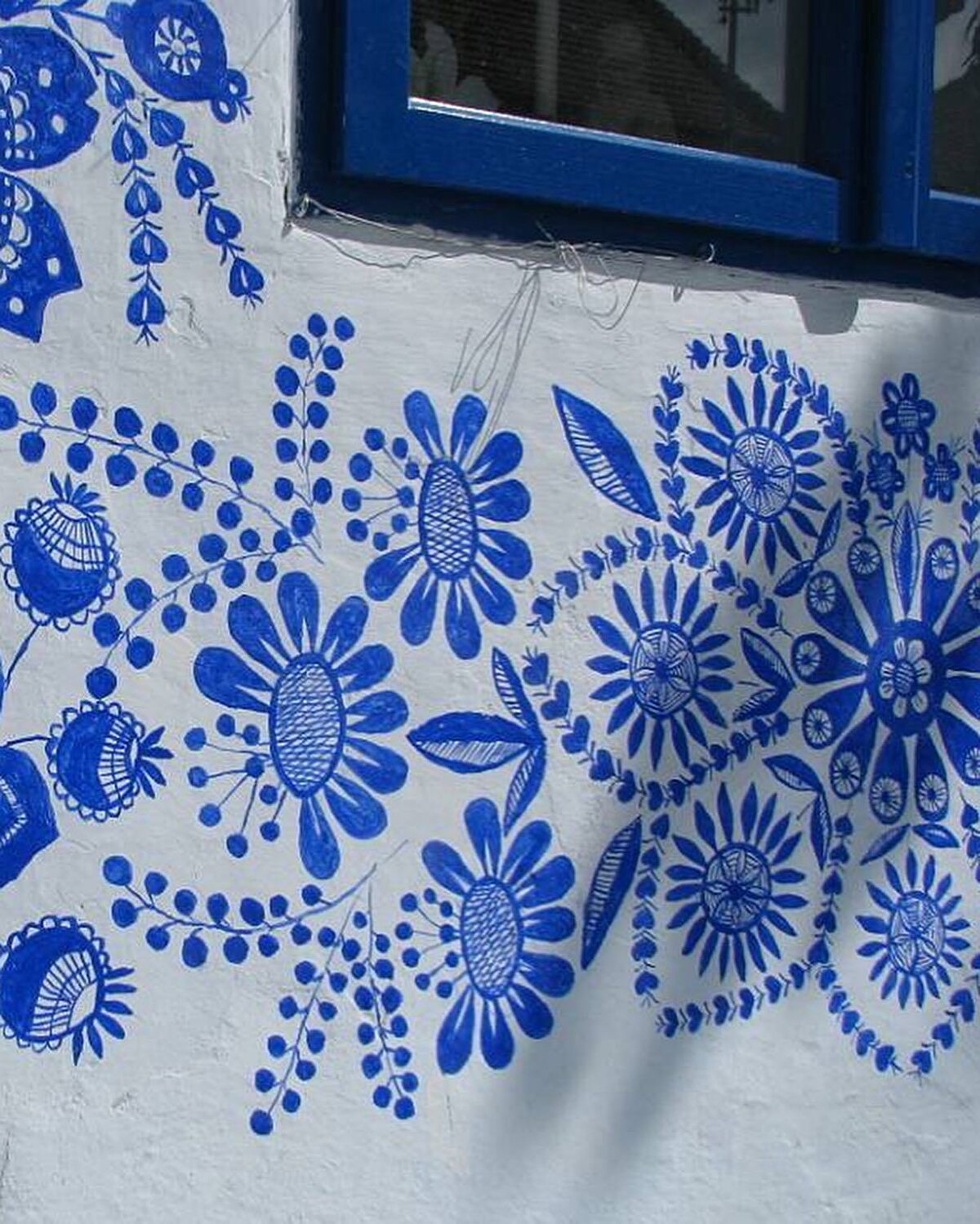 Every May she decorates the chapel in the small village, but she also colours the whitewashed walls of her neighbours with traditional Moravian motifs.