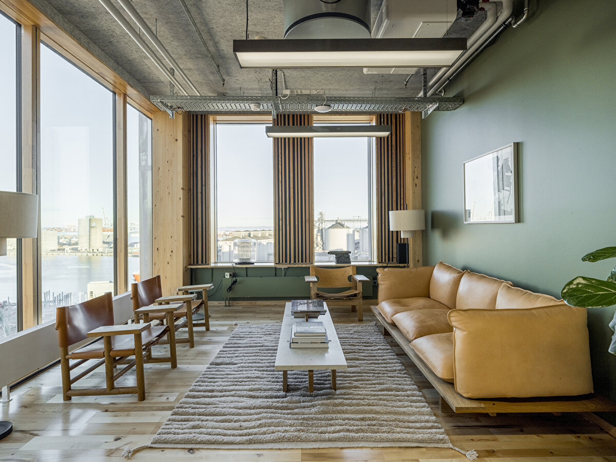 İç mekânlarda kullanılan yeniden işlenmiş ahşap yüzeyler ve tekstil bazlı akustik paneller, biyojenik ve döngüsel malzemelerin mekânsal karakteri nasıl tanımladığını gösteriyor. Üst katlarda yer alan “Yaşam Laboratuvarı" bölümleri ise farklı malzeme ve detay çözümlerinin uygulamalı olarak geliştirilebildiği esnek çalışma ortamları sunuyor.