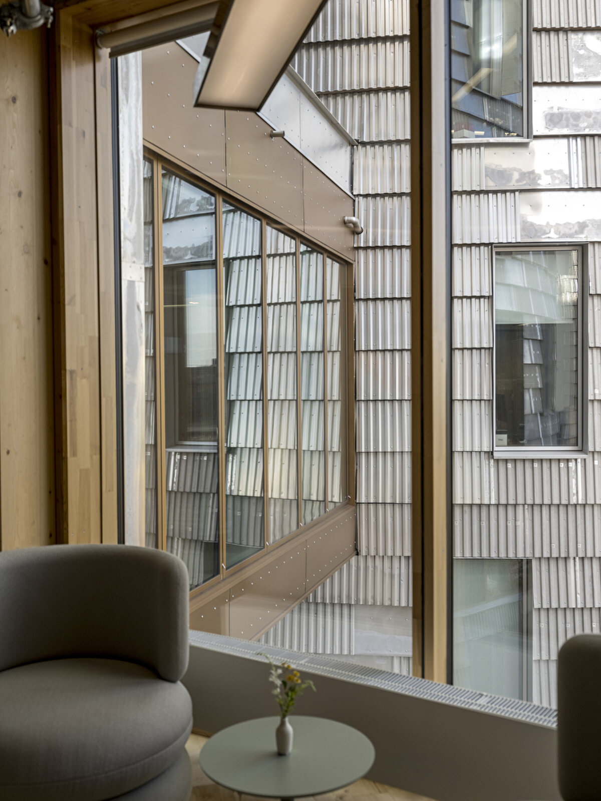 The reprocessed wood surfaces and textile-based acoustic panels used in the interiors demonstrate how biogenic and circular materials define the spatial character. The “Living Laboratory" sections on the upper floors offer flexible working environments where different material and detail solutions can be developed in practice.