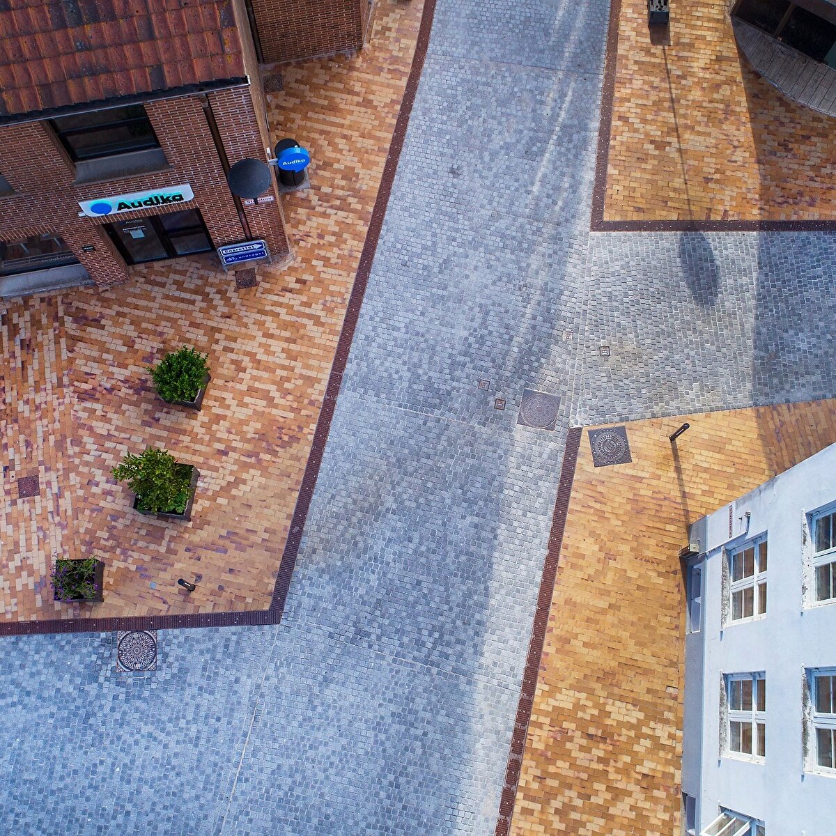The redevelopment project for Aabenraa city centre was designed by ADEPT and Topotek 1 in 2018. The work presents a holistic spatial concept by bringing together the different needs of public life on a single ground plane. Contemporary language and continuity are achieved by utilising local materials and colour palettes in the surface designs.
