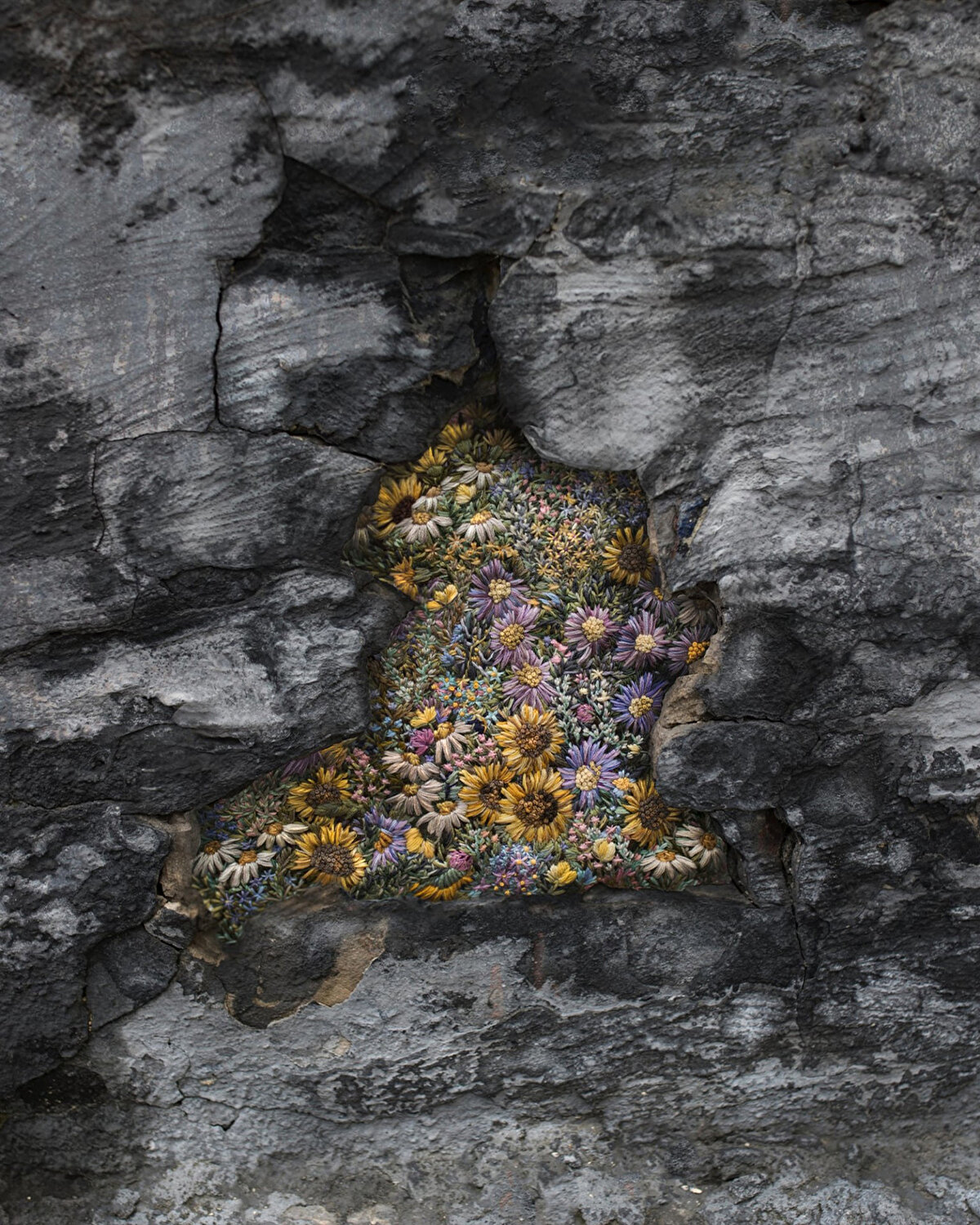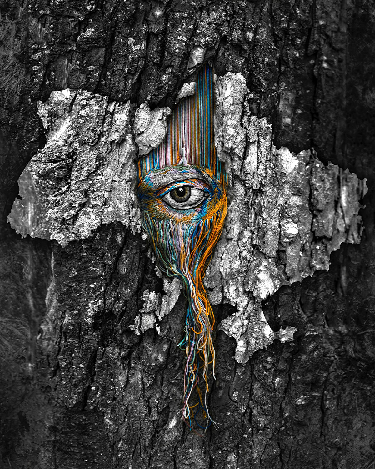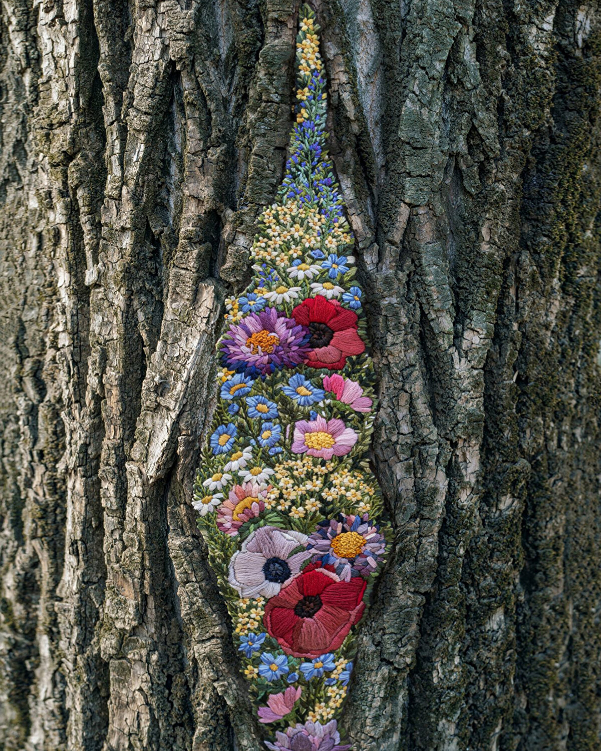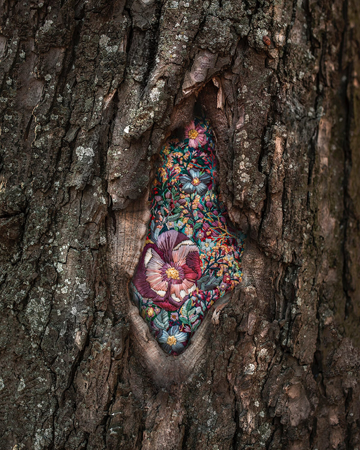 Ukraynalı sanatçı @diana.yevtukh, ağaç oyuklarına renkli iplerden yapılmış çiçek desenleri yerleştiriyor.