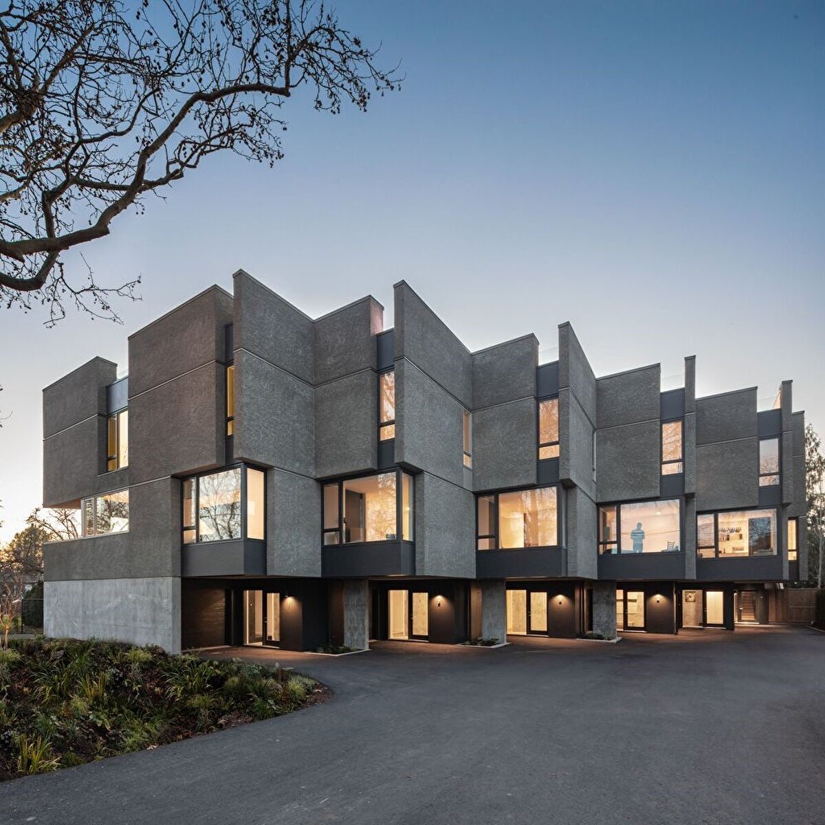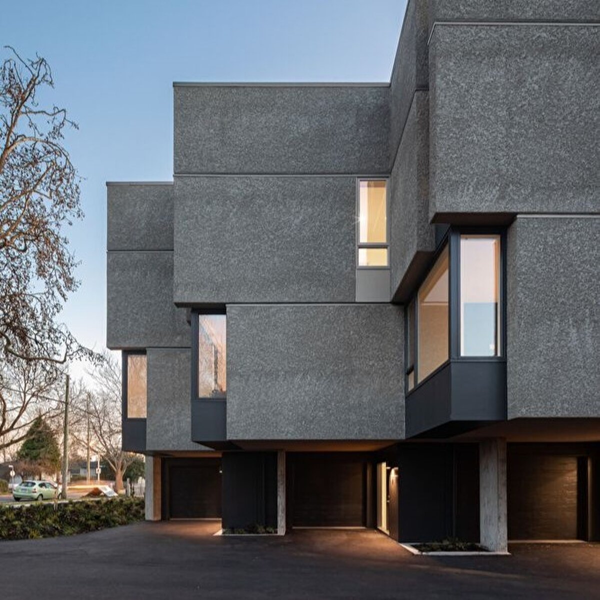 Mahremiyete öncelik veren tasarımda, kalın dokulu, sıvalı yan duvarlar ve derin pencere açıklıkları dikkat çekiyor. Balkonlar ve küçük pencereler, komşular arasındaki görünürlüğü en aza indirirken, geniş sürgülü kapılar ve gömülü pencereler hem iç mekâna ışık sağlıyor hem de dış dünyadan koruma sağlıyor. Her evin çatı güvertesi, yaz aktiviteleri ve açık hava keyfi için mahrem bir dış alan olarak tasarlanıyor.