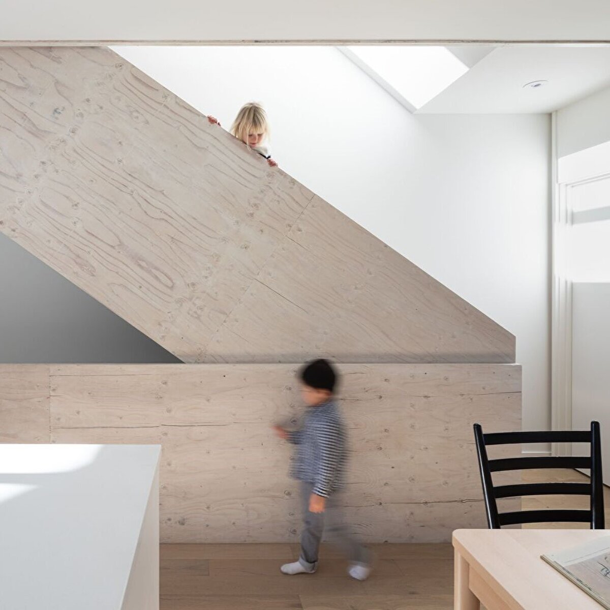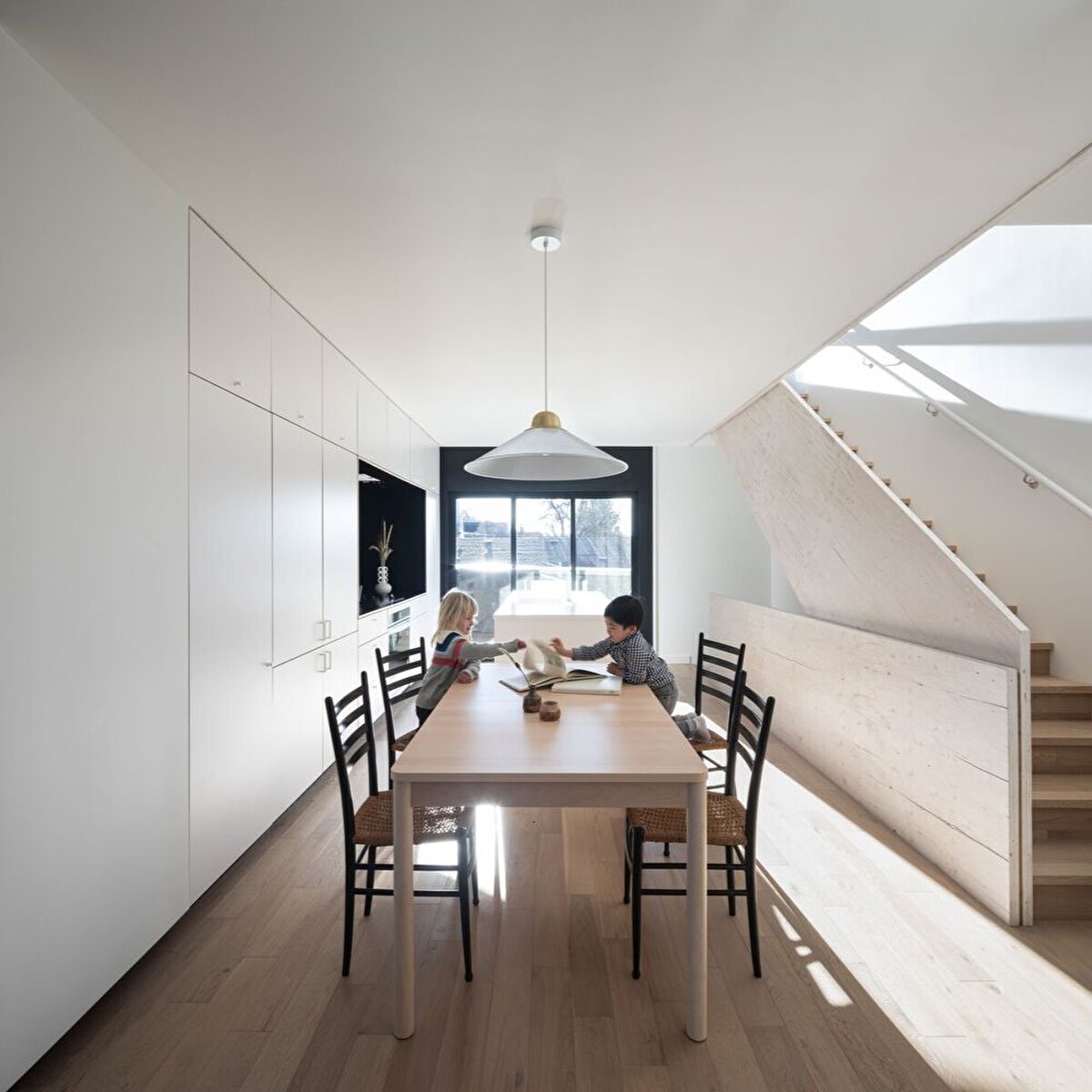 İç mekânlar, sade bir malzeme paletiyle işlevsel ve sıcak bir atmosfer oluşturuyor. Beyaz yüzeyler ve siyah ahşap detaylarla birlikte, çocuklara aktivite olması için mıknatıs görevi gören çelik sütunlar gibi eğlenceli dokunuşlar bulunuyor. Banyolar ise estetikle pratikliği bir araya getiriyor.