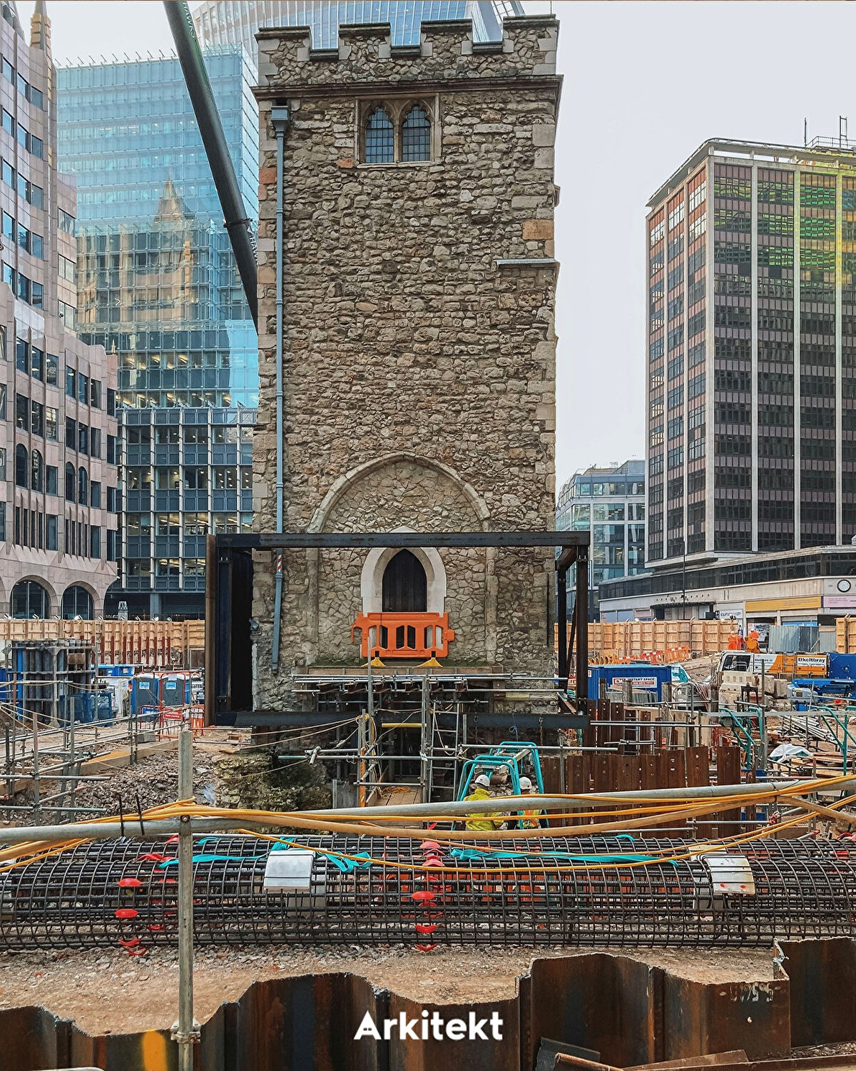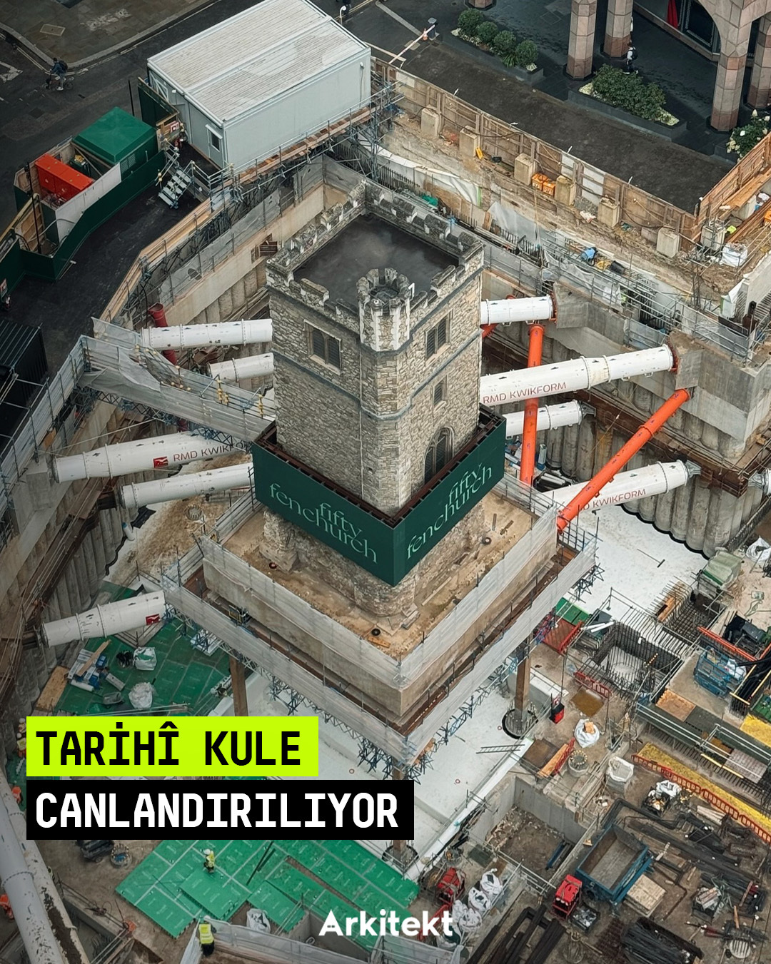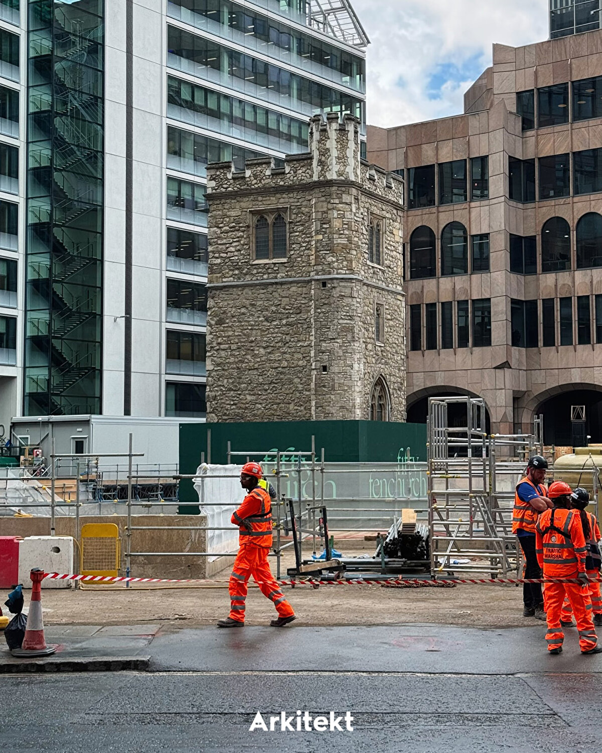 2028 yılında tamamlanması beklenen 50 Fenchurch Street projesi, Eric Parry Architects tarafından tasarlanıyor. Bölgenin eski yapılarından biri olan All Hallows Staining Kulesi korunarak projeye dahil ediliyor. Kule, 1666'daki Büyük Londra Yangını'nda yıkılan kiliseden günümüze kalan tek bölüm olarak öne çıkıyor ve bugün şantiye alanındaki temel çalışmalarının üzerinde geçici desteklerle ayakta duruyor. Projede, Lambe's Chapel Crypt'in yeni konumuna taşınarak halkın ziyaretine açılması öngörülüyor. - The 50 Fenchurch Street development, scheduled for completion in 2028, is being designed by Eric Parry Architects. The All Hallows Staining Tower, one of the area's historic structures, is being preserved and integrated into the project. The tower stands out as the only surviving part of the church destroyed in the Great Fire of London in 1666 and currently remains supported by temporary structures above the site's foundation works. The project also envisions relocating Lambe's Chapel Crypt to a new site, where it will be open to public visitation.