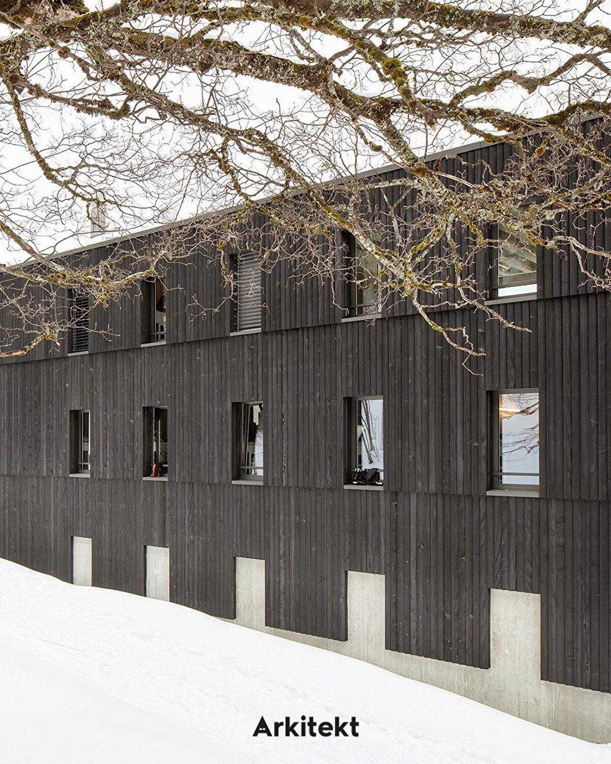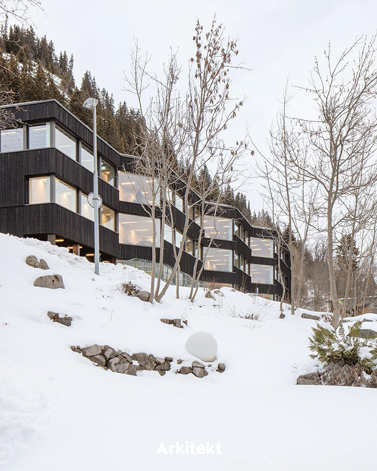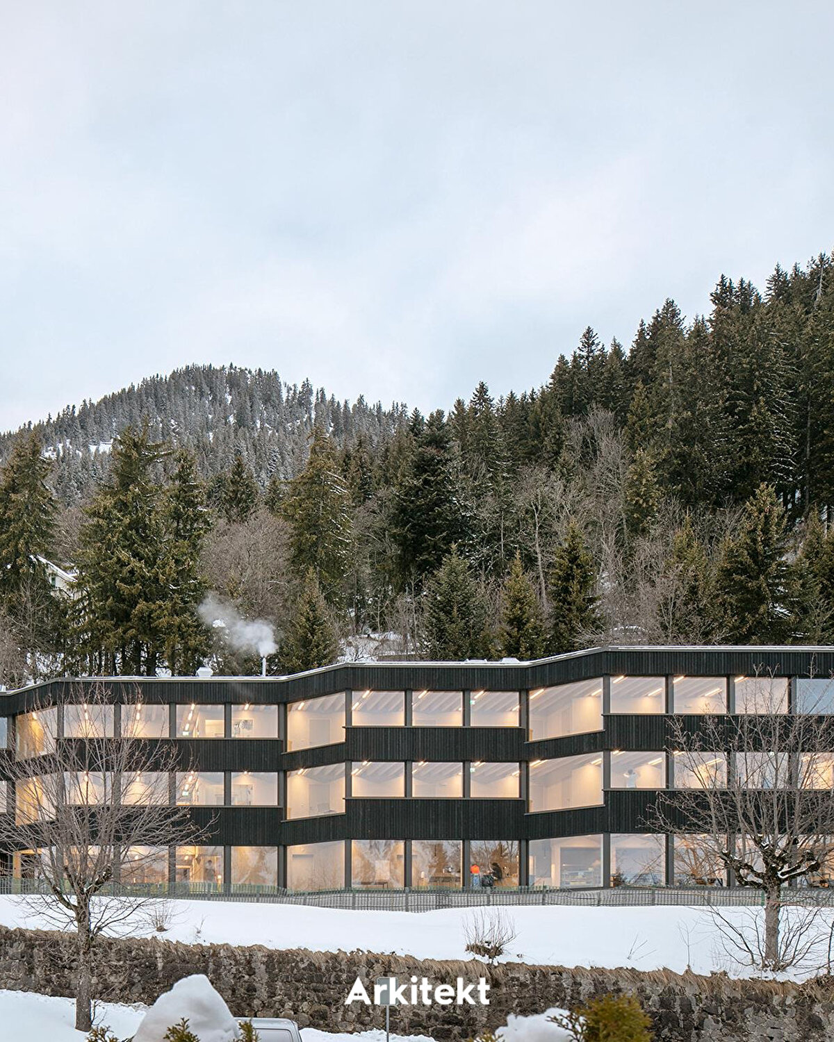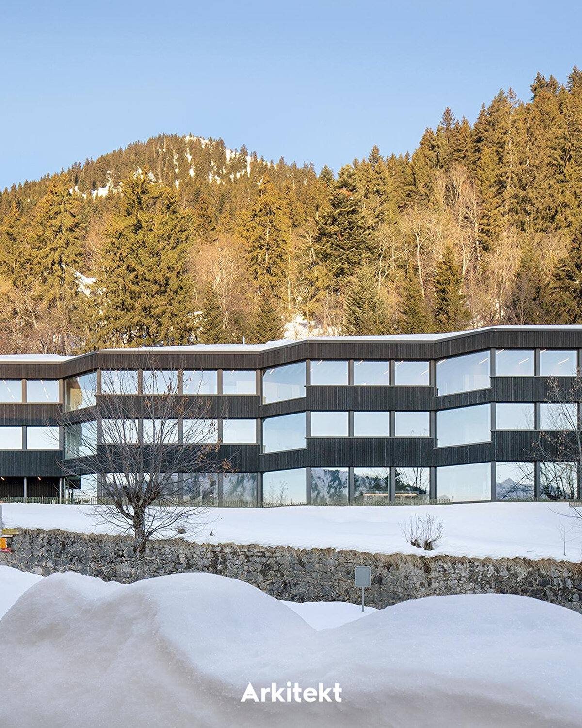 Located in Leysin, on the slopes of the Vaud Alps, the Alp Education Center “Les Cabris" by @maa_at_work establishes a direct relationship with the landscape, light, and environmental context through its linear massing and glass corridor. The wide circulation axis on the south side allows sunlight to enter while creating a permeable interior space band for social interaction, group activities, and shared use. The rooms on the north side, with their proximity to the forest edge, offer a more tranquil, private, and introverted spatial experience. Leaving the wooden structural system exposed in the interior reveals the building's construction, creating a simple yet legible spatial character.