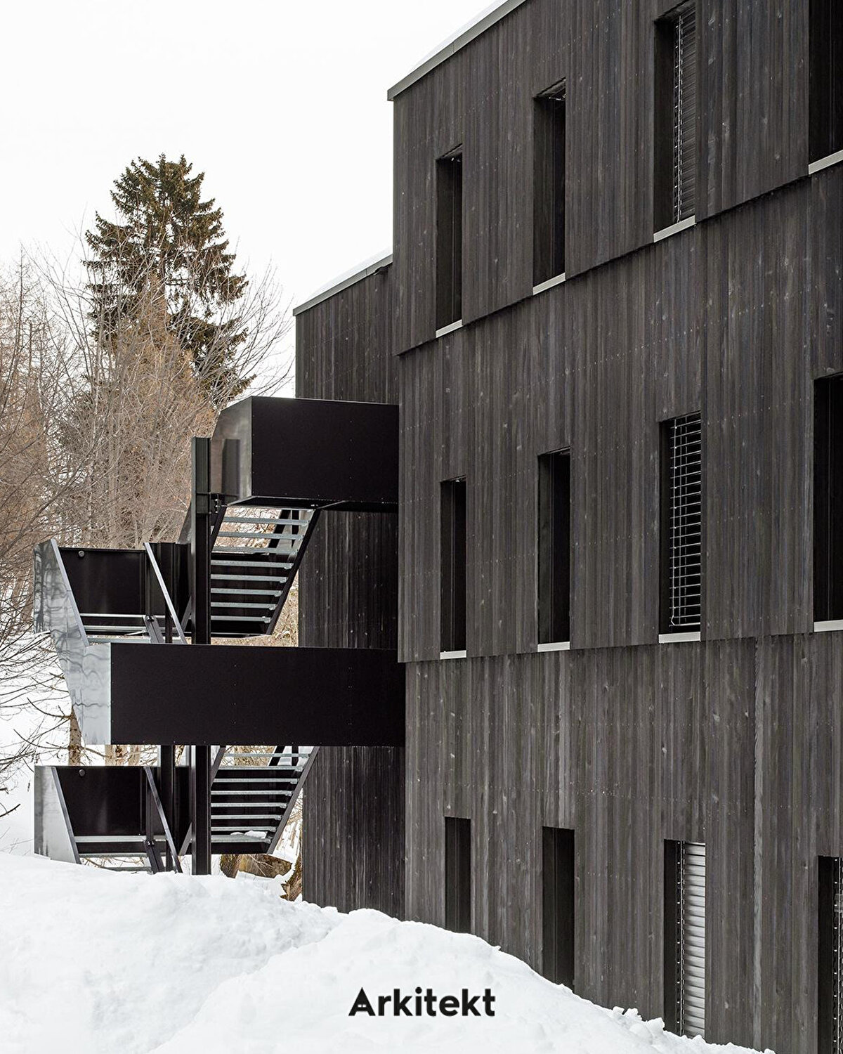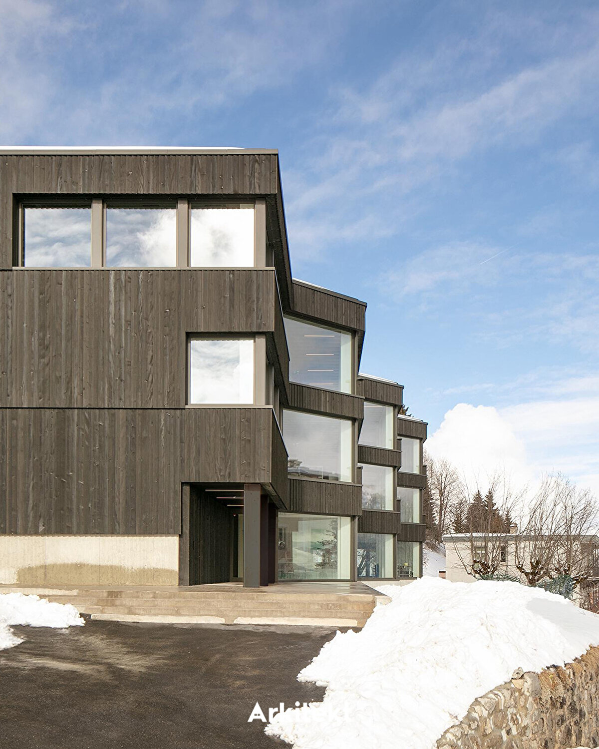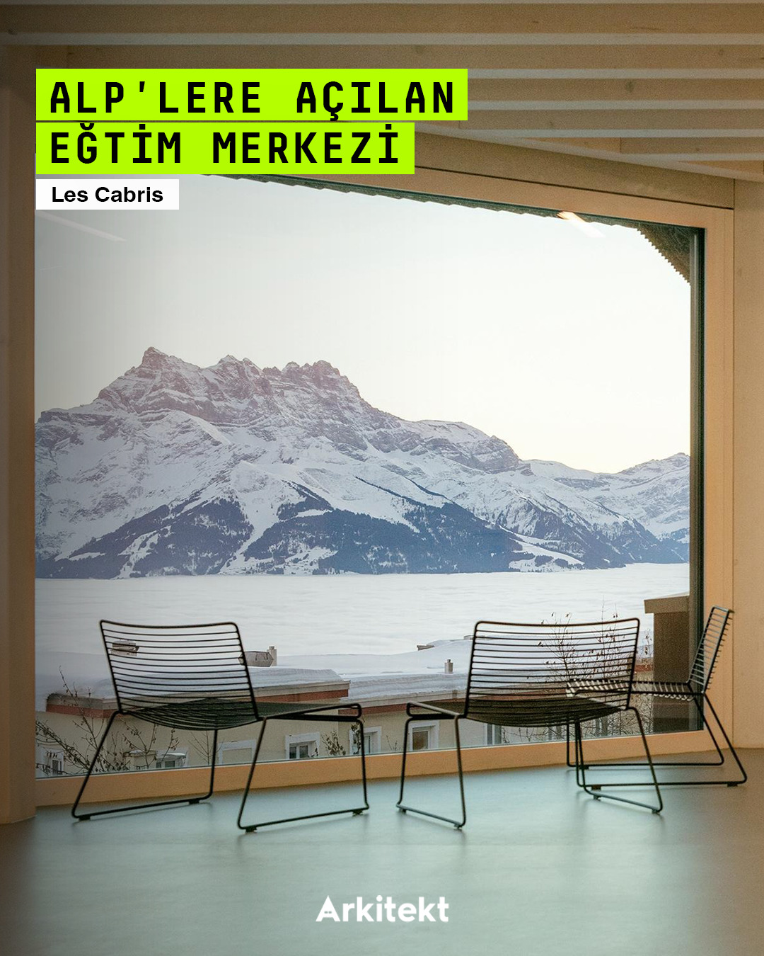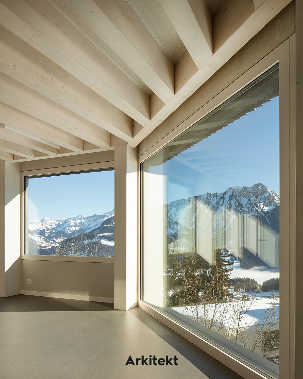 Located in Leysin, on the slopes of the Vaud Alps, the Alp Education Center “Les Cabris" by @maa_at_work establishes a direct relationship with the landscape, light, and environmental context through its linear massing and glass corridor. The wide circulation axis on the south side allows sunlight to enter while creating a permeable interior space band for social interaction, group activities, and shared use. The rooms on the north side, with their proximity to the forest edge, offer a more tranquil, private, and introverted spatial experience. Leaving the wooden structural system exposed in the interior reveals the building's construction, creating a simple yet legible spatial character.