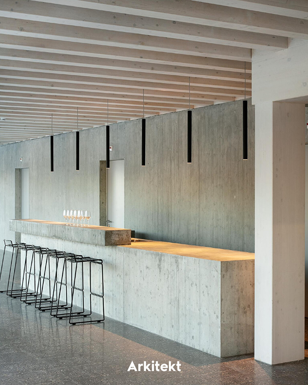 The use of concrete foundations combined with local timber, due to avalanche load conditions, provides the building with a balanced approach in terms of both durability and sustainability. The dark-toned, overlapping wooden cladding used on the exterior harmonizes with its surroundings through the interplay of light and shadow, creating an appearance that references the aged mountain structures in the region. Inside, light-colored wood, Rhône pebble terrazzo flooring, and aggregate concrete surfaces offer a calm, simple, and balanced material palette.