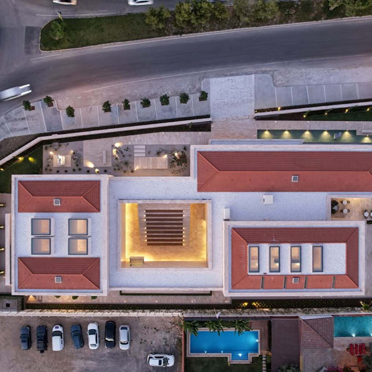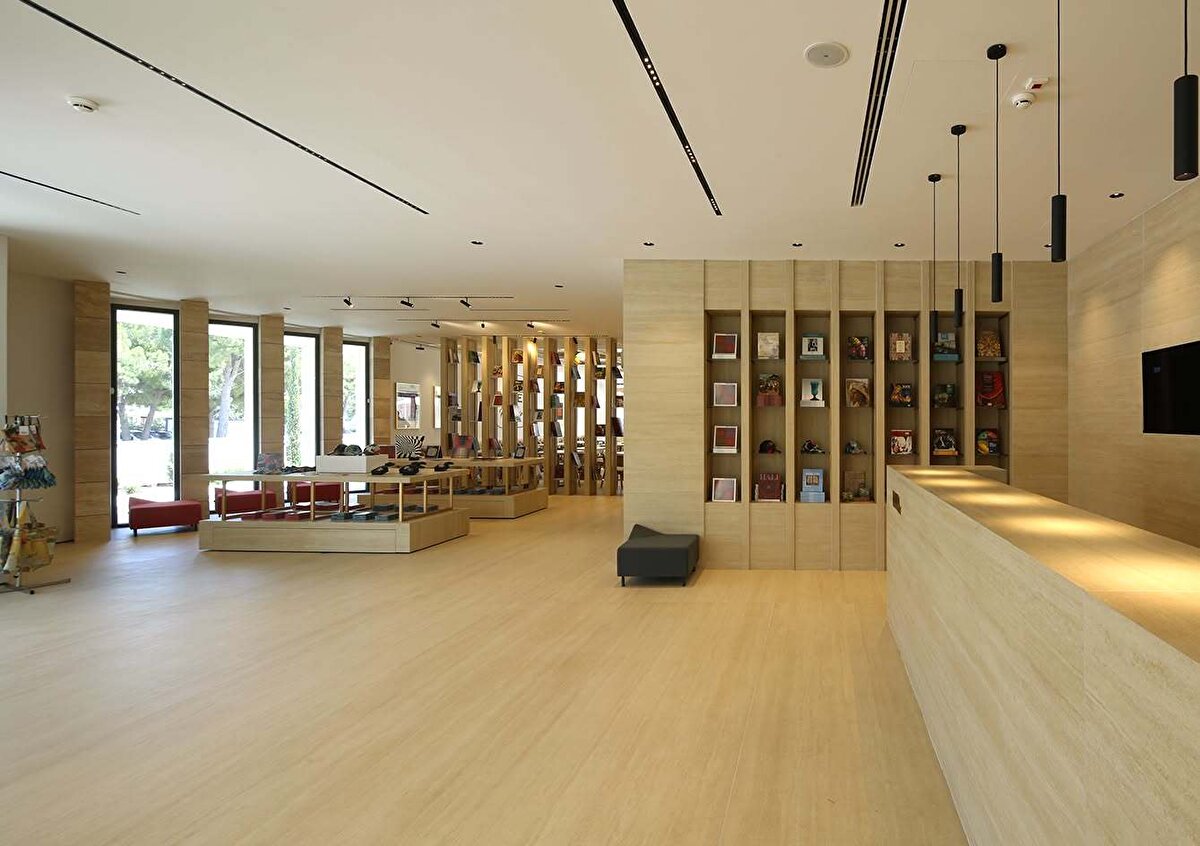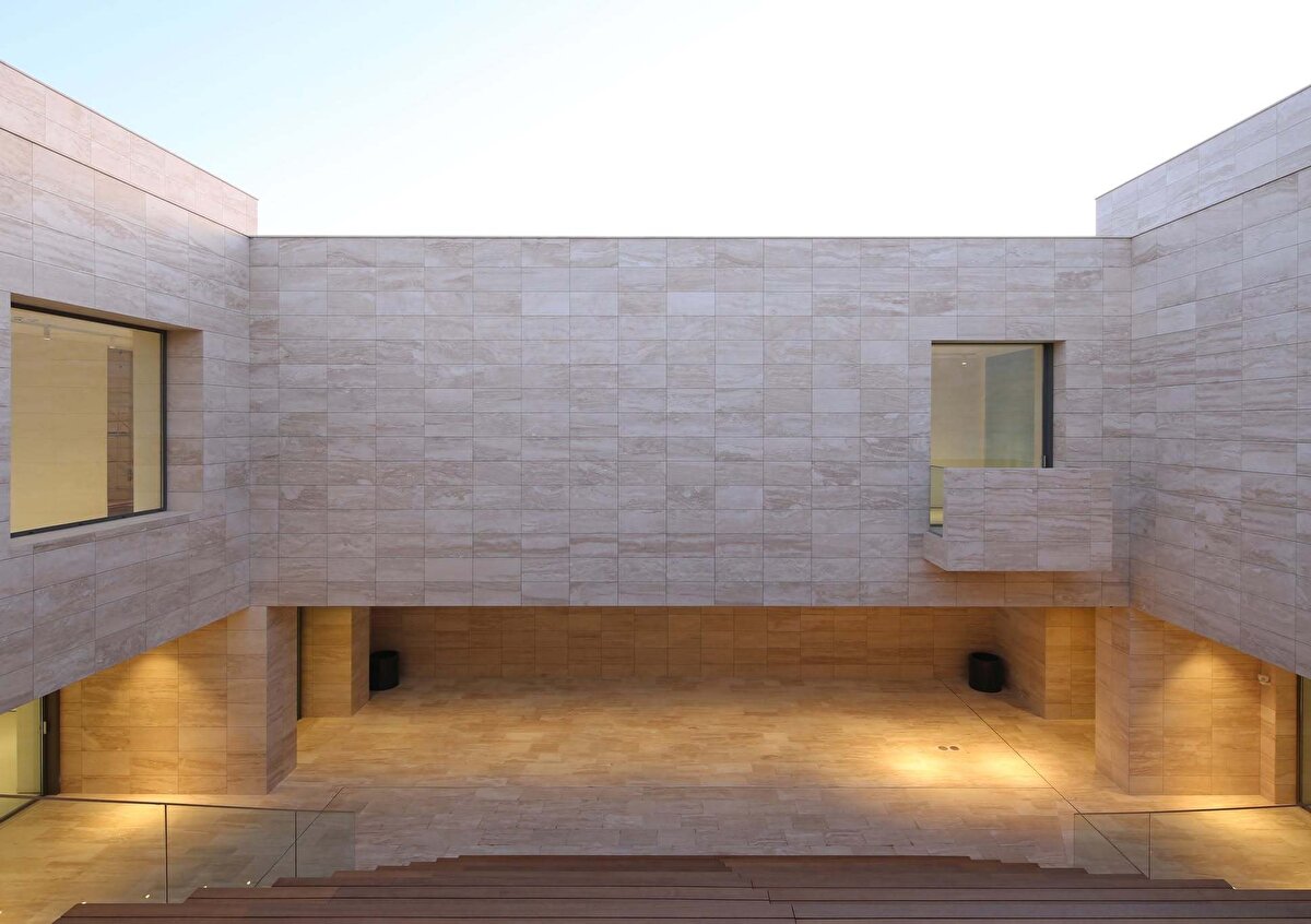 A time-sensitive spatial depth is aimed by bringing daylight into the space with controlled openings and skylights. The reflection pool and sculptures in the front garden create an art-oriented transition area between the street and the building. It is seen that natural stone-travertine is predominantly preferred in the building.