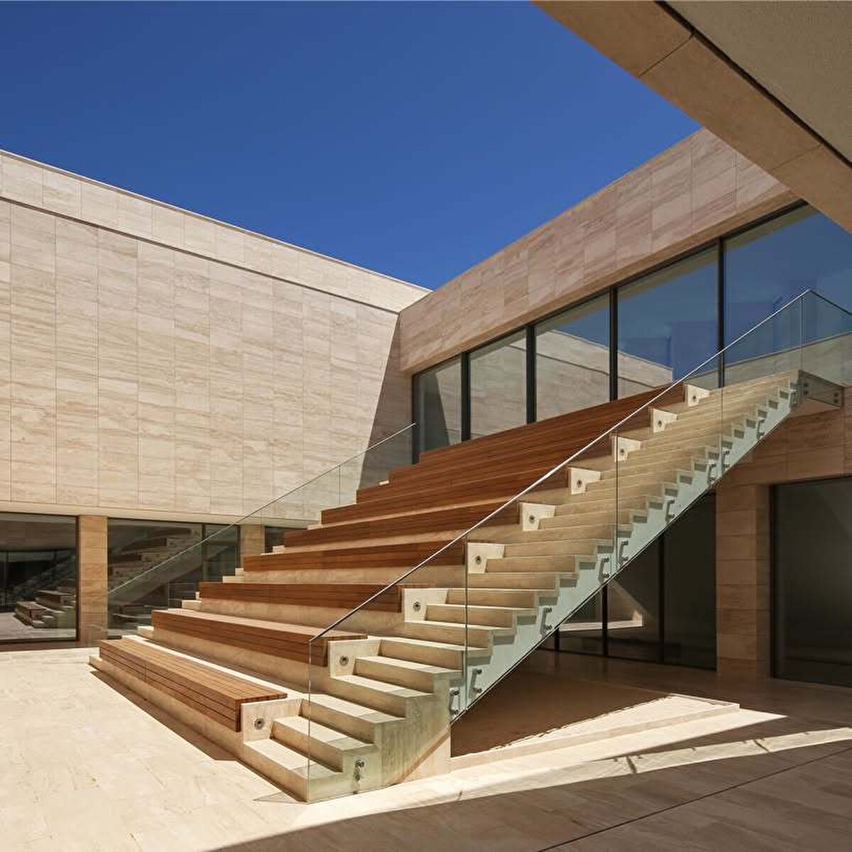 Gün ışığını kontrollü açıklıklar ve tavan ışıklıklarıyla mekana taşıyarak zamana duyarlı bir mekansal derinlik amaçlanıyor. Ön bahçede yer alan yansıma havuzu ve heykeller, sokak ile yapı arasında sanat odaklı bir geçiş alanı oluşturuyor. Yapıda ağırlıklı olarak doğal taş-traverten tercih edildiği görülüyor.