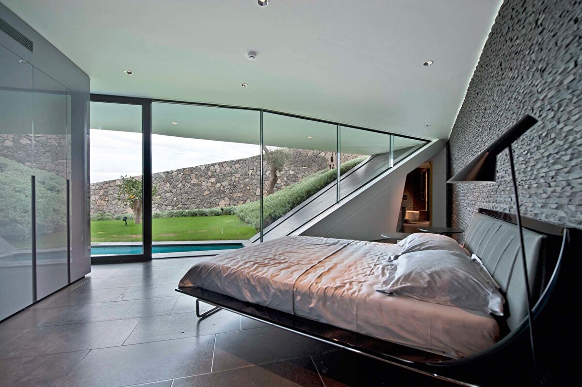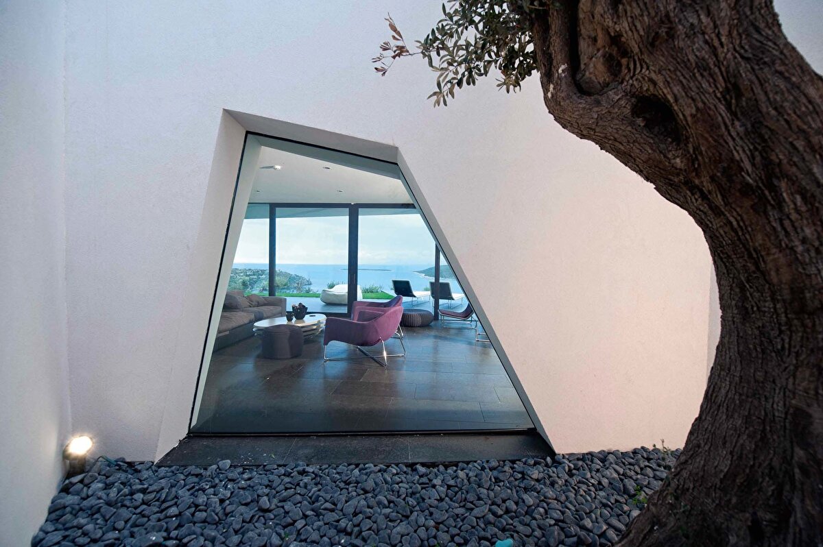 Geniş cam yüzeyler Akdeniz manzarasını içeriye taşıyarak içerisi ve dışarısı arasındaki ayrımı bulanıklaştırıyor. İç mekânlarda volkanik bazalt, dış mekânlarda ise yerinde yapılan kazılardan elde edilen aglomera kullanılıyor.