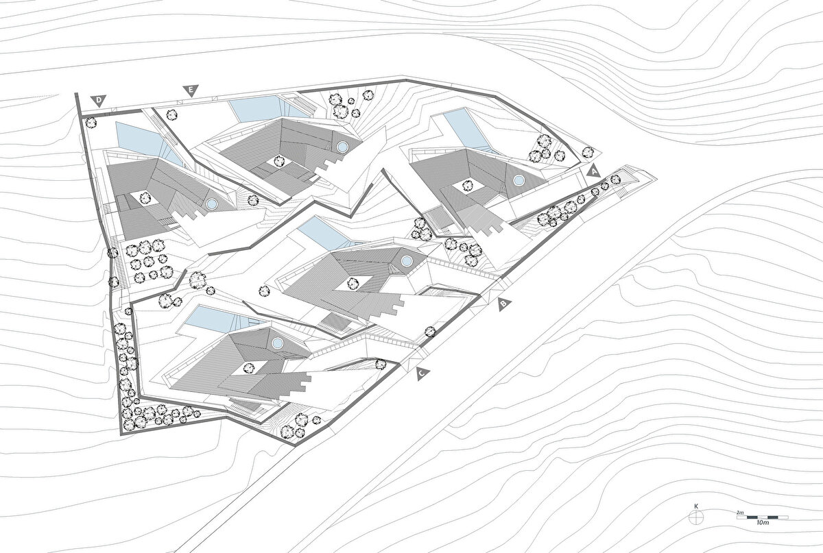 "Topografyanın Uzantısı Olarak Mimari" fikriyle şekillenen konut projesi, beş farklı yapıdan oluşuyor.