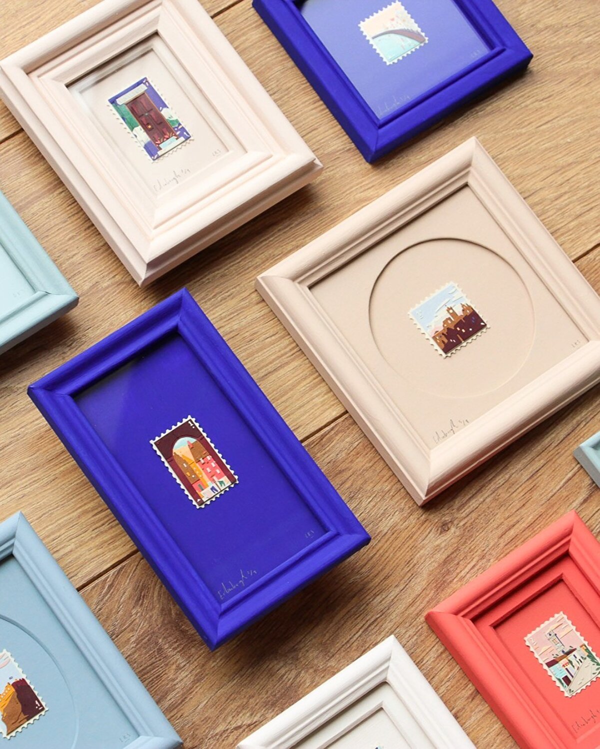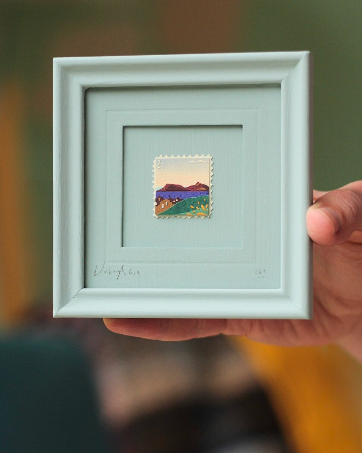 Glasgow-based Illustrator Artist Laura K. Sayers designs colourful stamps by transforming leftover paper scraps into micro-scale compositions during the design process. In a process that begins with colour and texture analysis, Sayers combines painting, layering and precision cutting techniques to lay paper sheets on top of each other and create colourful compositions. @lauraksayers