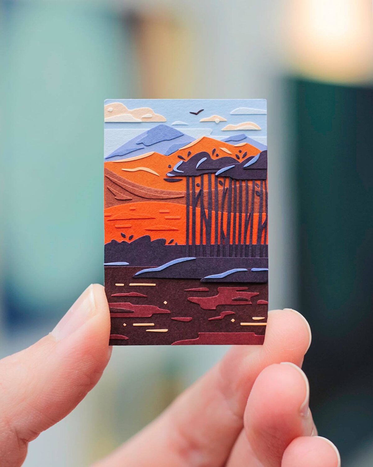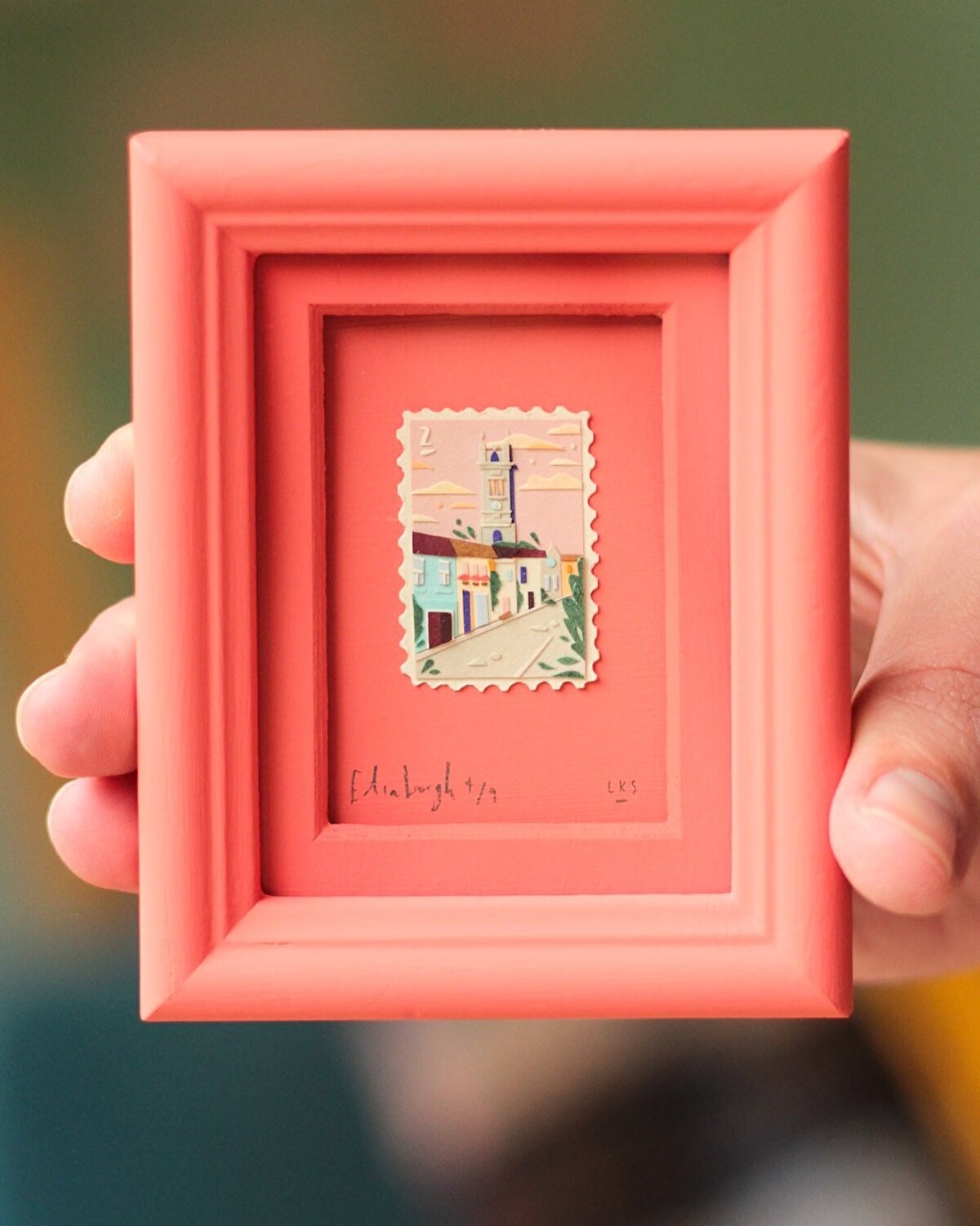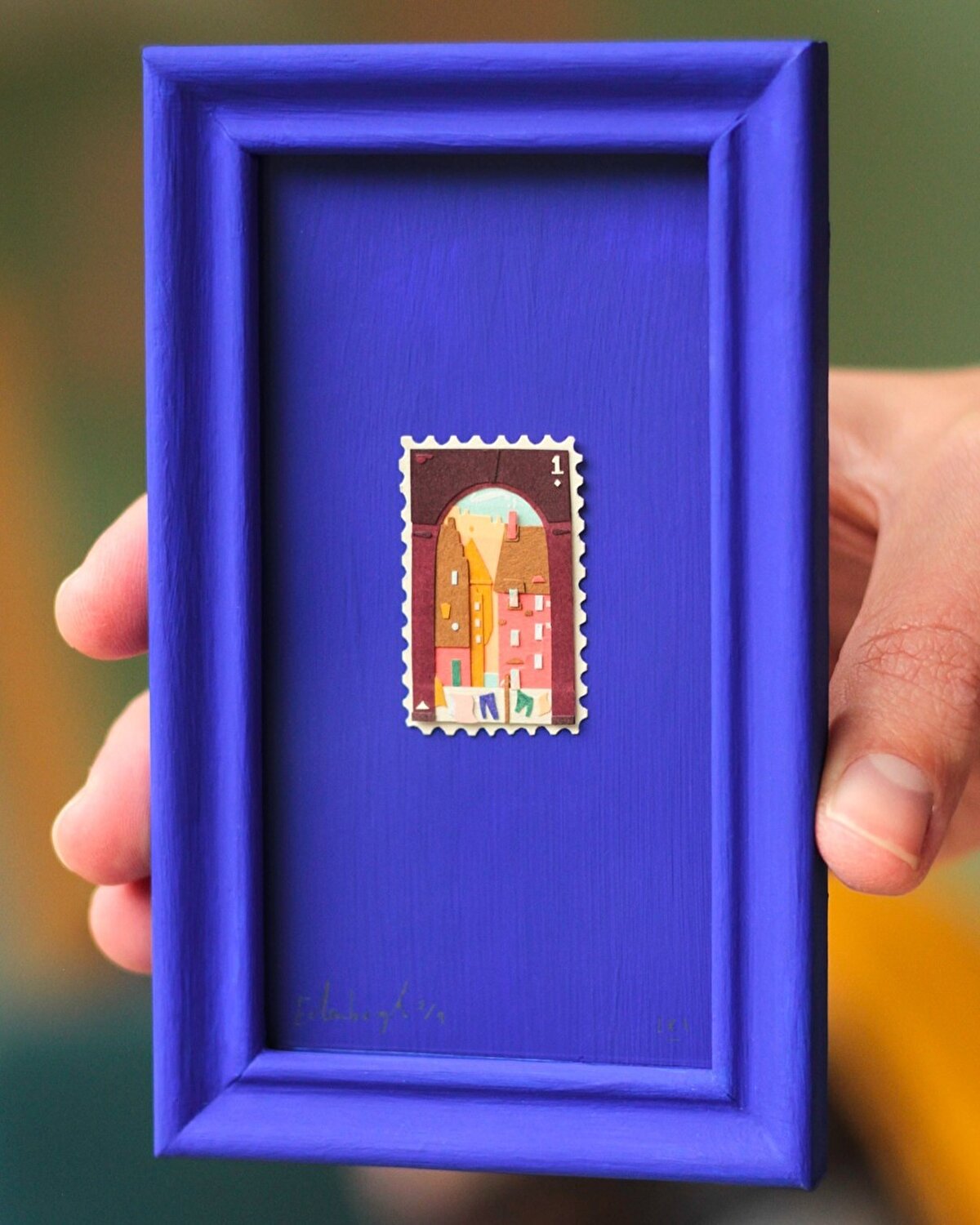 Glasgow merkezli İllüstratör Sanatçısı Laura K. Sayers, tasarım sürecinde artan kağıt parçaları mikro ölçekli kompozisyonlara dönüştürerek renkli pullar tasarlıyor. Renk ve doku analiziyle başlayan bu süreçte, Sayers boyama, katmanlama ve hassas kesim tekniklerini bir araya getirerek kağıt tabakaları üst üste yerleştiriyor ve renkli kompozisyonlar oluşturuyor. @lauraksayers