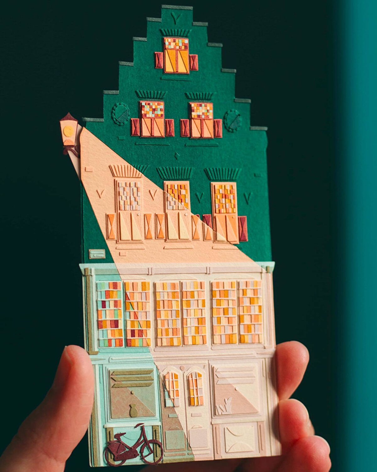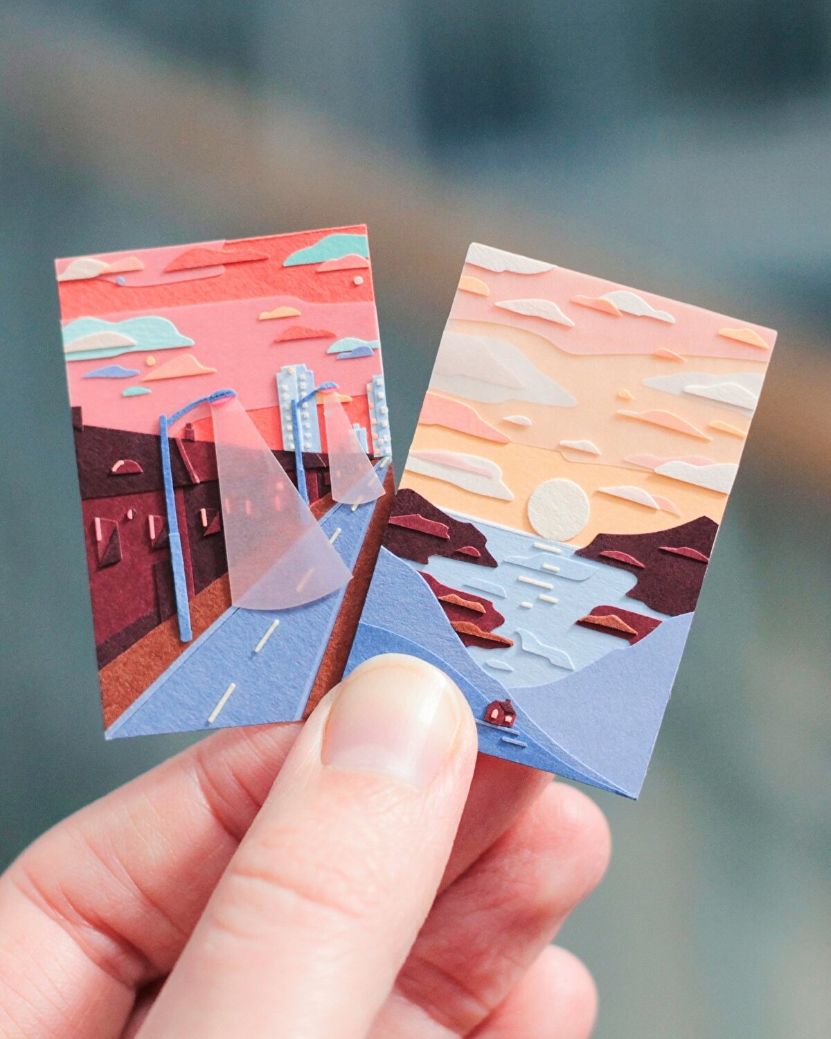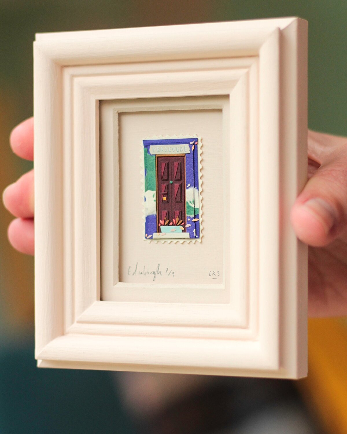 Glasgow merkezli İllüstratör Sanatçısı Laura K. Sayers, tasarım sürecinde artan kağıt parçaları mikro ölçekli kompozisyonlara dönüştürerek renkli pullar tasarlıyor. Renk ve doku analiziyle başlayan bu süreçte, Sayers boyama, katmanlama ve hassas kesim tekniklerini bir araya getirerek kağıt tabakaları üst üste yerleştiriyor ve renkli kompozisyonlar oluşturuyor. @lauraksayers