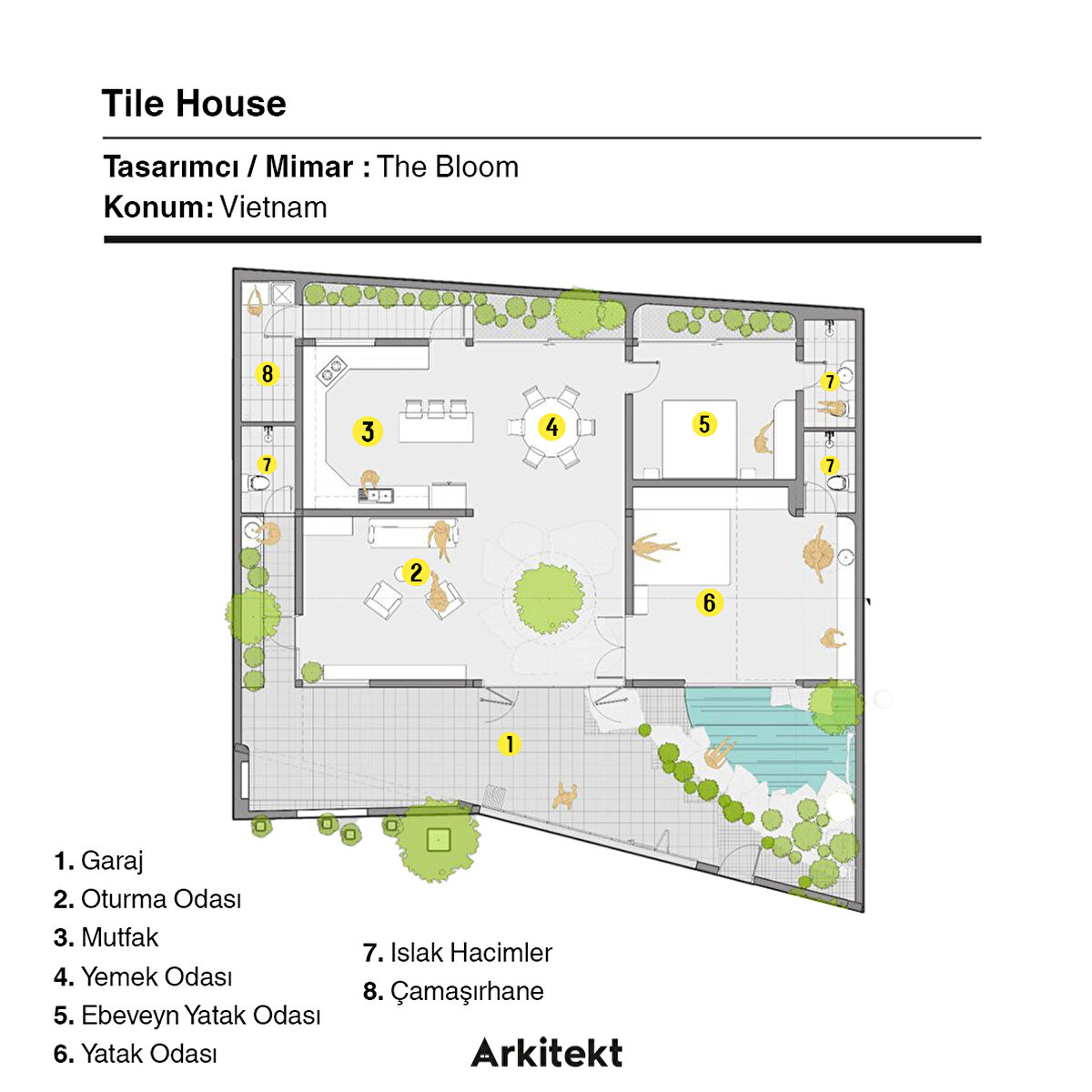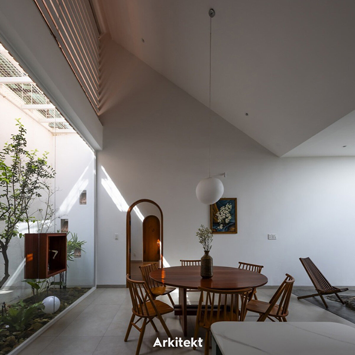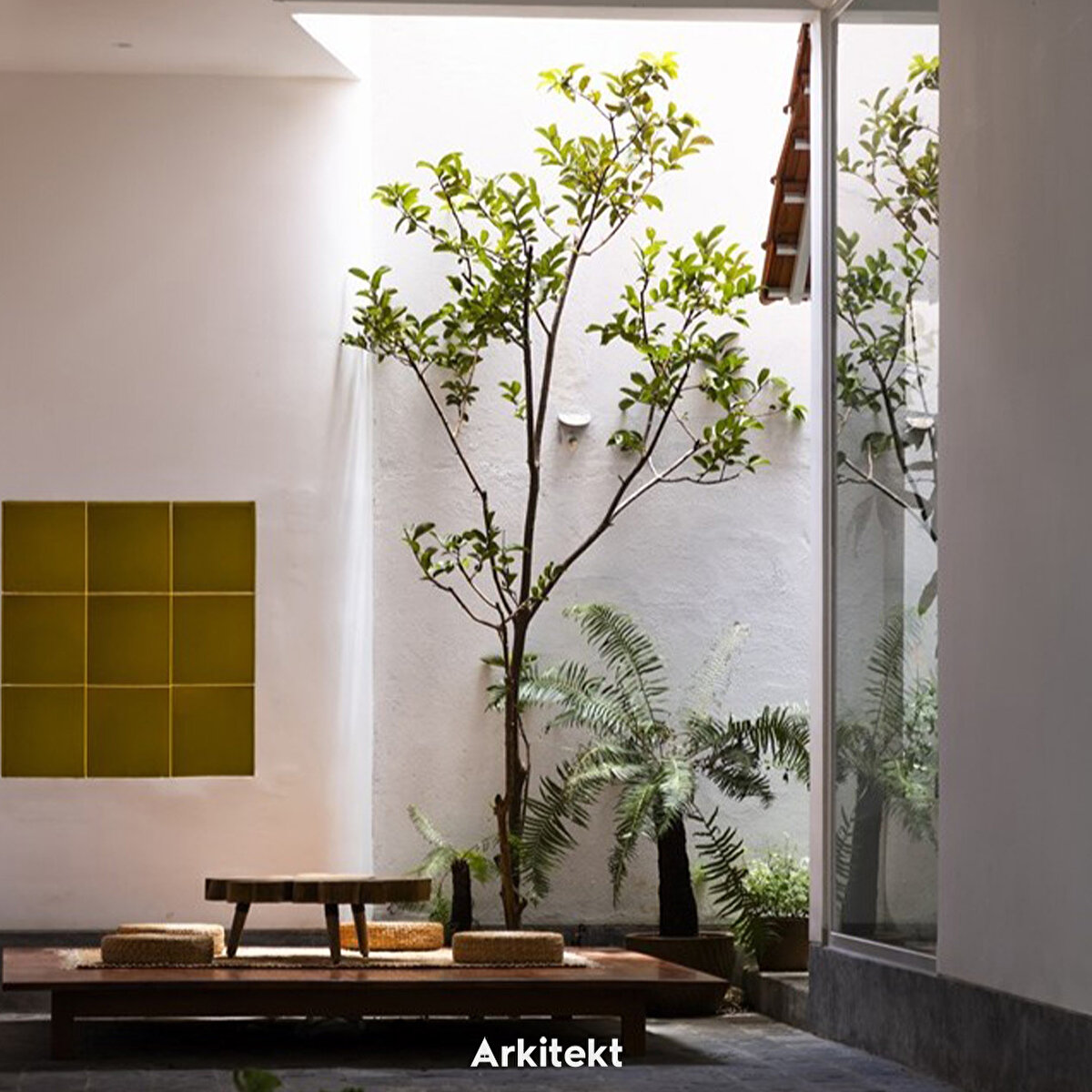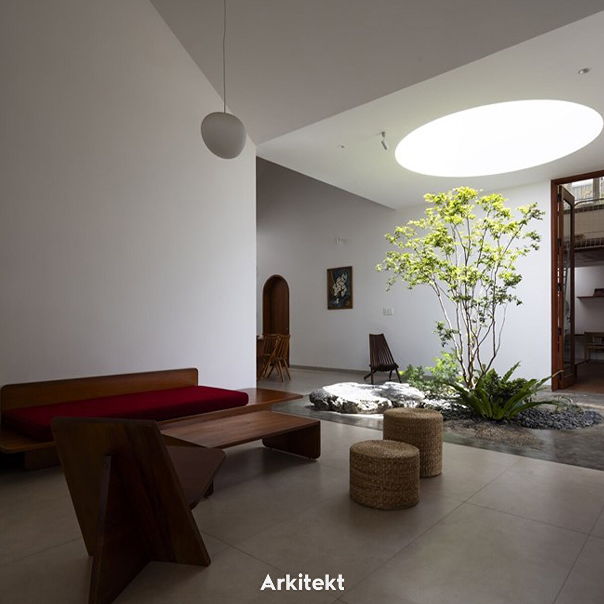 Kiremit Ev'e adım attığınızda, iç-dış mekan geçişli avlu alanı, ana yaşam alanlarına doğru genişliyor. Bu alanlar, dairesel bir ışık kuyusunun altına dikilmiş bir ağaçla çevrili merkezi iç avluya odaklanıyor.