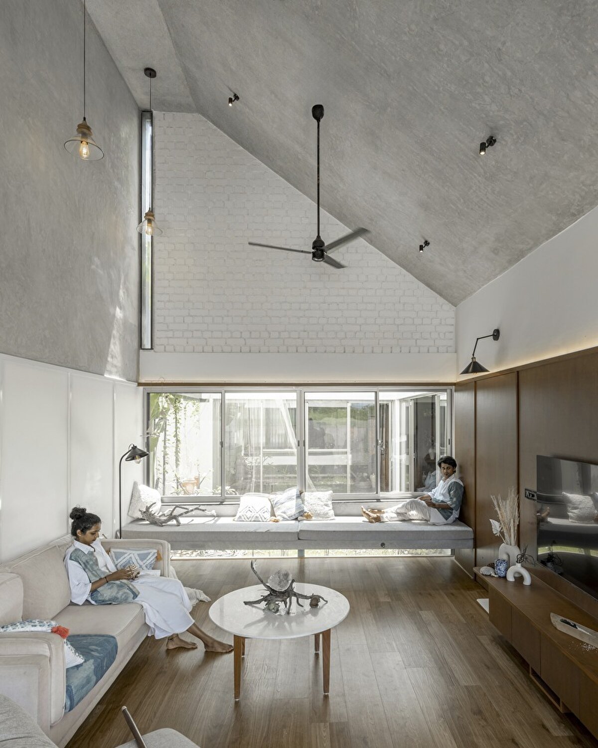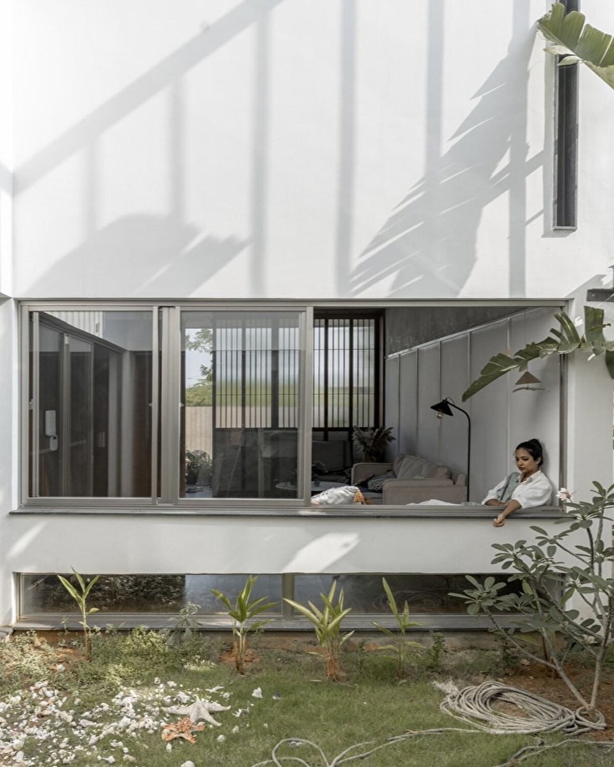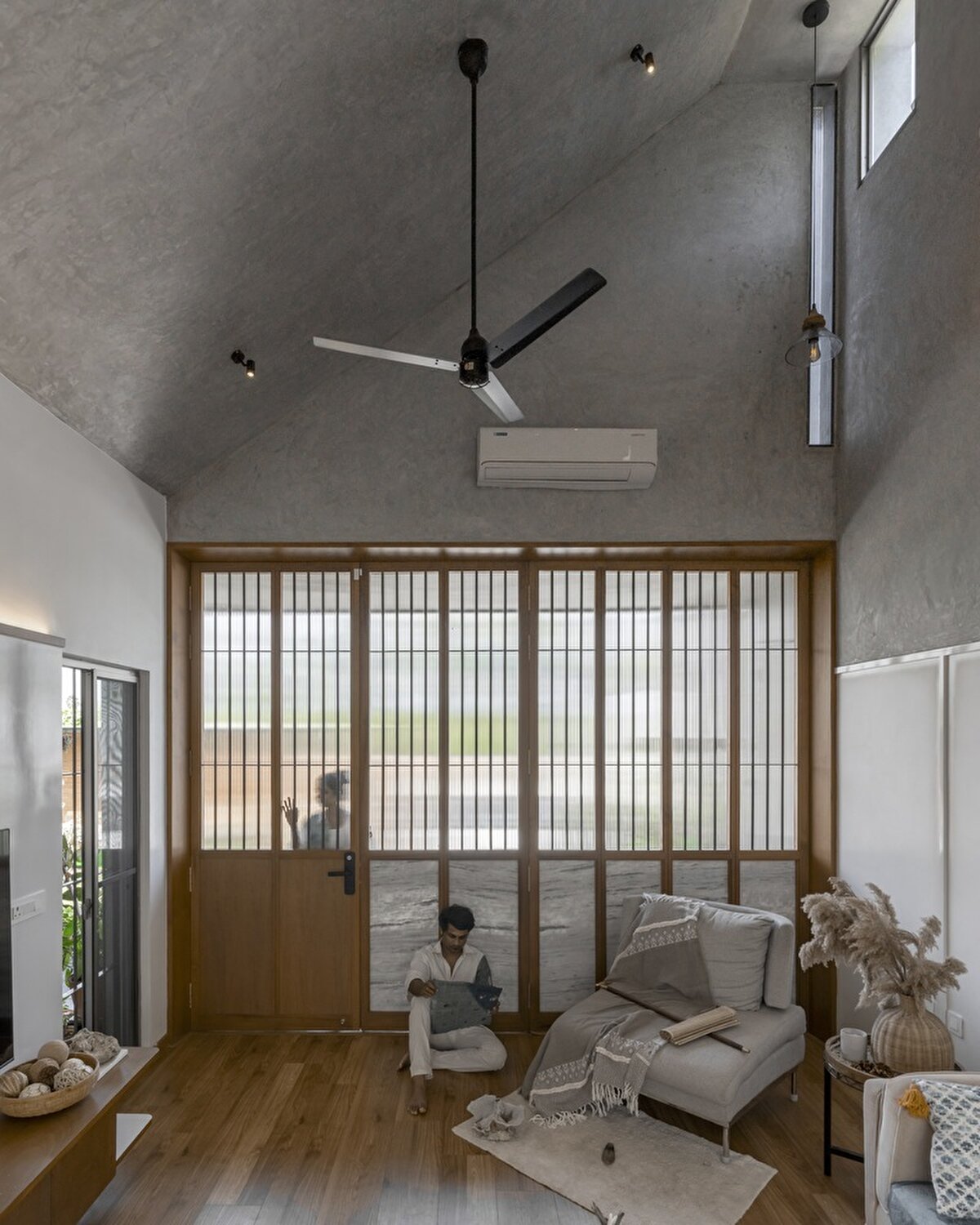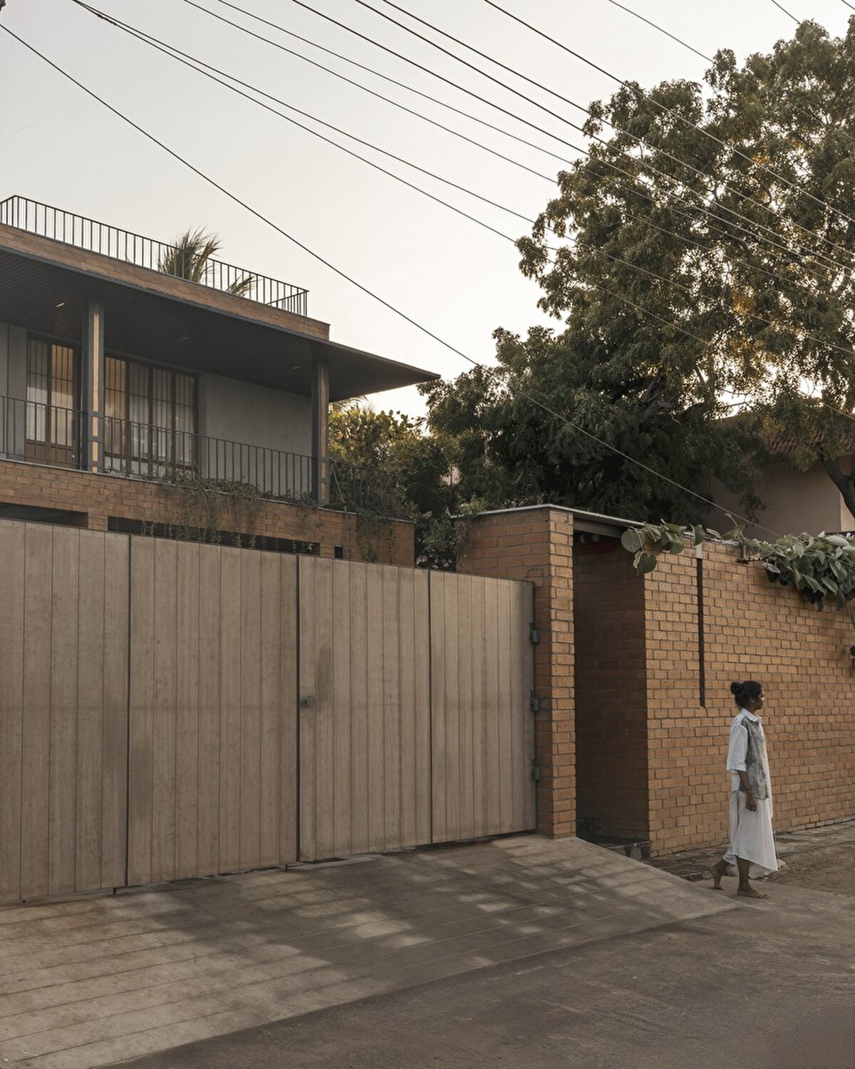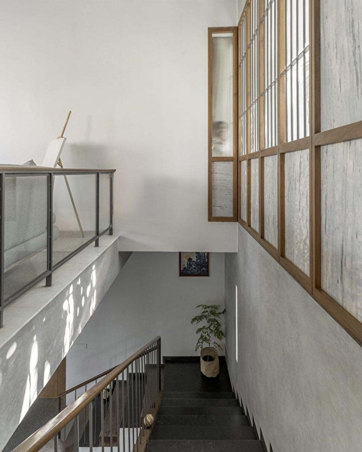 Avlu, yaşam ve çalışma alanı arasındaki sınırları ortadan kaldırıyor ve tüm özel alanlar çekirdeğin etrafında konumlanıyor. Yapıda ana malzeme olarak Hint mermeri ve kalsiyum bazlı taşlar kullanılıyor.