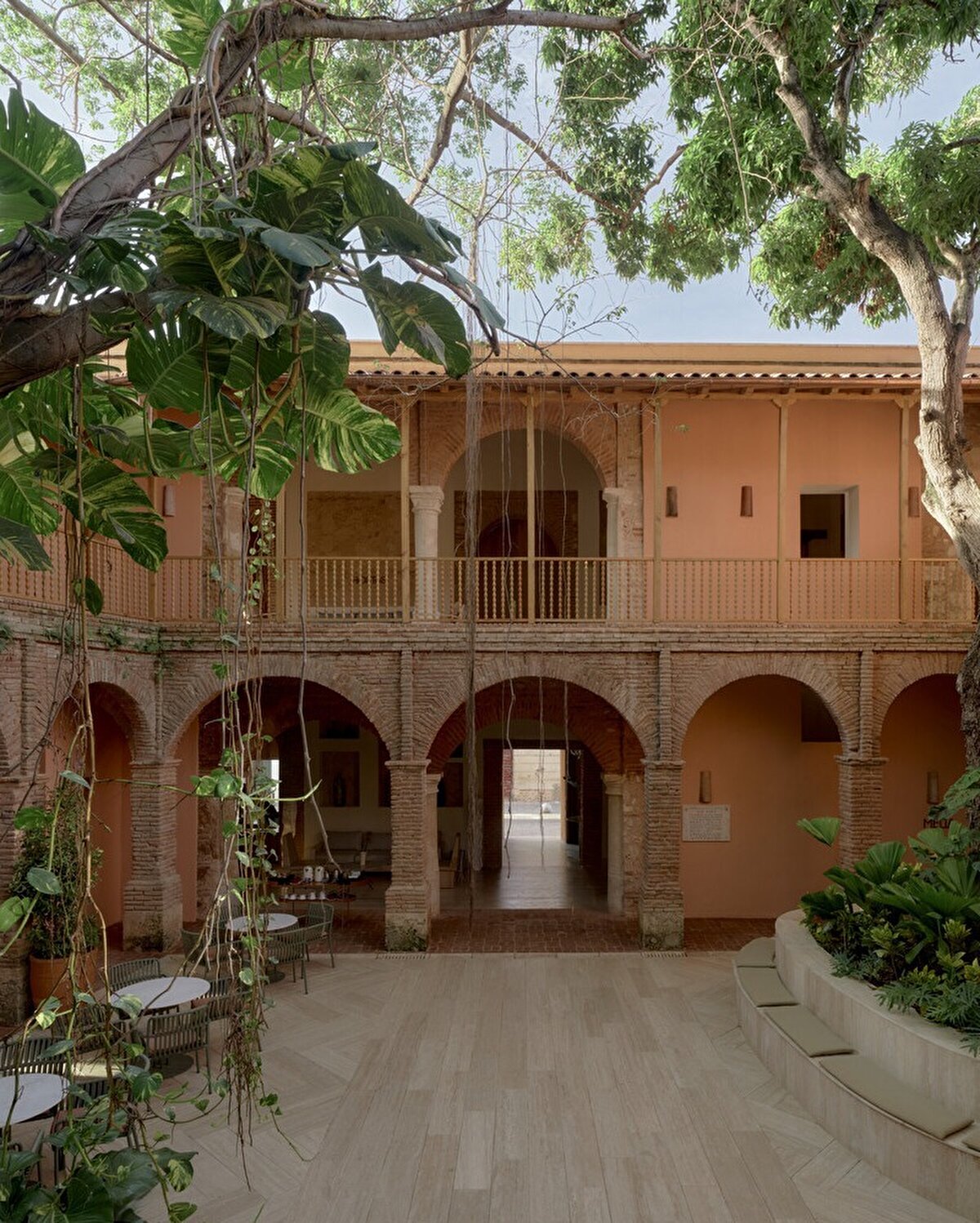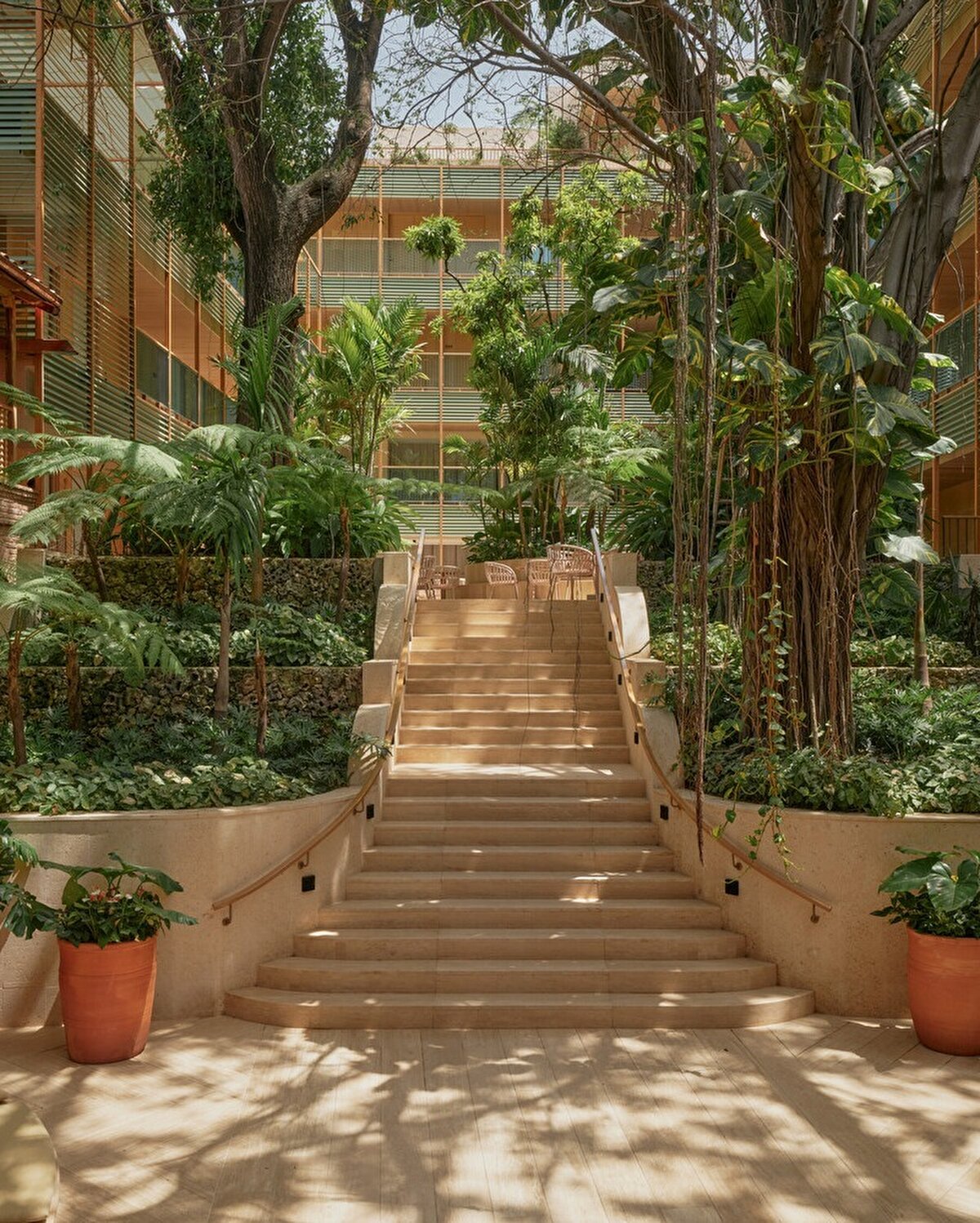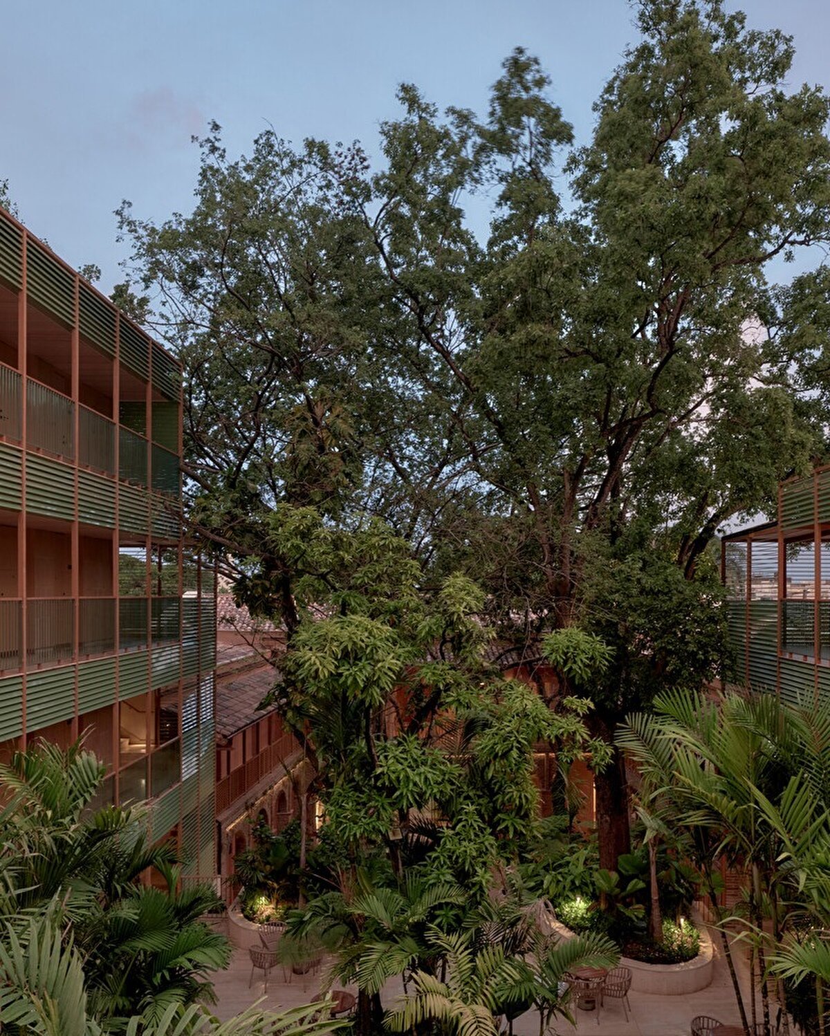 The central inner courtyard, preserved along with its local vegetation, forms the public focal point of the building. The interiors, shaped by local materials such as travertine, wood and ceramics, offer a design approach that adapts to the tropical climate. The hotel brings together new and old architectural elements in a holistic design, aiming to create continuity in the historic surroundings.