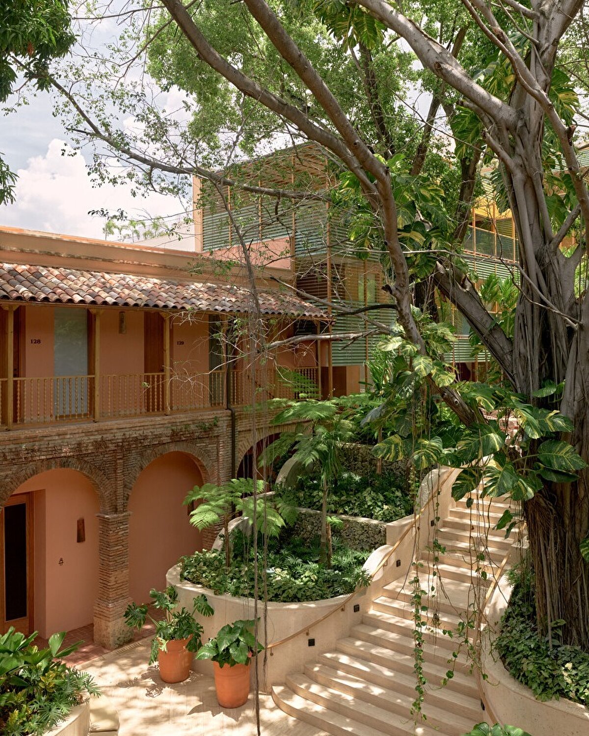Merkezdeki iç avlu, yerel bitki örtüsüyle birlikte korunarak yapının kamusal odağını oluşturuyor. Traverten, ahşap ve seramik gibi yerel malzemelerle şekillenen iç mekânlar, tropikal iklime uyum sağlayan bir tasarım anlayışı sunuyor. Otel, yeni ve eski yapı unsurlarını bütüncül bir kurgu içinde bir araya getirerek, tarihi çevrede süreklilik amaçlıyor.
