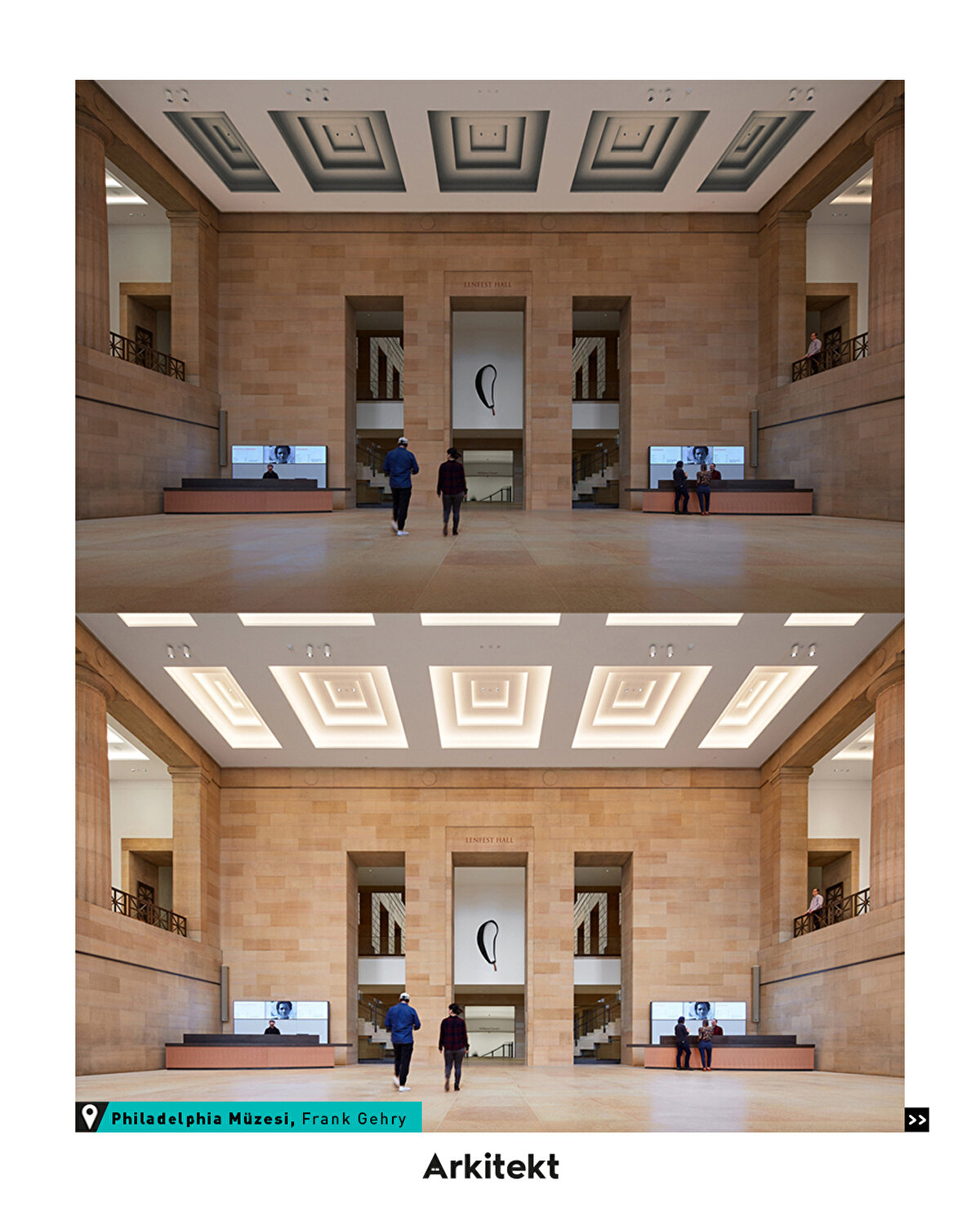 Renkleri ve açıları değiştirilerek projelerde kullanılan ışık, mekanı ve yapıyı manipüle ederek kullanıcıların duygu durumuna etki ediyor.