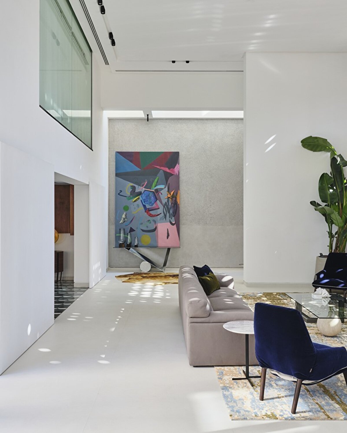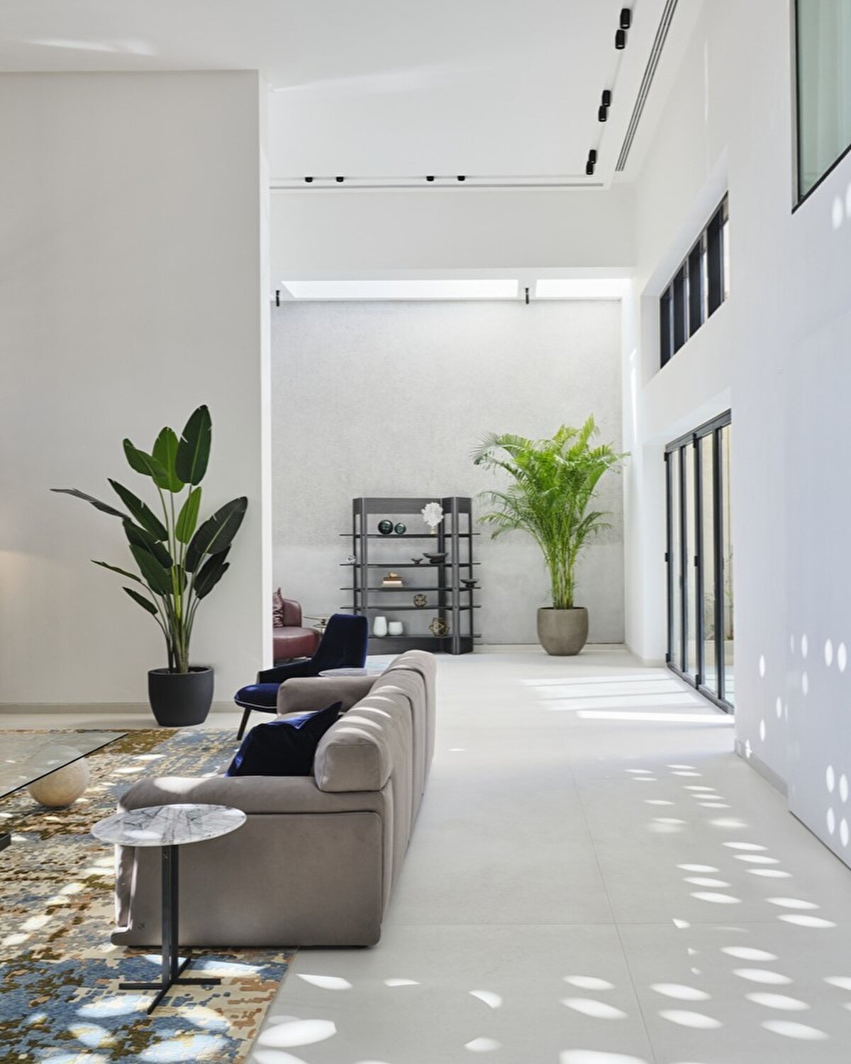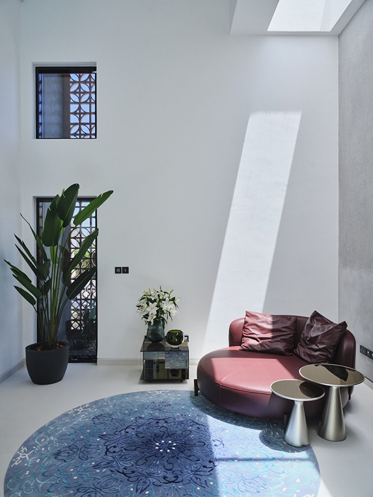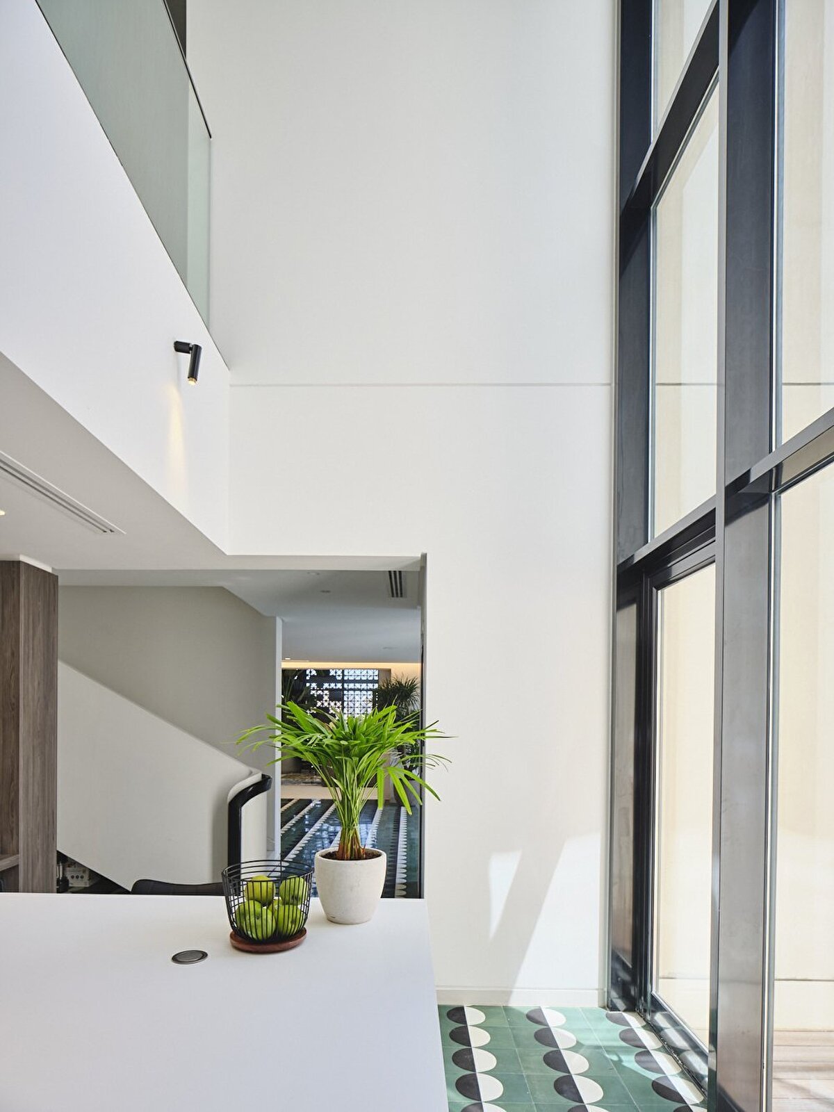Doğrusal çatı pencereleri, ana resepsiyon alanını aydınlatıyor. İki katlı aile oturma odası, resepsiyon alanına bakıyor ve avluyla görsel bağlantı kuruyor. Asma köprüyle erişilen ana yatak odası, oturma odasının iki kat yüksekliğindeki alanını bölüyor ve dinamik bir mekansal süreklilik sunuyor. Bu tasarım, iç mekanların genel akışını ve uyumunu artırıyor.