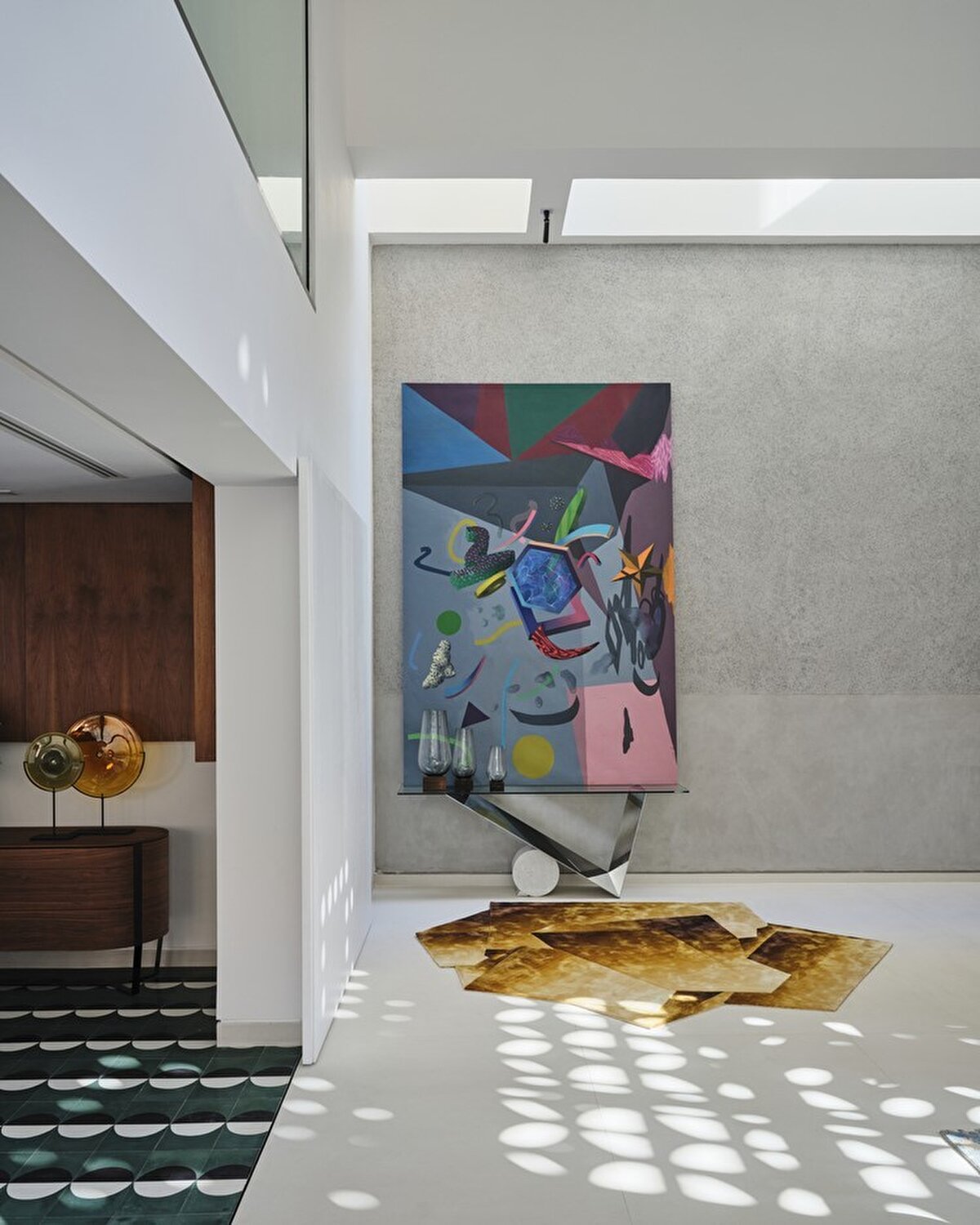 400 m2'lik bir arsada yer alan bu aile evi, üç kata yayılmış ve birbirine bağlı bölünmüş katlardan oluşuyor. 7 metre yüksekliğindeki cephenin tasarımı, doğal ışığı karşılamak ve iç mekanların mahremiyetini sağlamak için koruyucu bir bariyer oluşturuyor. Bu cephe, dış ve iç mekanlar arasında kontrast oluşturan desenli bir eleman duvarı ile dikkat çekiyor.