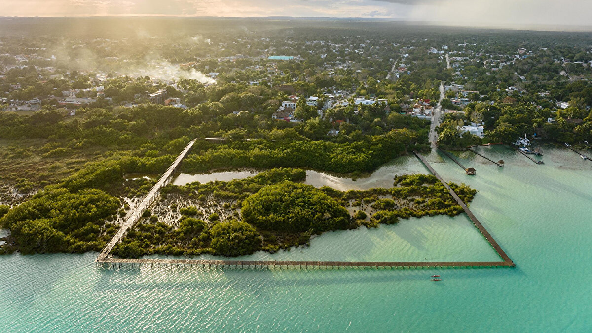 Colectivo C733's 2023 Ecoparque Bacalar project focuses on the ecological sensitivity of Bacalar Lagoon, home to living stromatolites and mangrove forests. The project minimizes the impact of human activity by reducing the expected amount of construction and designing the area with minimal intervention.