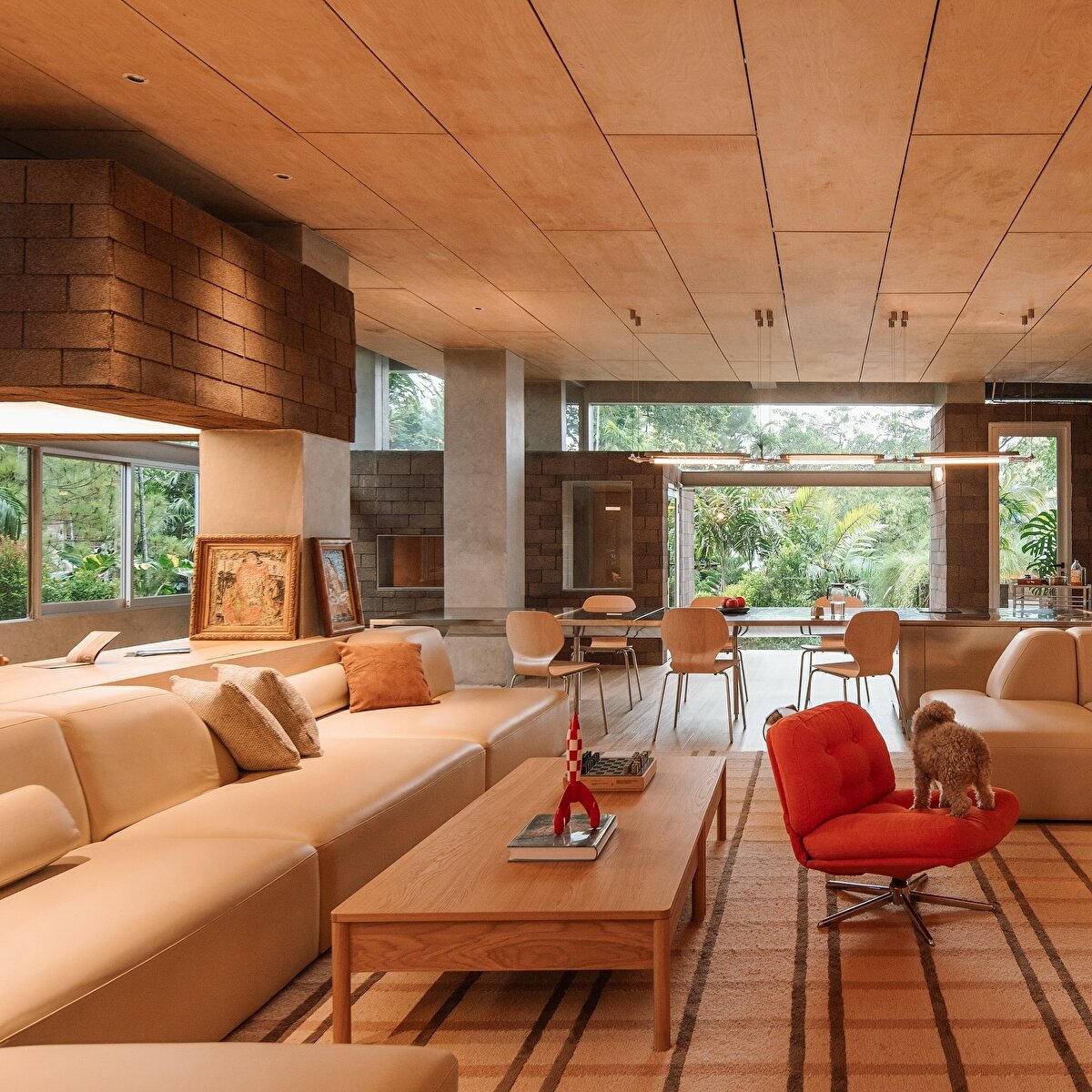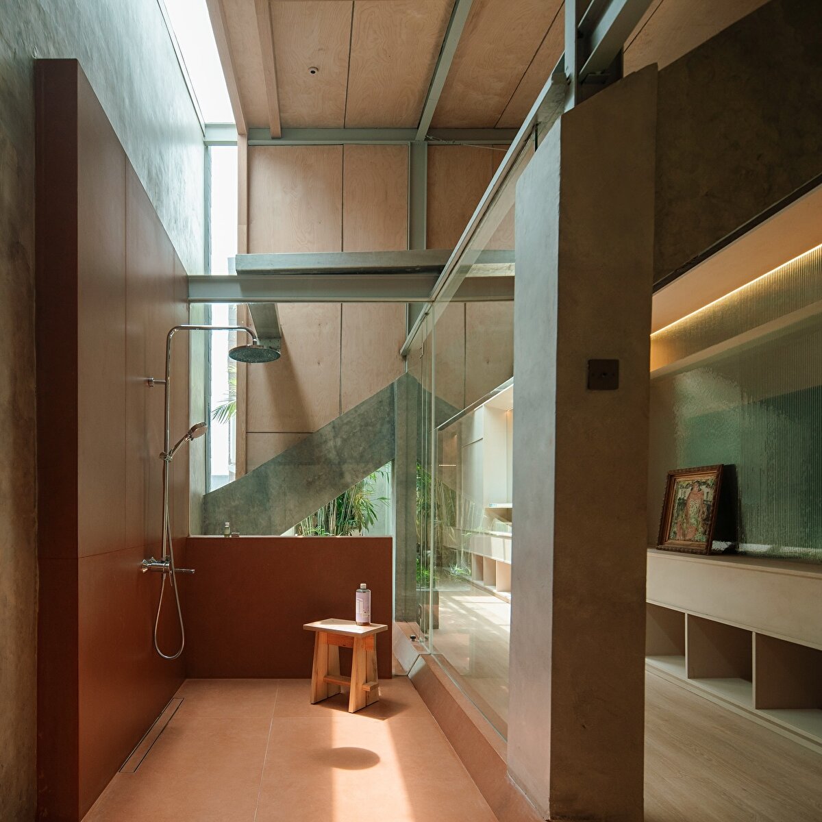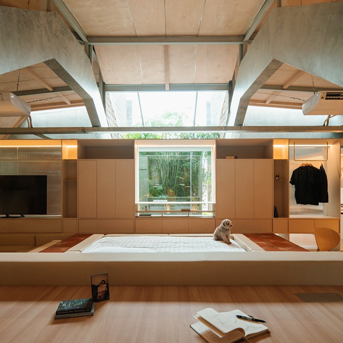 Bahçe üzerindeki çatı katı, dört içe dönük kütlenin peyzajın üzerinde konumlanmasıyla yapı kimliğini oluşturuyor ve bu kütlelerin arasında ters boşluklar meydana geliyor. Açık plan kurgusuyla oluşturulan tasarım, mevcut taşıyıcı sistem korunarak ağır bölücü elemanların kullanımını en aza indiriyor. İç mekânda mahremiyet ve açıklığın dengelendiği alanlar yer alıyor; mobilyaların konumlanışı ise kullanıcı deneyimini ve dış mekânla kurulan ilişkiyi şekillendiriyor. Banyolarda daha yoğun bir renk kullanımı yer alırken, diğer alanlarda açık tonlar ve pürüzsüz yüzeyler devam ediyor. Katları birbirine bağlayan iki merdiven daha koyu renk ve gözenekli dokusuyla mekâna entegre ediliyor Ev, mahremiyeti korurken doğal ışık ve manzarayı iç mekâna dâhil eden bir yaşam kurgusuyla tasarlanıyor. - The rooftop terrace above the garden establishes the building's identity through the positioning of four inward-facing volumes above the landscape, creating inverted voids between them. The design, created with an open plan concept, minimizes the use of heavy partitioning elements while preserving the existing structural system. The interior features areas where privacy and openness are balanced; the placement of furniture shapes the user experience and the relationship with the exterior. While a more intense use of color is found in the bathrooms, light tones and smooth surfaces continue in other areas. Two staircases connecting the floors are integrated into the space with their darker color and porous texture. The house is designed with a living concept that incorporates natural light and views into the interior while maintaining privacy.