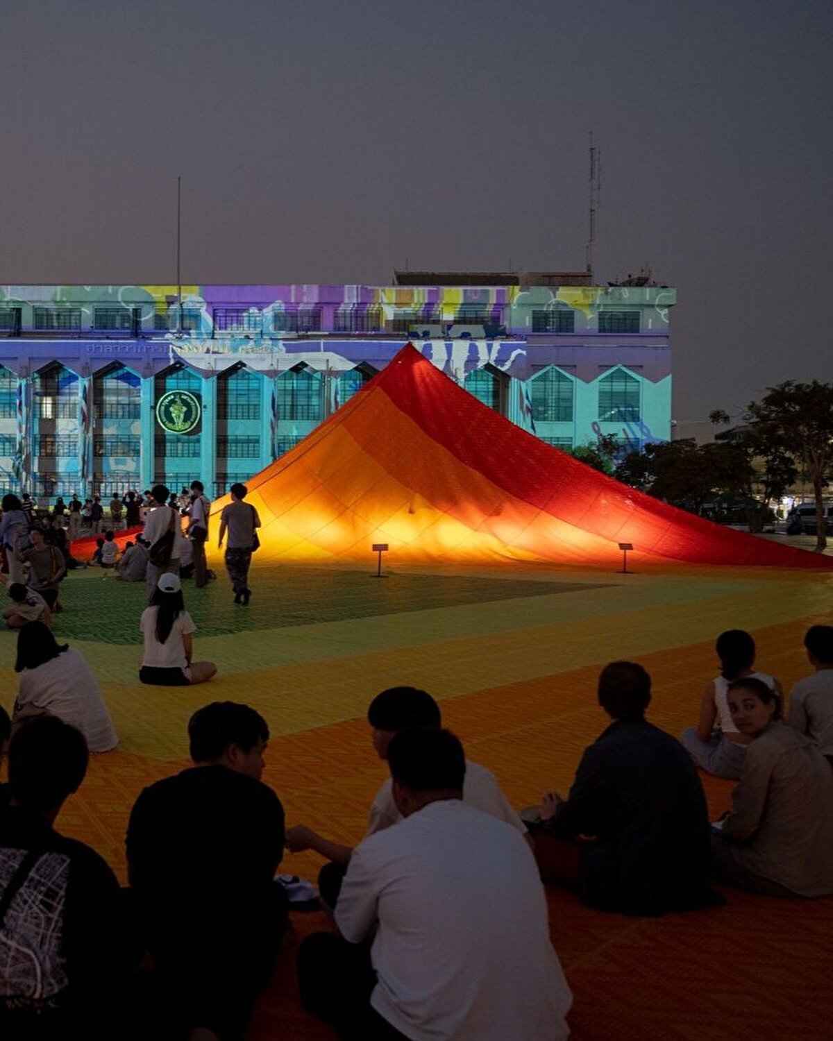 MVRDV, Bangkok Tasarım Haftası 2025 için plastik atıklardan dönüştürdüğü Mega Mat adlı kamusal enstalasyonu tasarladı. 500'den fazla geri dönüştürülmüş plastik mattan oluşan bu 860 metrekarelik platform hem işlevsel bir oturma alanı hem de Tayland'daki plastik geri dönüşüm sürecini anlatan görsel bir infografik niteliğinde.