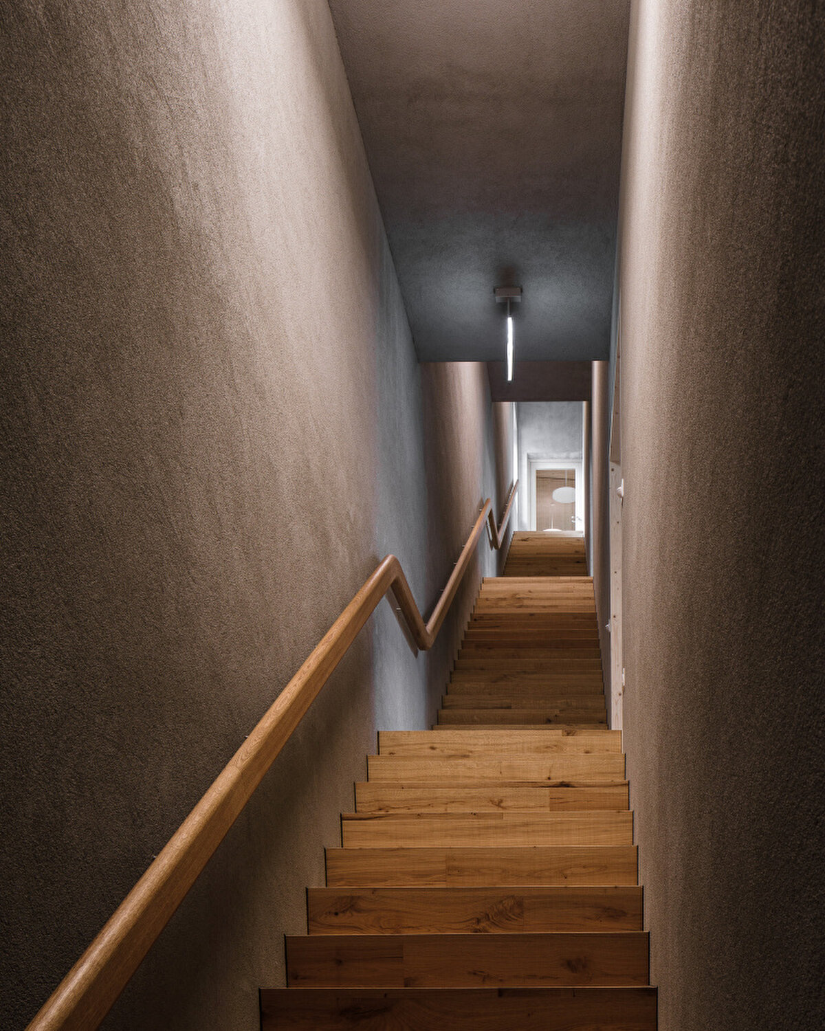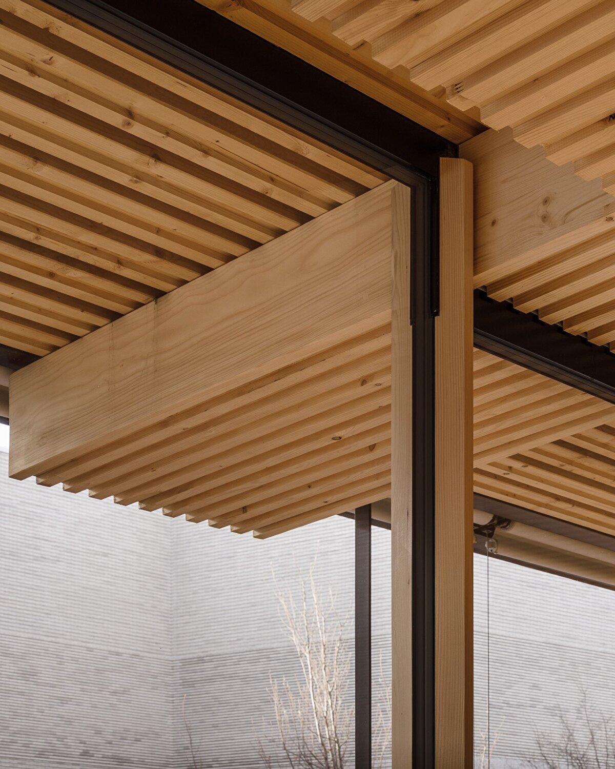 Beton güvenlik duvarı binanın mineral çekirdeğini oluşturur. Bu sağlam beton omurgadan çıkan mimari kompozisyon, prefabrik elemanlardan oluşan ahşap bir yapıya dönüşüyor.