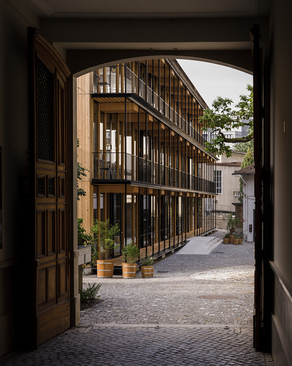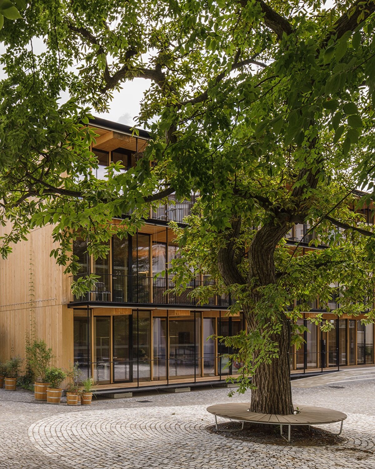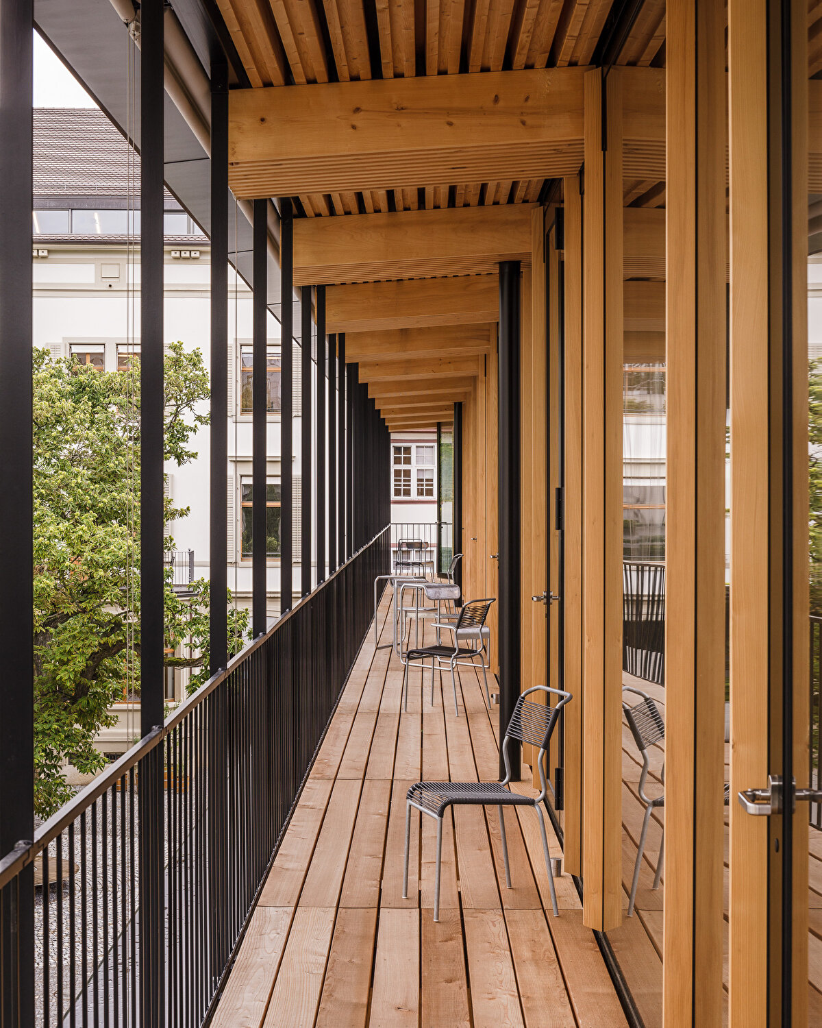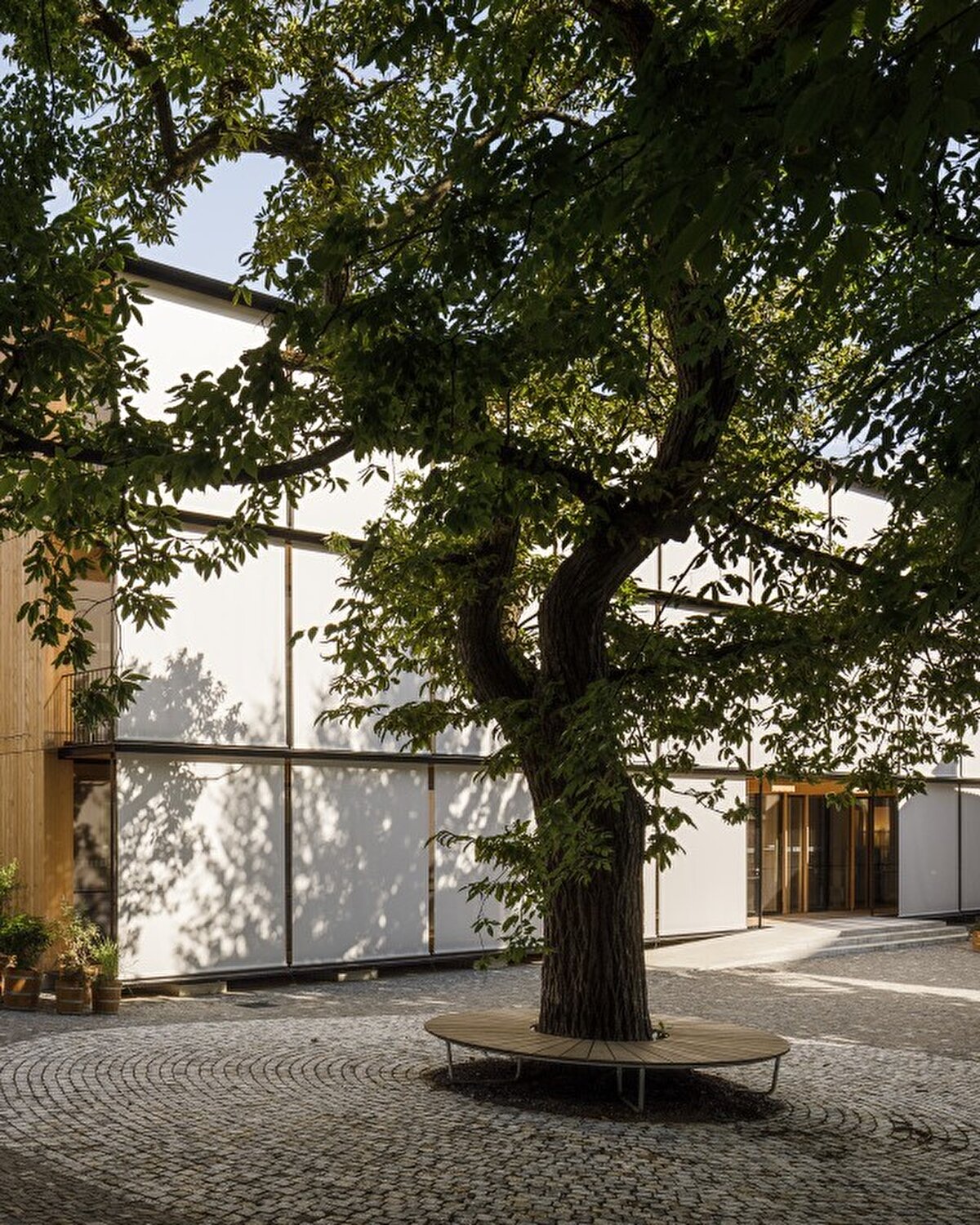 Located in a courtyard in the center of Basel, the new headquarters of the Christoph Merian Foundation has a functional and flexible design. The upper floors of the three-story project are used as shared offices and meeting rooms and can easily adapt to different needs. The timber structure and arches allow the interior plan to be easily rearranged, while the exterior fabric blinds ensure optimal daylight utilization.