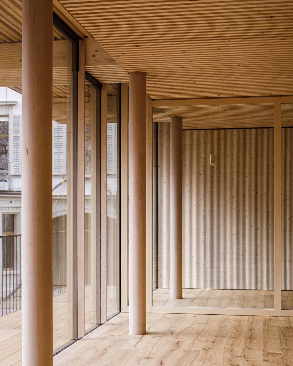 The concrete firewall forms the mineral core of the building. From this solid concrete backbone, the architectural composition emerges into a wooden structure of prefabricated elements.
