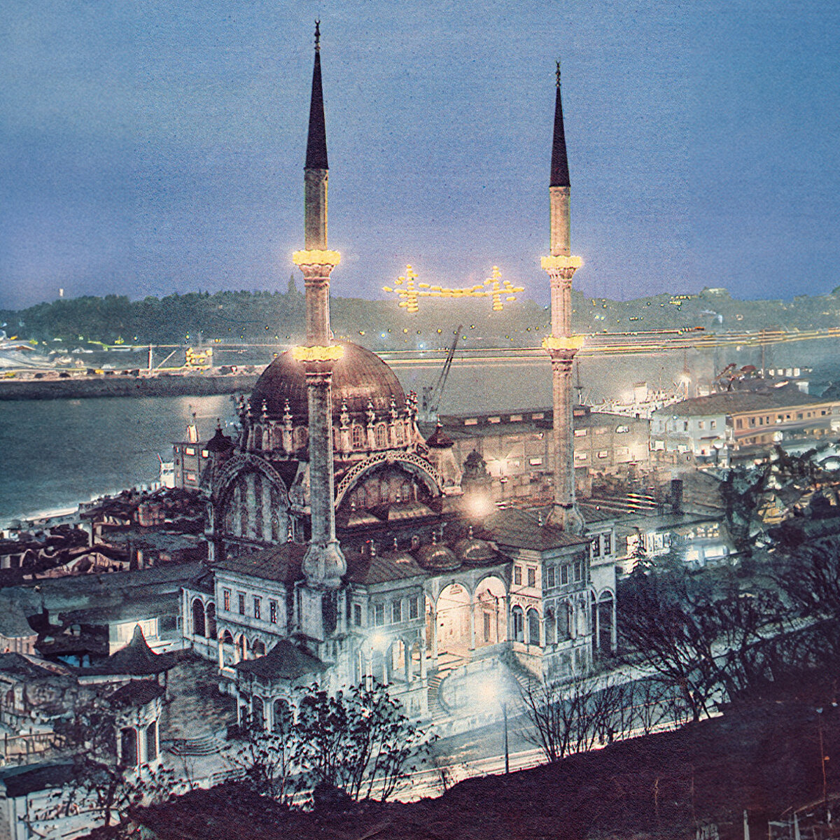 Foto 1: 1970 yılında yapımına başlanan Boğaziçi Köprüsü için Nusretiye Camii'nde kurulan köprü şeklindeki mahya (Hayat Mecmuası, sy. 47, 19 Kasım 1970)