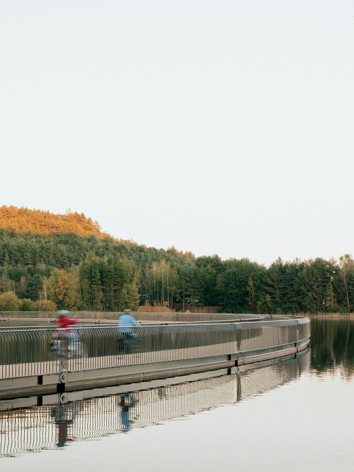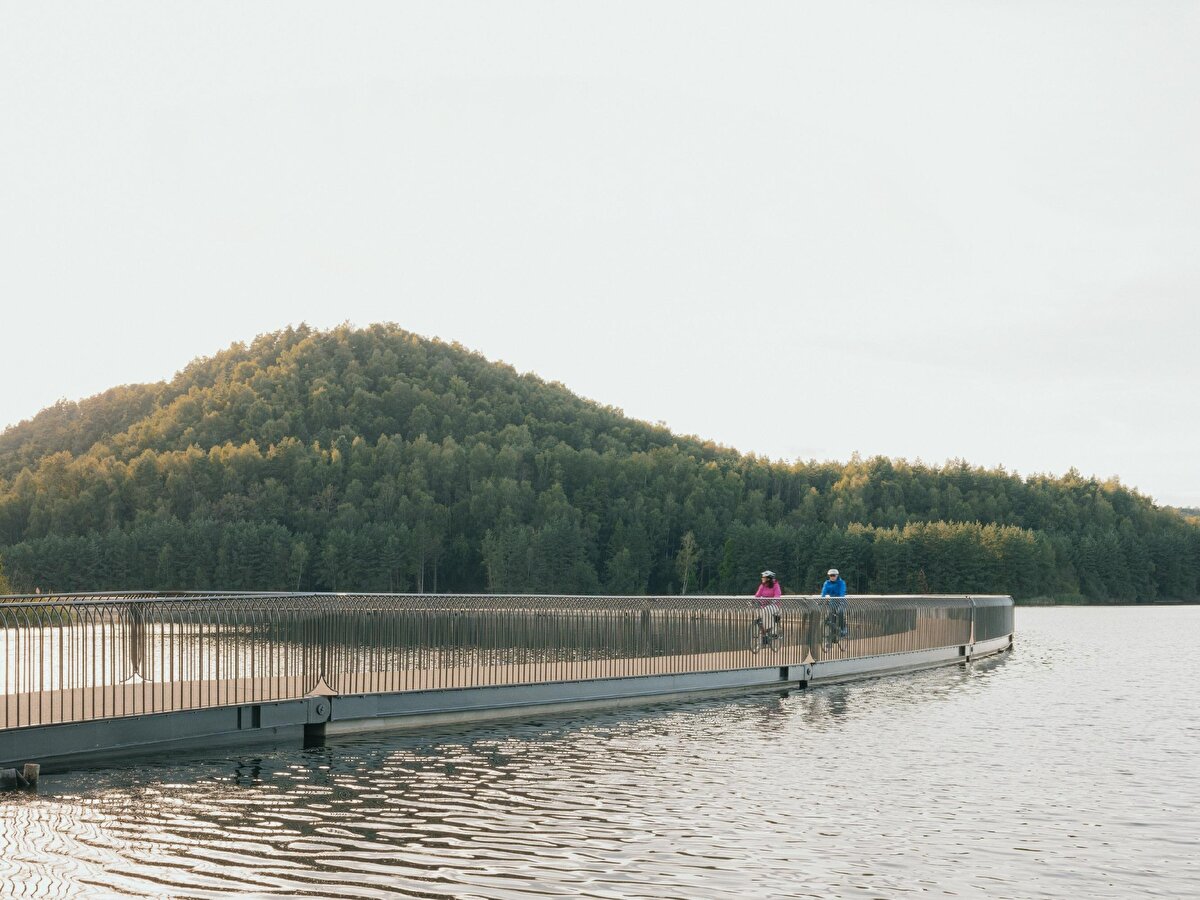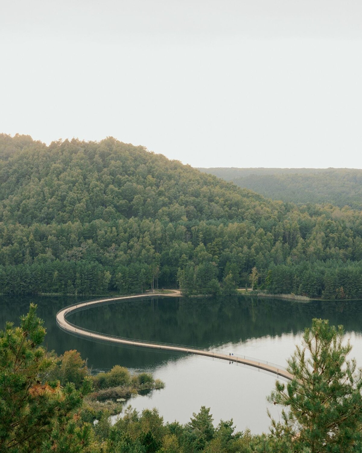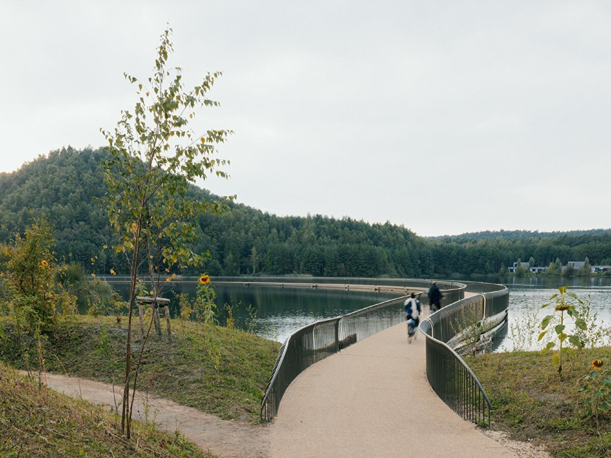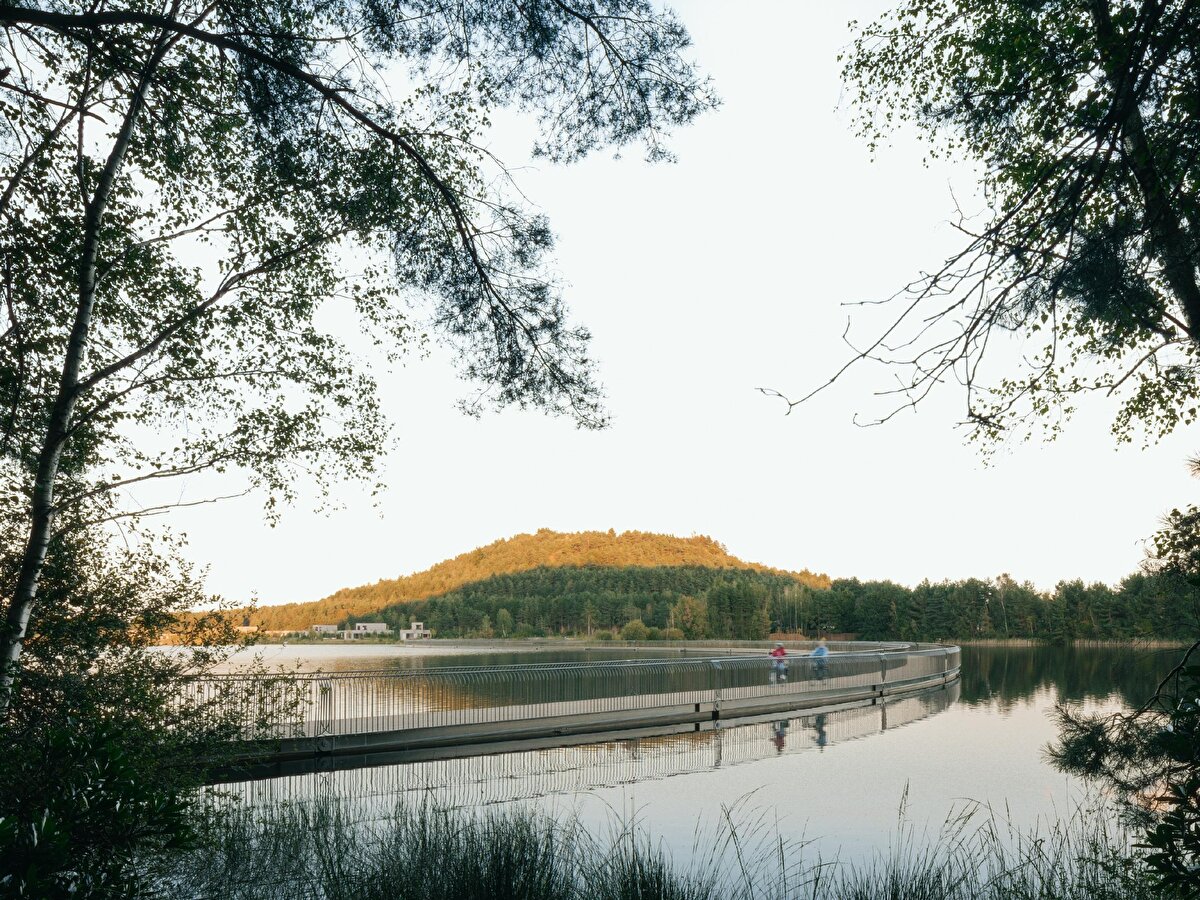 The 400-metre-long floating bridge located on the border of Dilsen-Stokkem and Maasmechelen in Belgium connects the terrils left behind from the region's mining history. Designed by BuroLandschap, the structure serves as an important crossing point, integrated into Limburg's cycle path network. The curved form, inspired by the golden ratio principle, enhances the bridge's harmony with the landscape.