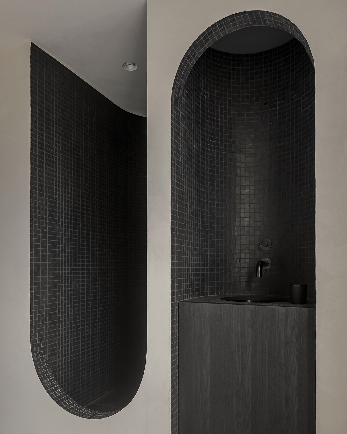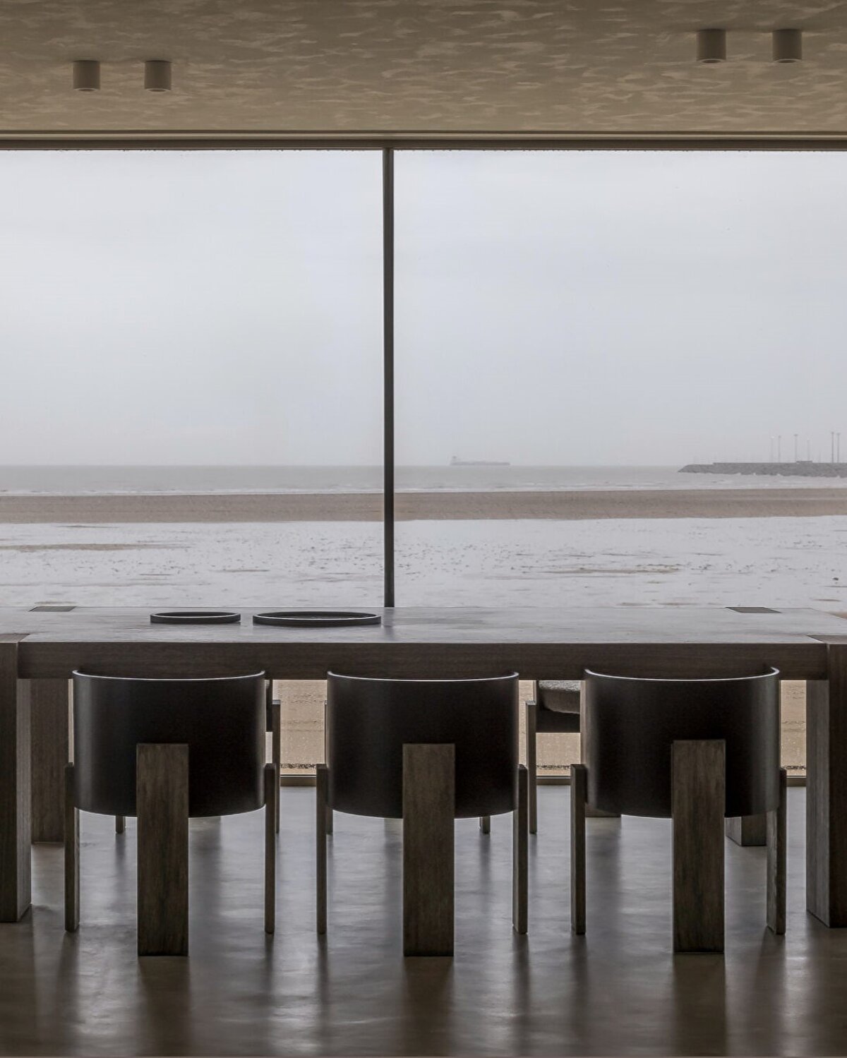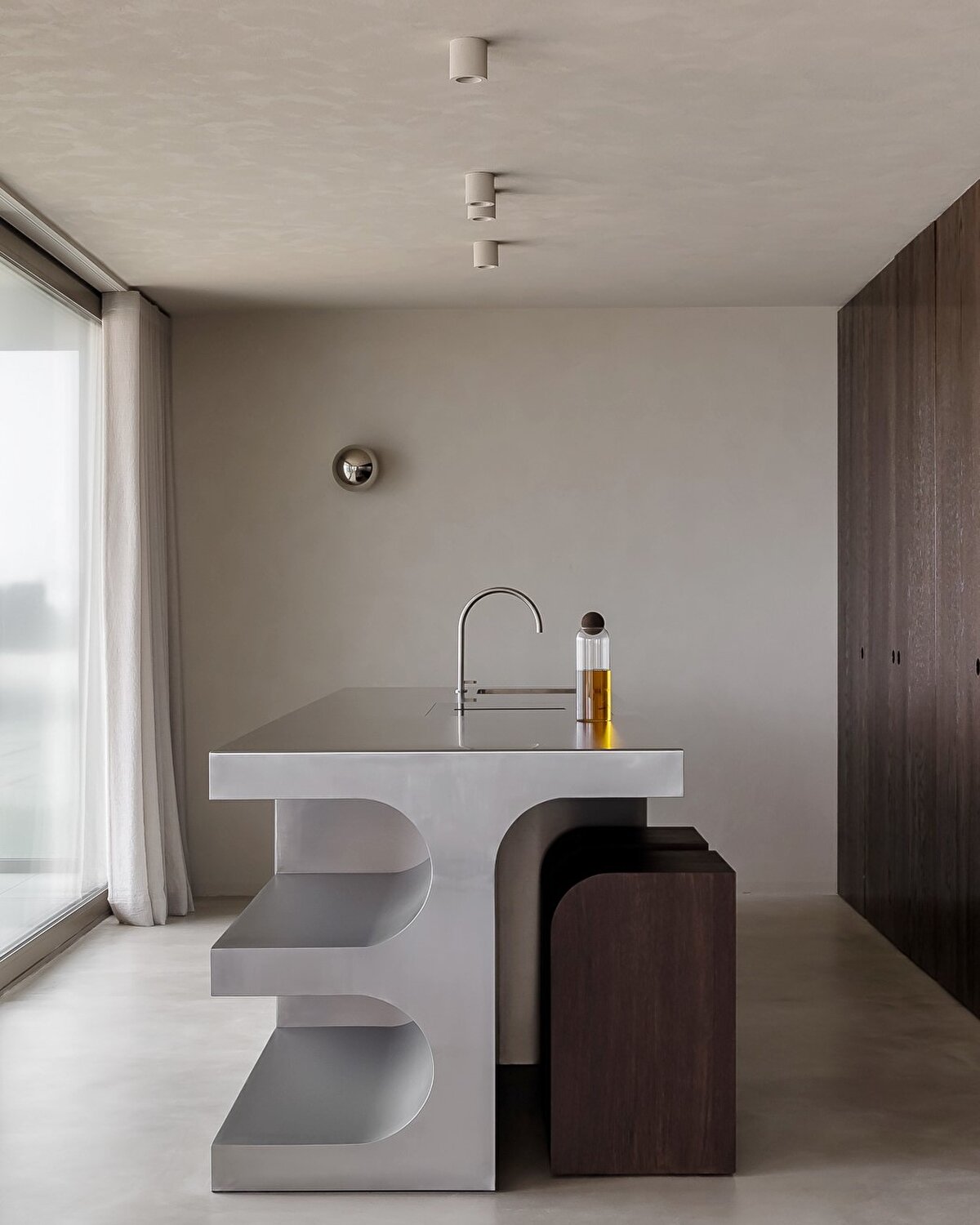 Mekânda yarı açık mutfak, oturma ve yemek alanı, doğal taş zemin ve pürüzlü yüzeyli duvarlarla birleşerek çevredeki sahil peyzajıyla doğrudan ilişki kuruyor. Mutfakta paslanmaz çelik ada, zımparalanmış meşe yüzeylerle bir araya geliyor. Genel atmosferde açık gri tonları, koyu kahverengi ve karamel detaylarla dengeleniyor. Camla çevrili yemek bölümünde, özel üretim terrazzo masa ve meşe mobilyalar yer alıyor. Entegre duş kabinleri ve geri dönüştürülmüş malzemelerle oluşturulan ıslak hacimler mekânsal verimliliği destekliyor. - The semi-open kitchen, living, and dining area, combined with natural stone flooring and textured walls, establishes a direct connection with the surrounding coastal landscape. The kitchen features a stainless steel island paired with sanded oak surfaces. The overall atmosphere is balanced with light gray tones, dark brown accents, and caramel highlights. The glass-enclosed dining area features a custom-made terrazzo table and oak furniture. Integrated shower enclosures and wet areas constructed from recycled materials enhance spatial efficiency.