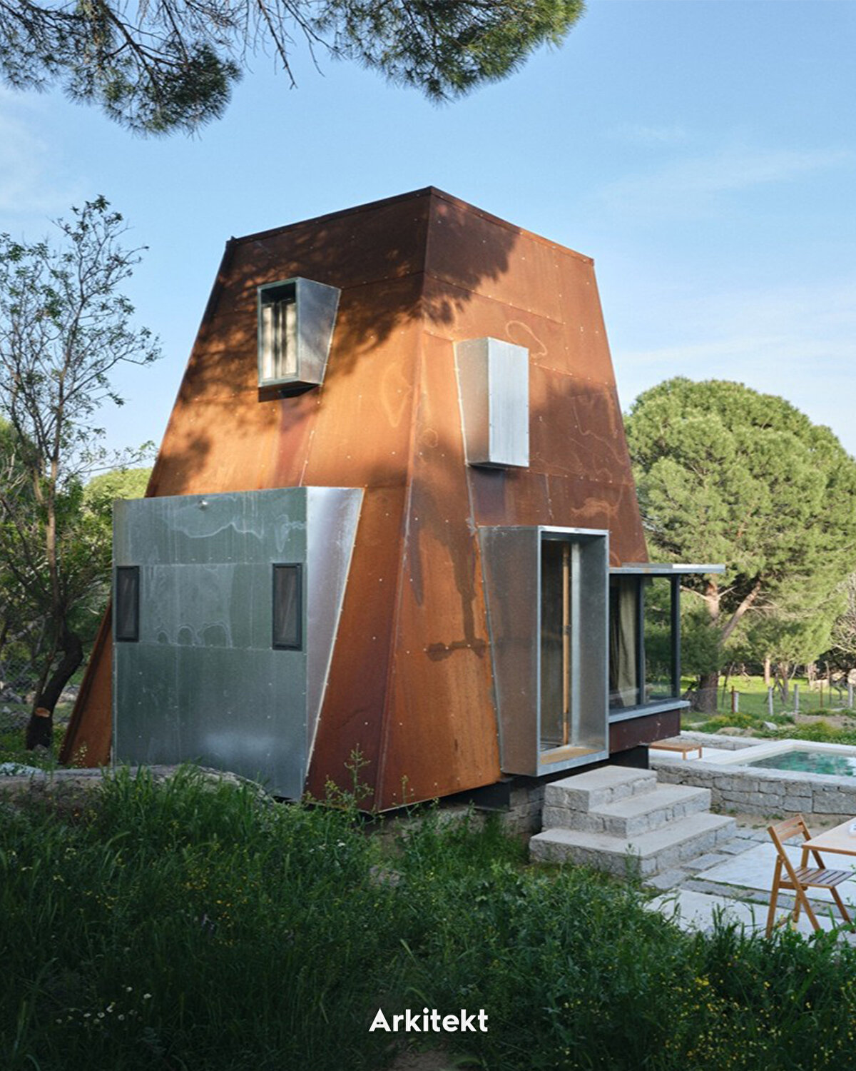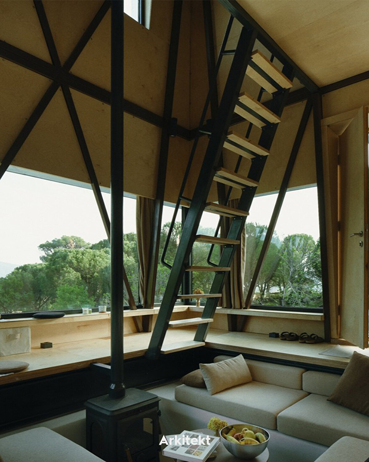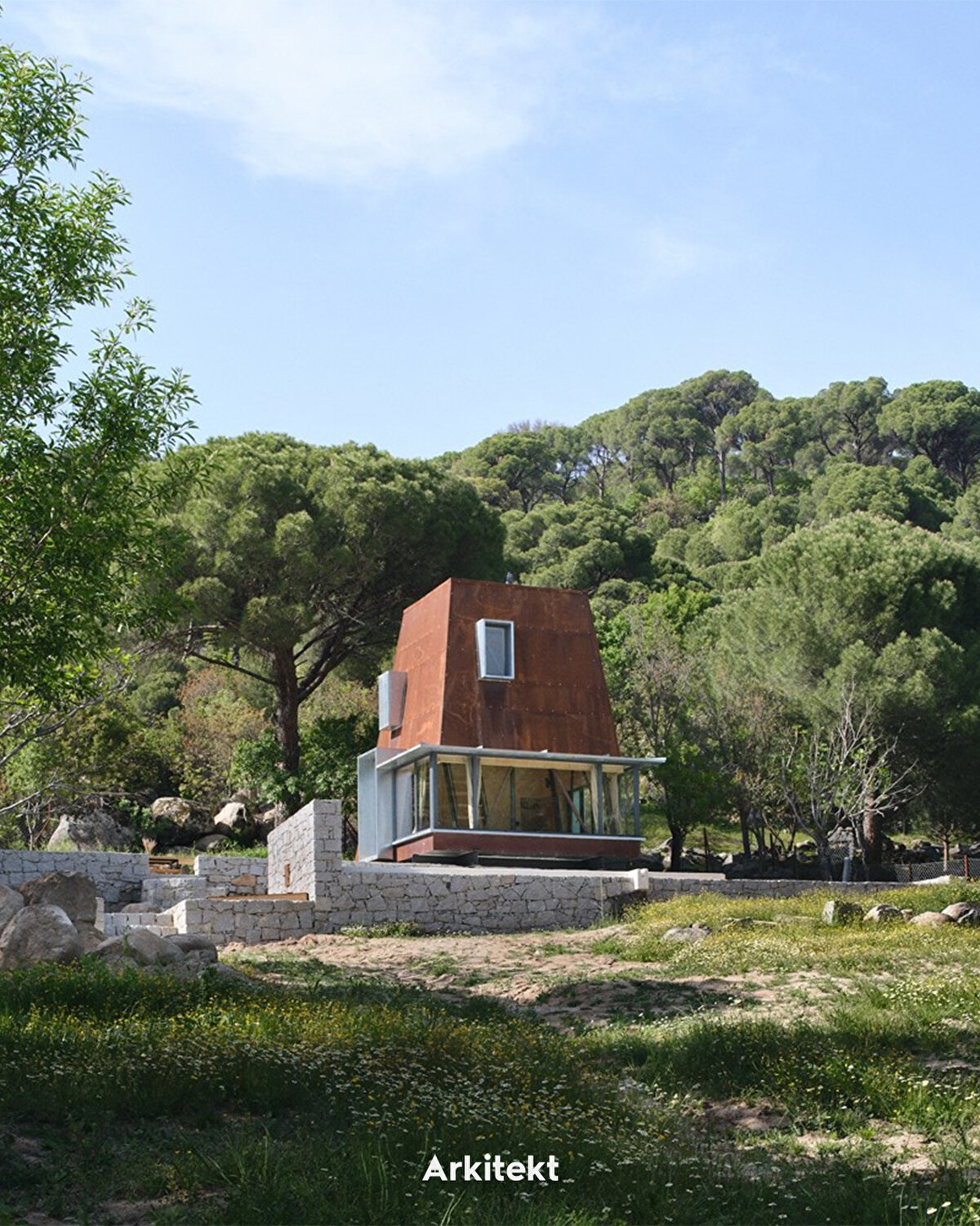 Cabin in the Woods, Bergama Kozak Platosu'na yakın bir köyde kısa süreli konaklama için tasarlanıyor. Yapı, eski bir bağın kuru taş teras duvarlarından birinin üzerine oturuyor ve araziye minimal müdahale ile yerleşiyor. Çelik taşıyıcı sistemi ve Corten çelik kaplaması, yapının çevresinden bilinçli olarak ayrışmasını sağlıyor. Kabin, topografyaya gömülü bir oturma çukuru etrafında şekilleniyor; bu alçaltılmış mekan, ateş etrafında toplanmaya ve mekânı farklı açılardan deneyimlemeye imkân veriyor. Islak hacimler ve diğer fonksiyonlar bu çekirdeğe ekler şeklinde bağlanırken, kabin içindeki asma kat uyuma ve çalışma alanlarını tanımlıyor. Cephedeki yatay kesitler manzarayı çerçevelerken çıkıntılı açıklıklar iç-dış mekân arasında görsel bir bağ kuruyor. - Cabin in the Woods is designed for short-term stays on a hilltop near a village located on the Pergamon Kozak Plateau. The structure sits atop one of the dry stone terrace walls of an old vineyard and is integrated into the landscape with minimal intervention. The steel structural system and Corten steel cladding ensure that the building stands out from its surroundings. The cabin is shaped around a sunken seating pit embedded in the topography; this lowered space allows for gathering around a fire and experiencing the space from different angles. Wet areas and other functions are attached to this core as extensions, while a mezzanine within the cabin defines sleeping and working areas. Horizontal sections on the facade frame the view, and protruding openings create a visual connection between the interior and exterior spaces.