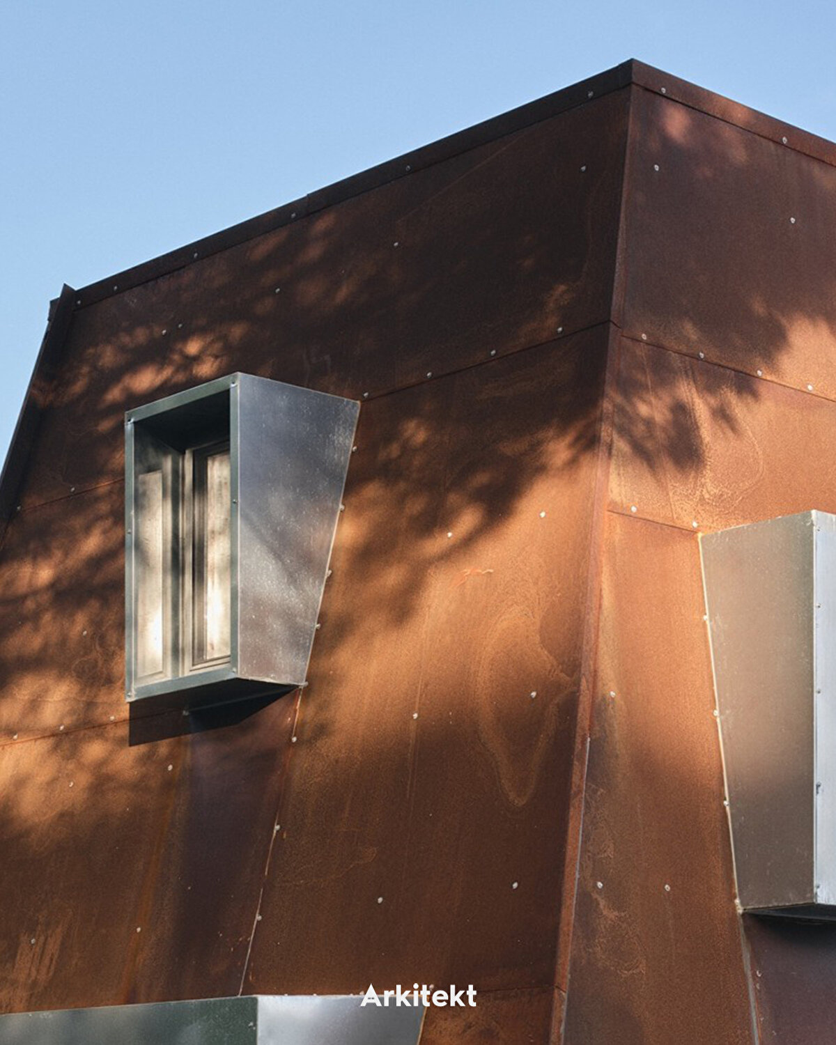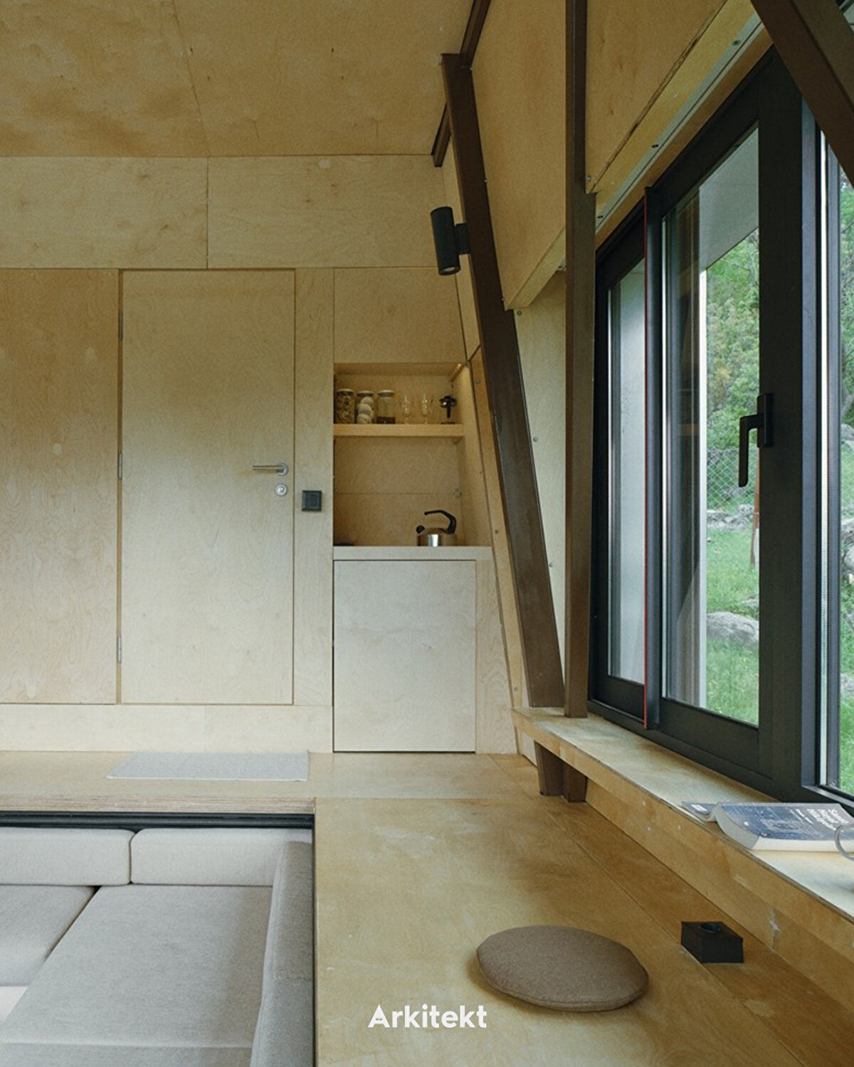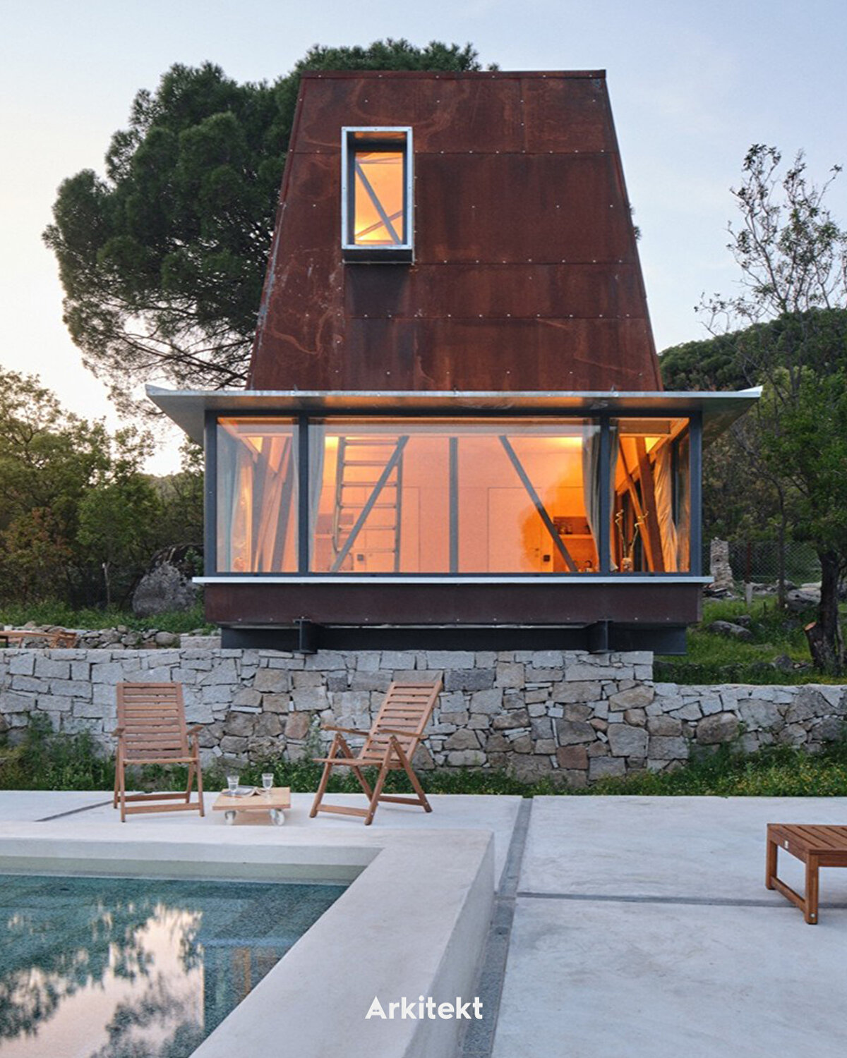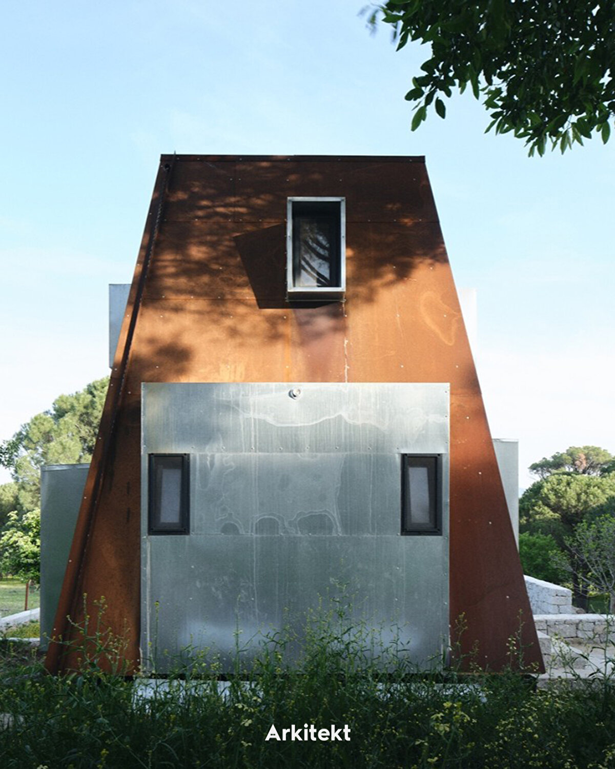 Cabin in the Woods, Bergama Kozak Platosu'na yakın bir köyde kısa süreli konaklama için tasarlanıyor. Yapı, eski bir bağın kuru taş teras duvarlarından birinin üzerine oturuyor ve araziye minimal müdahale ile yerleşiyor. Çelik taşıyıcı sistemi ve Corten çelik kaplaması, yapının çevresinden bilinçli olarak ayrışmasını sağlıyor. Kabin, topografyaya gömülü bir oturma çukuru etrafında şekilleniyor; bu alçaltılmış mekan, ateş etrafında toplanmaya ve mekânı farklı açılardan deneyimlemeye imkân veriyor. Islak hacimler ve diğer fonksiyonlar bu çekirdeğe ekler şeklinde bağlanırken, kabin içindeki asma kat uyuma ve çalışma alanlarını tanımlıyor. Cephedeki yatay kesitler manzarayı çerçevelerken çıkıntılı açıklıklar iç-dış mekân arasında görsel bir bağ kuruyor. - Cabin in the Woods is designed for short-term stays on a hilltop near a village located on the Pergamon Kozak Plateau. The structure sits atop one of the dry stone terrace walls of an old vineyard and is integrated into the landscape with minimal intervention. The steel structural system and Corten steel cladding ensure that the building stands out from its surroundings. The cabin is shaped around a sunken seating pit embedded in the topography; this lowered space allows for gathering around a fire and experiencing the space from different angles. Wet areas and other functions are attached to this core as extensions, while a mezzanine within the cabin defines sleeping and working areas. Horizontal sections on the facade frame the view, and protruding openings create a visual connection between the interior and exterior spaces.
