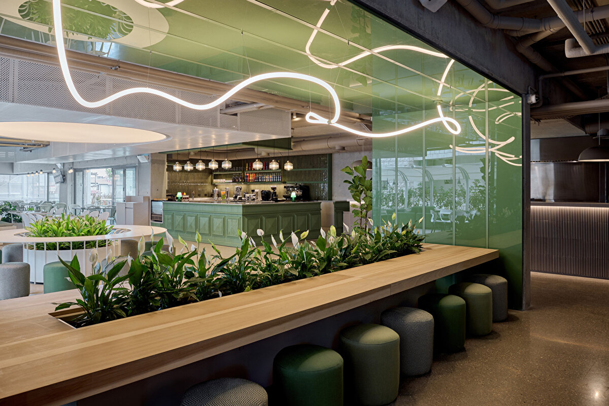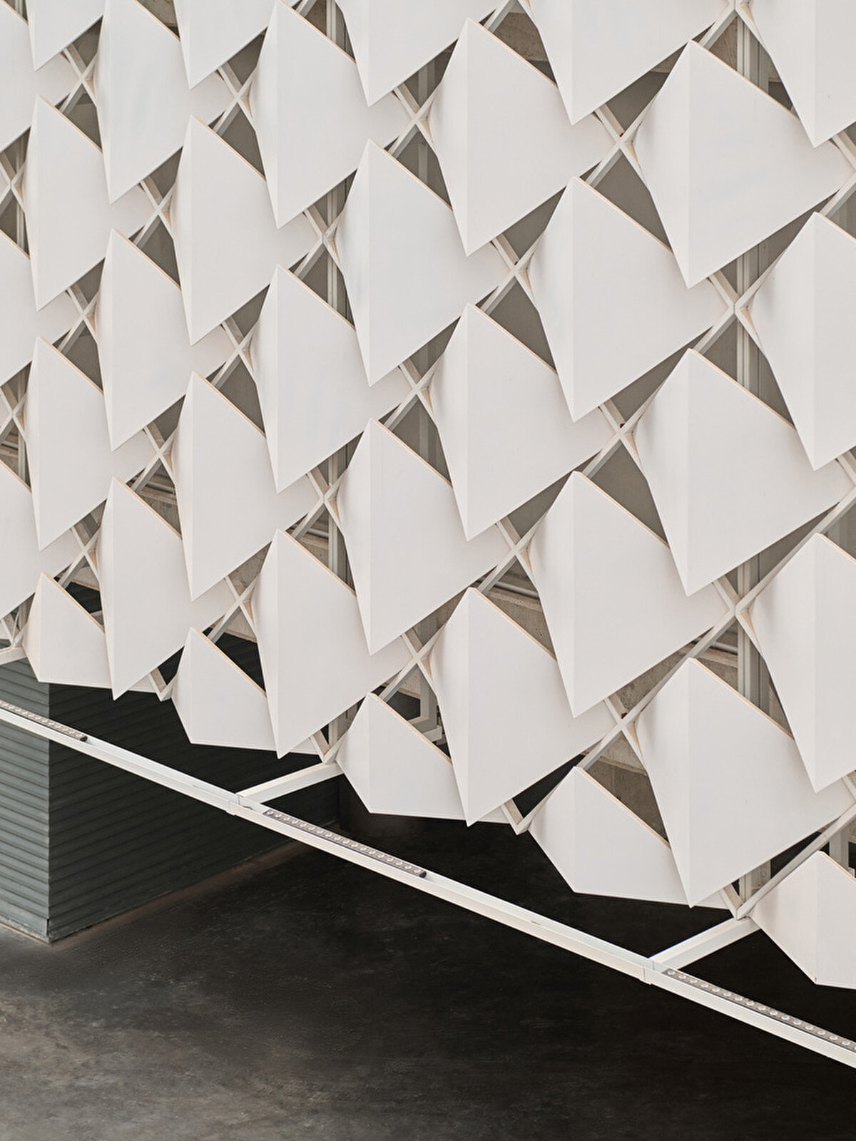 In the façade design, geometric white aluminium panels produced with an algorithmic approach provide privacy, shading and natural ventilation with different permeability rates. Exposed concrete surfaces and visible mechanical systems, combined with metal cladding, emphasise material diversity and functional order. The double-skin façade system supports energy efficiency through insulation, solar control and passive climate control strategies.