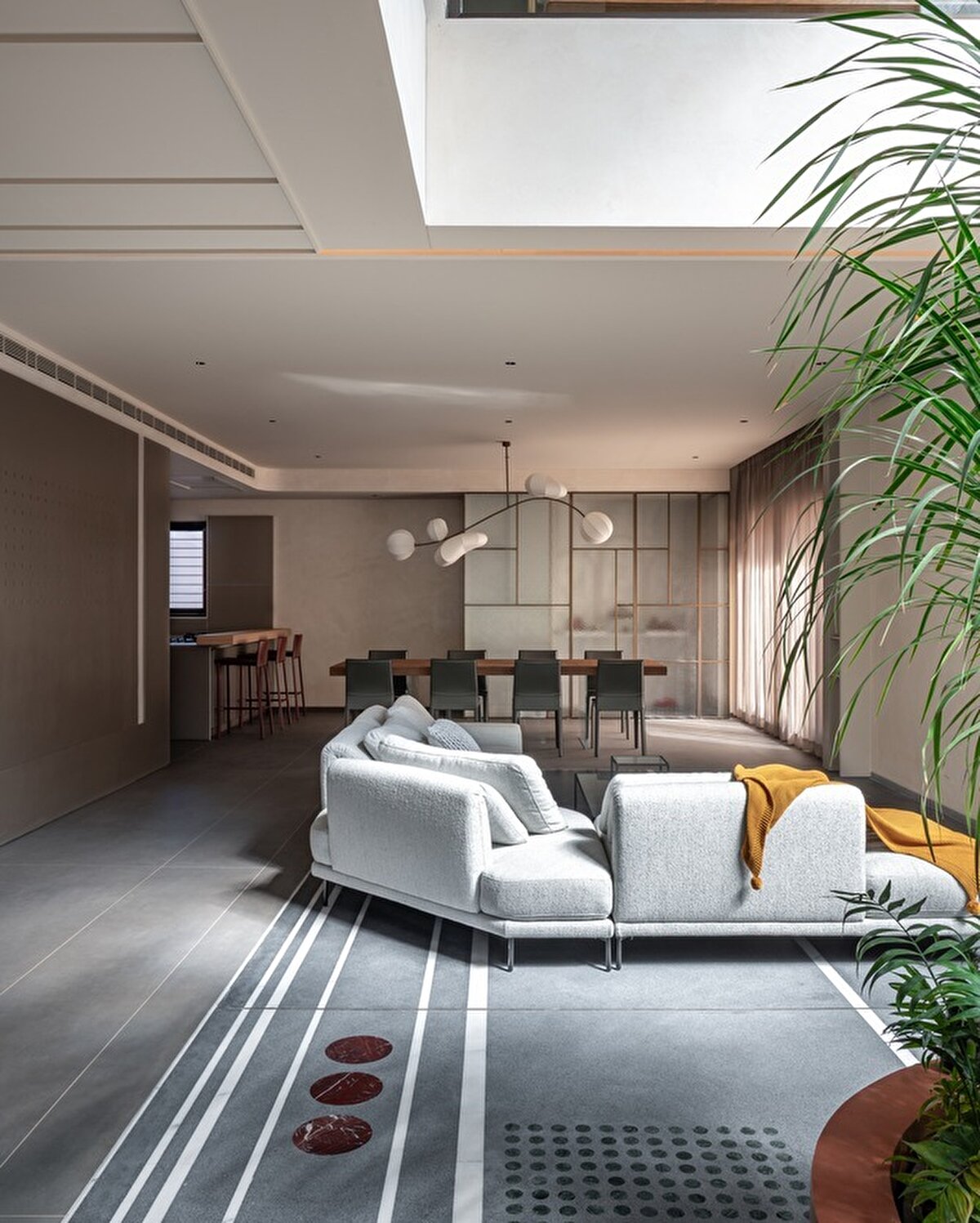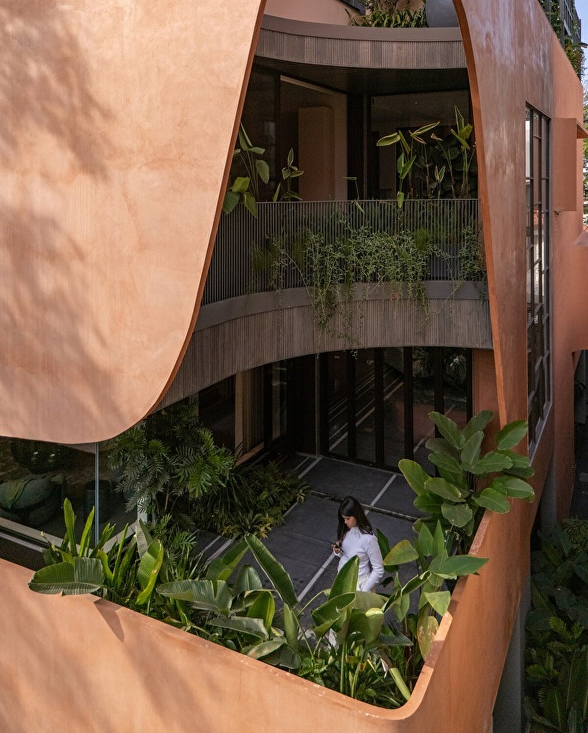 Bhurat Residence, yoğun şehir dokusuna rağmen, iç mekanlarda ışık ve açıklık hissini artıracak şekilde tasarlanıyor ve yapıda yeşil alan öncelik olarak ele alınıyor. Ferroçimento (ferrocement) cephe, heykelsi kıvrımlarıyla asma bahçeyi çerçeveliyor; bu sayede hem gölge oyunları oluşuyor hem de binaya doğal hava ve ışık akışı sağlanıyor. İç mekân, yaşam, yemek ve özel alanlar arasında kesintisiz bir akış sunacak şekilde düzenleniyor. İç avluda kullanılan terrazzo zemin, dış mekâna kadar devam ediyor ve iç-dış bağlantısını güçlendiriyor. Çift katlı iç avlu ile farklı seviyeler arasında görsel ve mekânsal ilişkiler oluşturuyor. - Bhurat Residence is designed to enhance the feeling of light and openness in its interior spaces despite the dense urban fabric, with green areas prioritized in the structure. The ferrocement facade frames the hanging garden with its sculptural curves, creating shadow play while allowing natural air and light to flow into the building. The interior is arranged to offer a seamless flow between living, dining, and private areas. The terrazzo flooring used in the inner courtyard extends to the exterior, strengthening the connection between inside and outside. The double-height inner courtyard creates visual and spatial relationships between different levels.