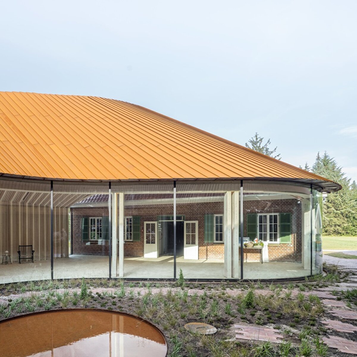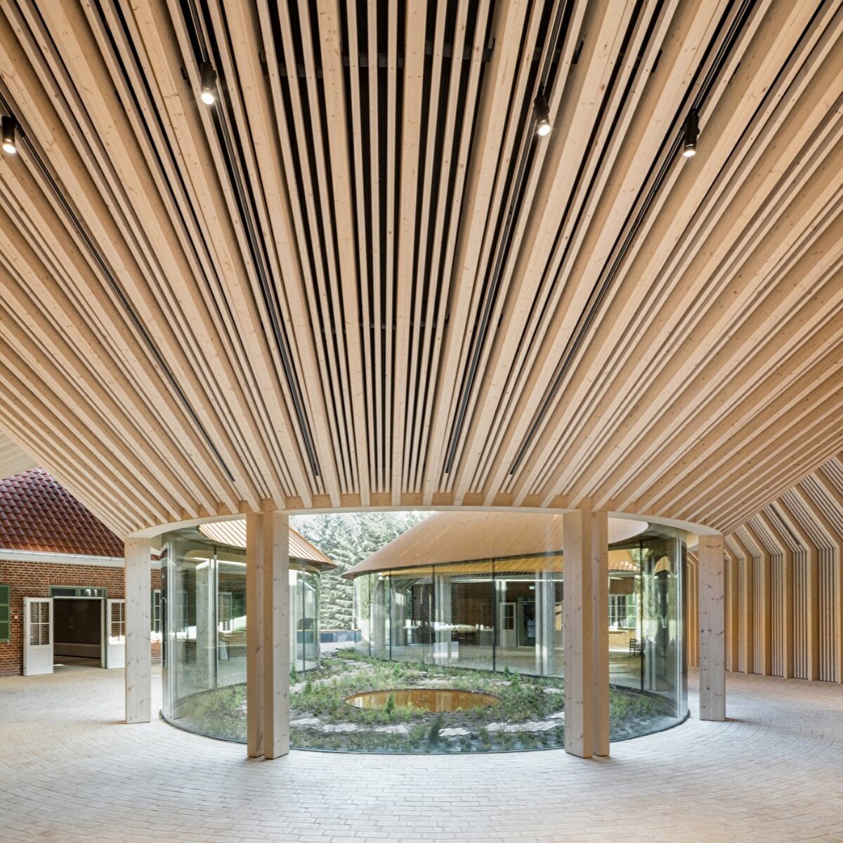 İki lineer hastane yapısını eğrisel bir formda 500 m2'lik bir alanla birleştiren BIG'in tasarımı, cadde aksından gelen ziyaretçiler için davetkar bir yaklaşım sunuyor. Tavandan tabana uzanan kavisli camlar, yeşil avluya ve eskiden mülteci kampının bulunduğu orman manzarasına açılıyor. Avlu, müze kanatlarında ziyarete devam etmeden önce konukların deneyimleyebileceği bir lobi veya geçici bir sergi alanı olarak kullanılıyor.