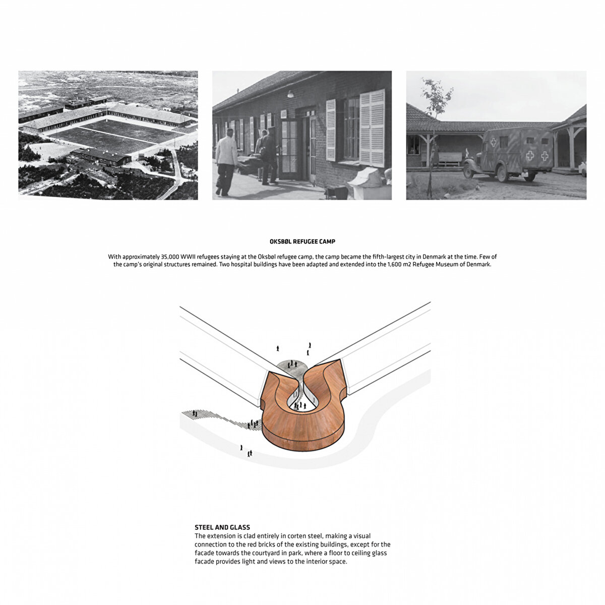 Located on the site of Denmark's largest World War II refugee camp and situated in the west, this building functions as the Refugee Museum of Denmark (FLUGT) with its renovated buildings and the annex connecting these buildings.