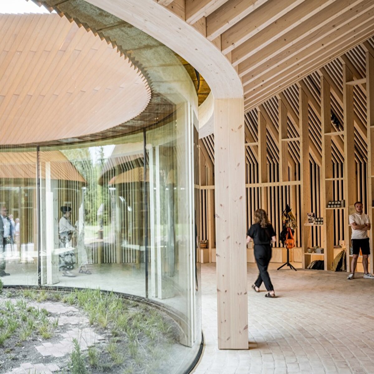 BIG's design, which combines two linear hospital buildings in a curvilinear form with a 500 m2 space, offers an inviting approach for visitors coming from the street axis. Floor-to-ceiling curved glazing opens onto the green courtyard and the view of the forest where the refugee camp used to be located. The courtyard is used as a lobby or temporary exhibition space for guests to experience before continuing their visit in the museum wings.