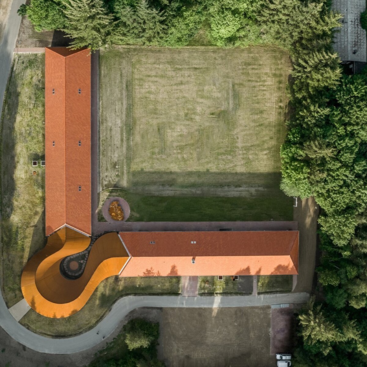 BIG connected two renovated former hospital buildings with a curved extension for a museum for refugees in Oksbøl, Denmark. @big_builds @bjarkeingels