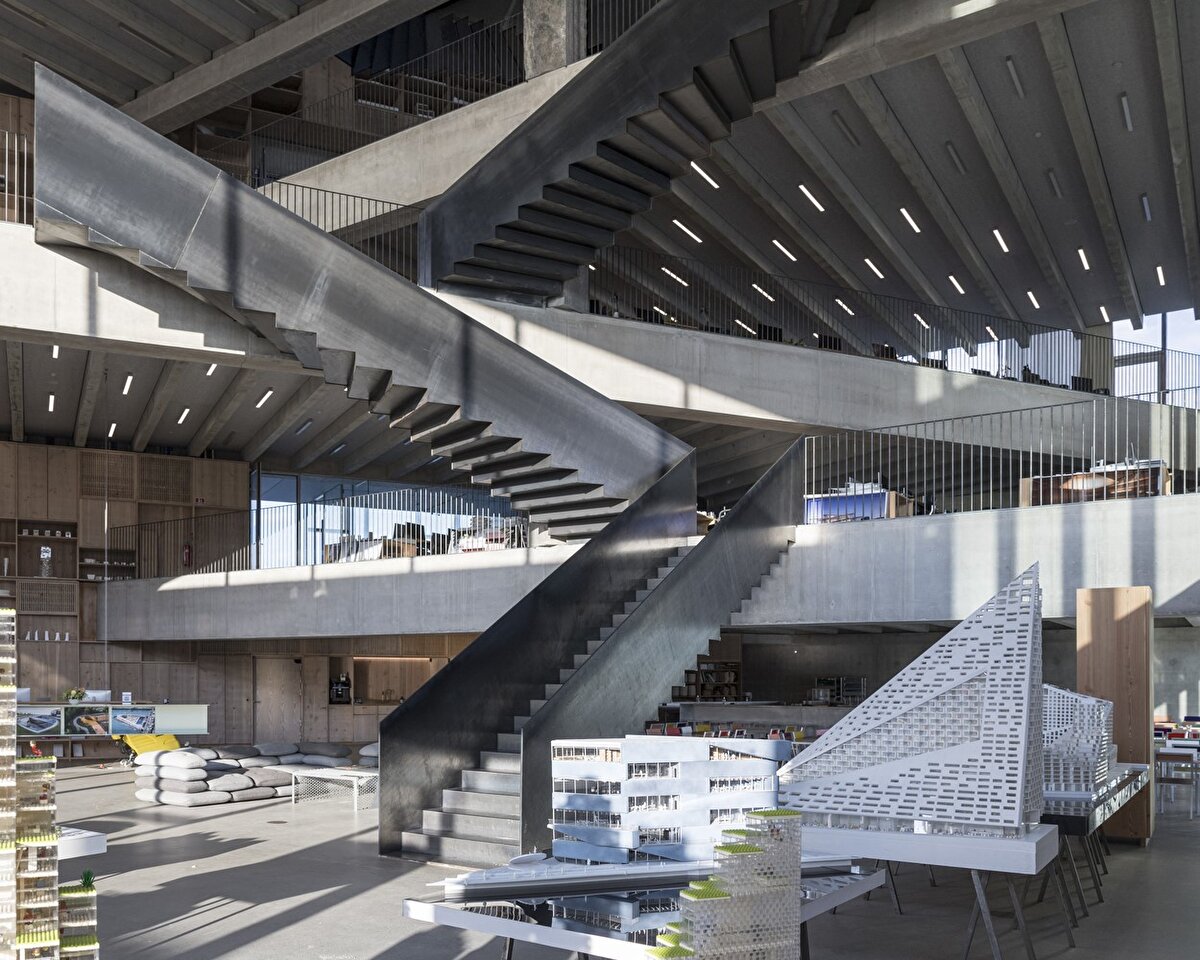 Binanın geniş cam cephesi, iç mekândaki alanların yedi kat boyunca çarpraz bir şekilde açık kalmasına olanak tanırken, siyah çelikten yapılmış zikzak şeklindeki merkez merdiven, mekânda dikey bir akış hissi oluşturuyor. Kuzey cephede konumlanan asansör ve ikincil merdiven boşluğu, iç mekândaki çalışma alanlarını güneş ışığı ile doldurarak aydınlık ve ferah bir ortam sunuyor.