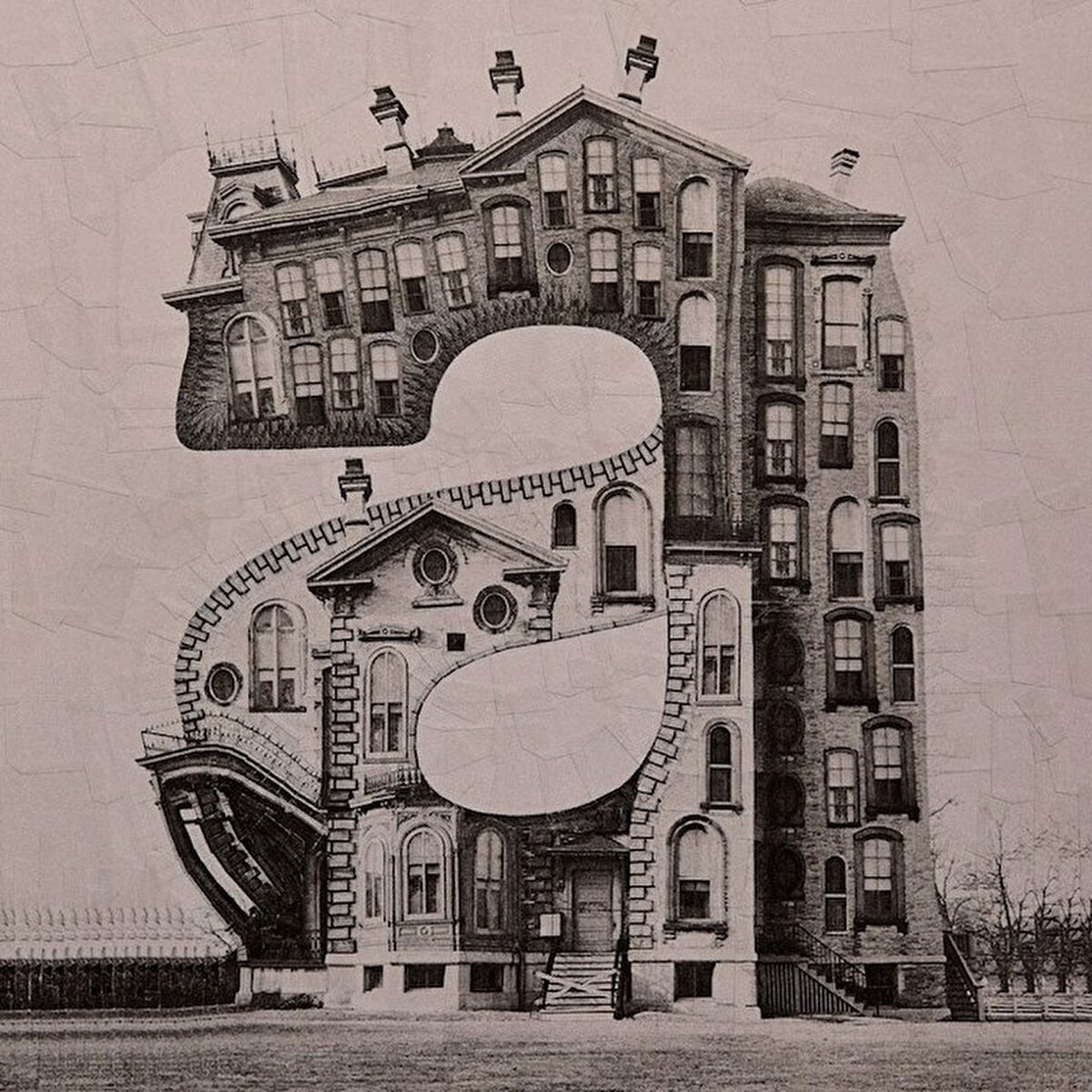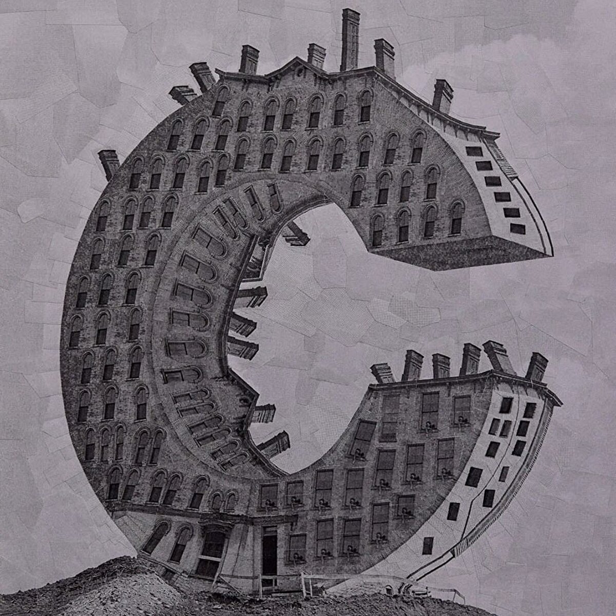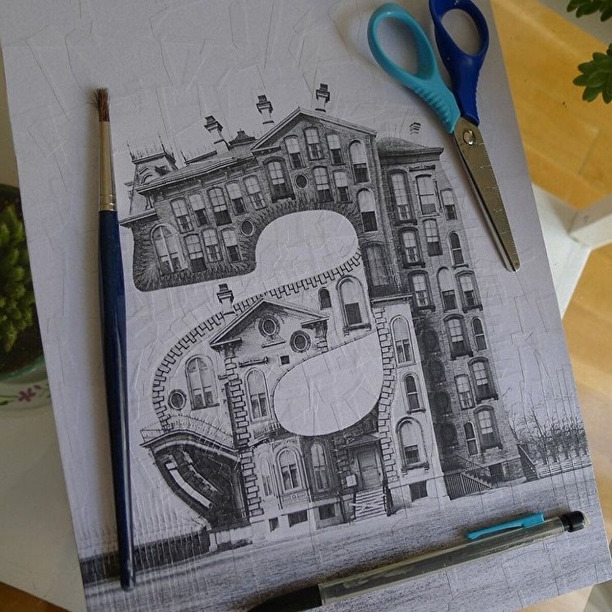 Kolaj tekniğiyle yaptığı çalışmalarında her harf başka bir yapı oluştururken, harflerin geometrileri ise oluşturdukları yapıların karakterlerini belirliyor.
