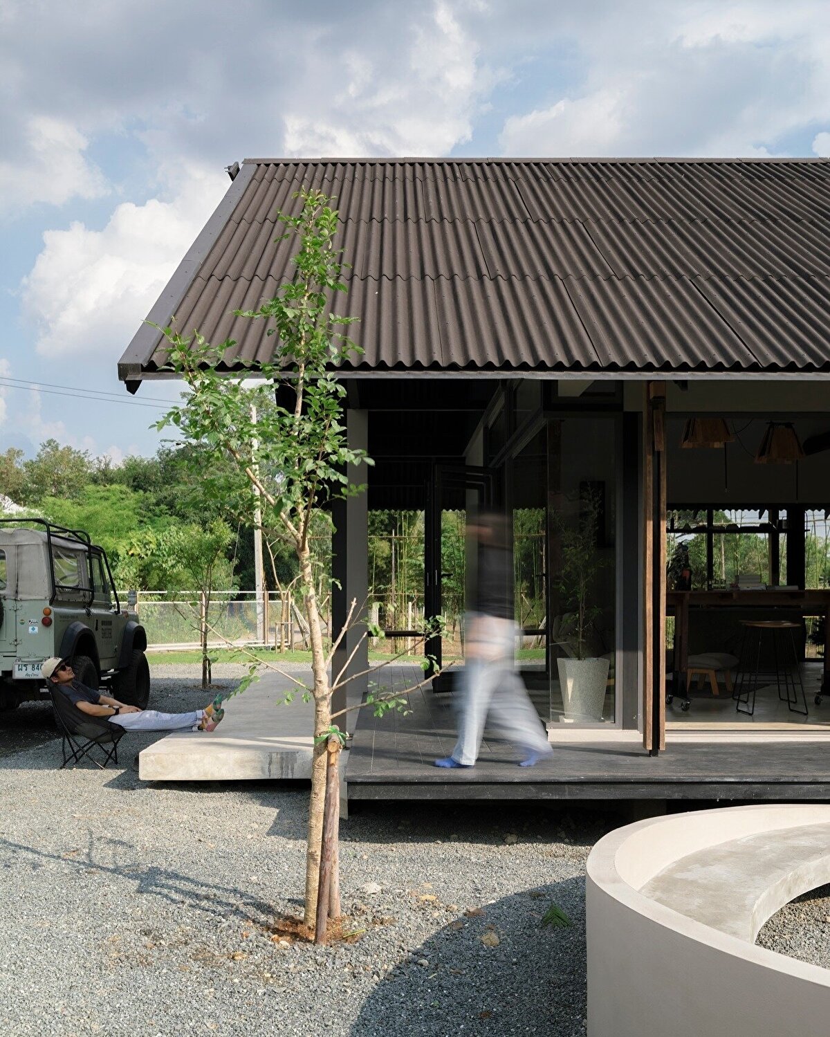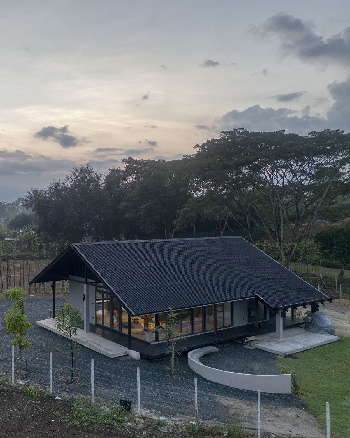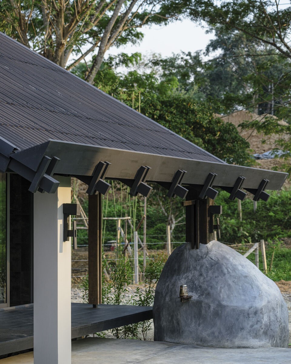 Tayland'ın tropikal iklimine uygun olarak tasarlanan yapı, geniş saçaklarıyla güneş ışığını engelleyerek iç mekânın serin kalmasını sağlıyor. Siyah renkli çatı, çevredeki doğal manzarayla uyumlu olacak şekilde seçiliyor ve yansımaları minimize etmek amacıyla düşünülüyor. Bu seçim, yapının çevresiyle bütünleşmesini ve komşuların deneyimini olumsuz etkilememesini hedefliyor.