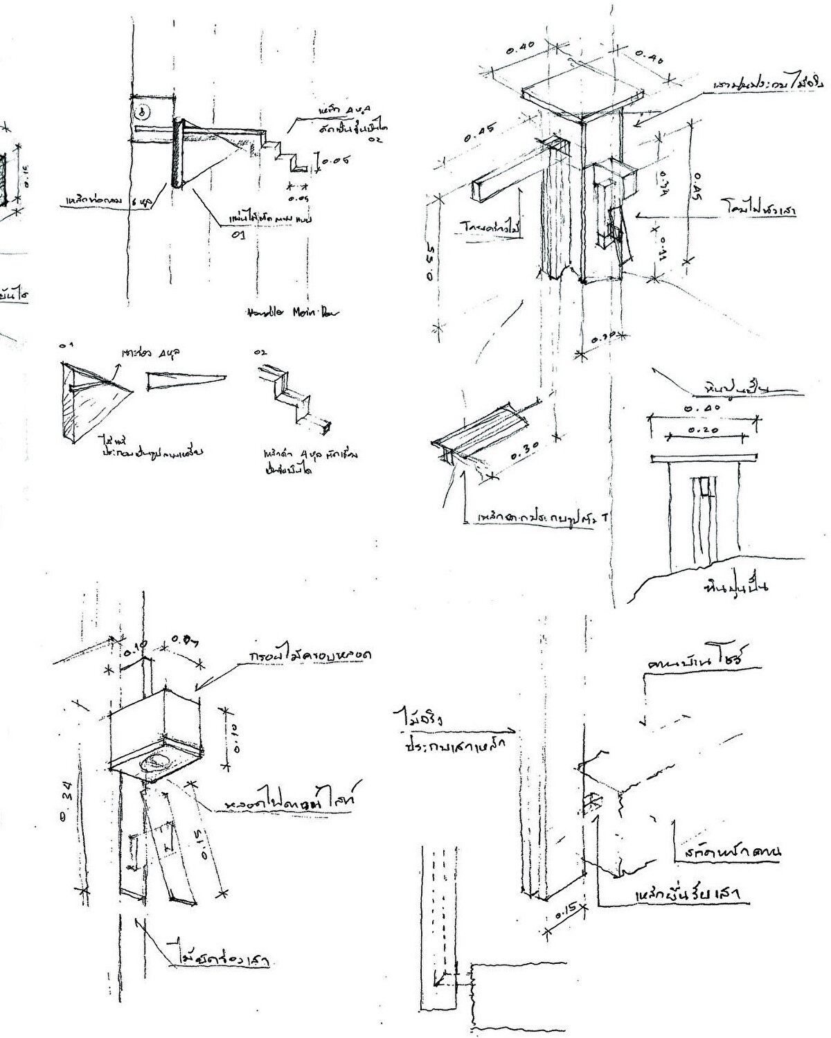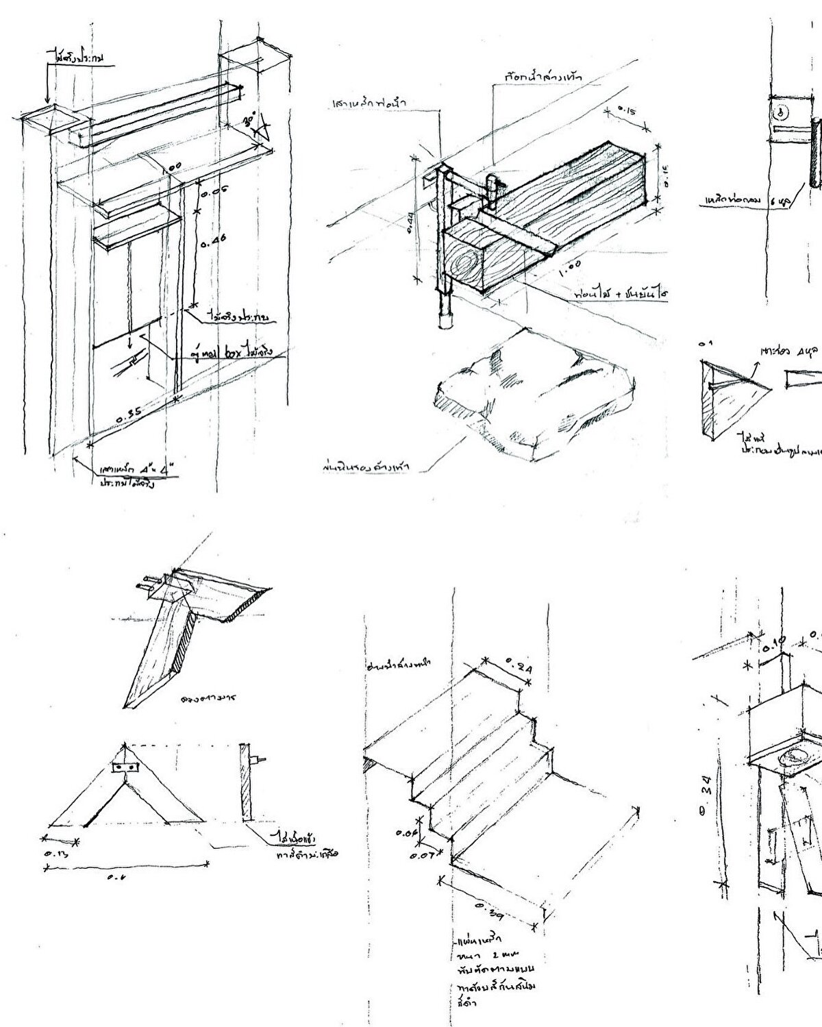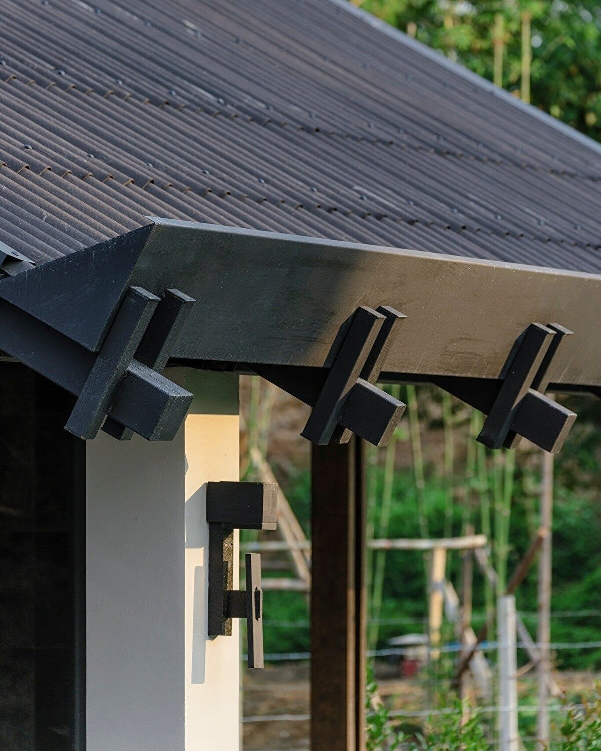 Tayland'ın tropikal iklimine uygun olarak tasarlanan yapı, geniş saçaklarıyla güneş ışığını engelleyerek iç mekânın serin kalmasını sağlıyor. Siyah renkli çatı, çevredeki doğal manzarayla uyumlu olacak şekilde seçiliyor ve yansımaları minimize etmek amacıyla düşünülüyor. Bu seçim, yapının çevresiyle bütünleşmesini ve komşuların deneyimini olumsuz etkilememesini hedefliyor.